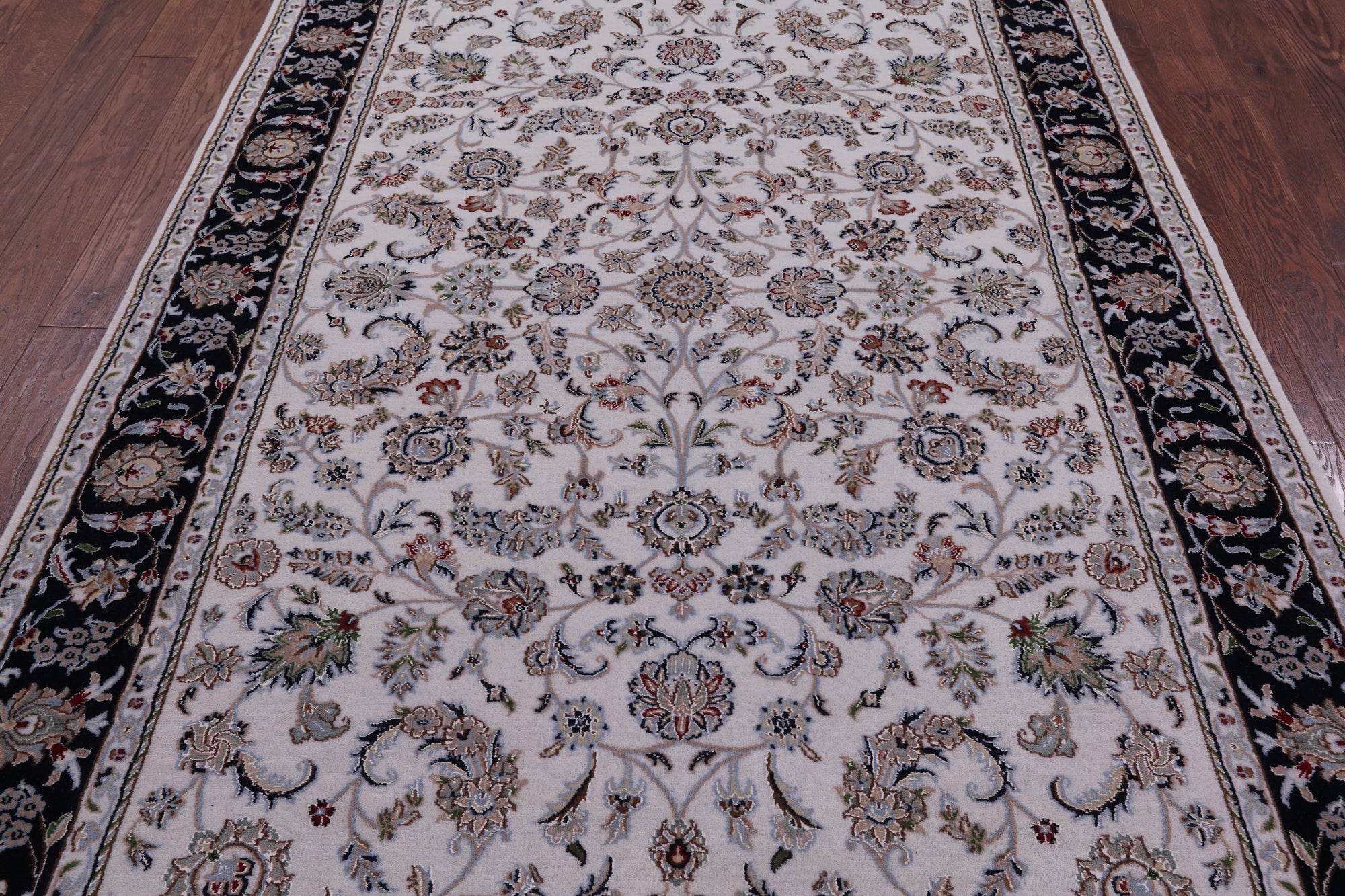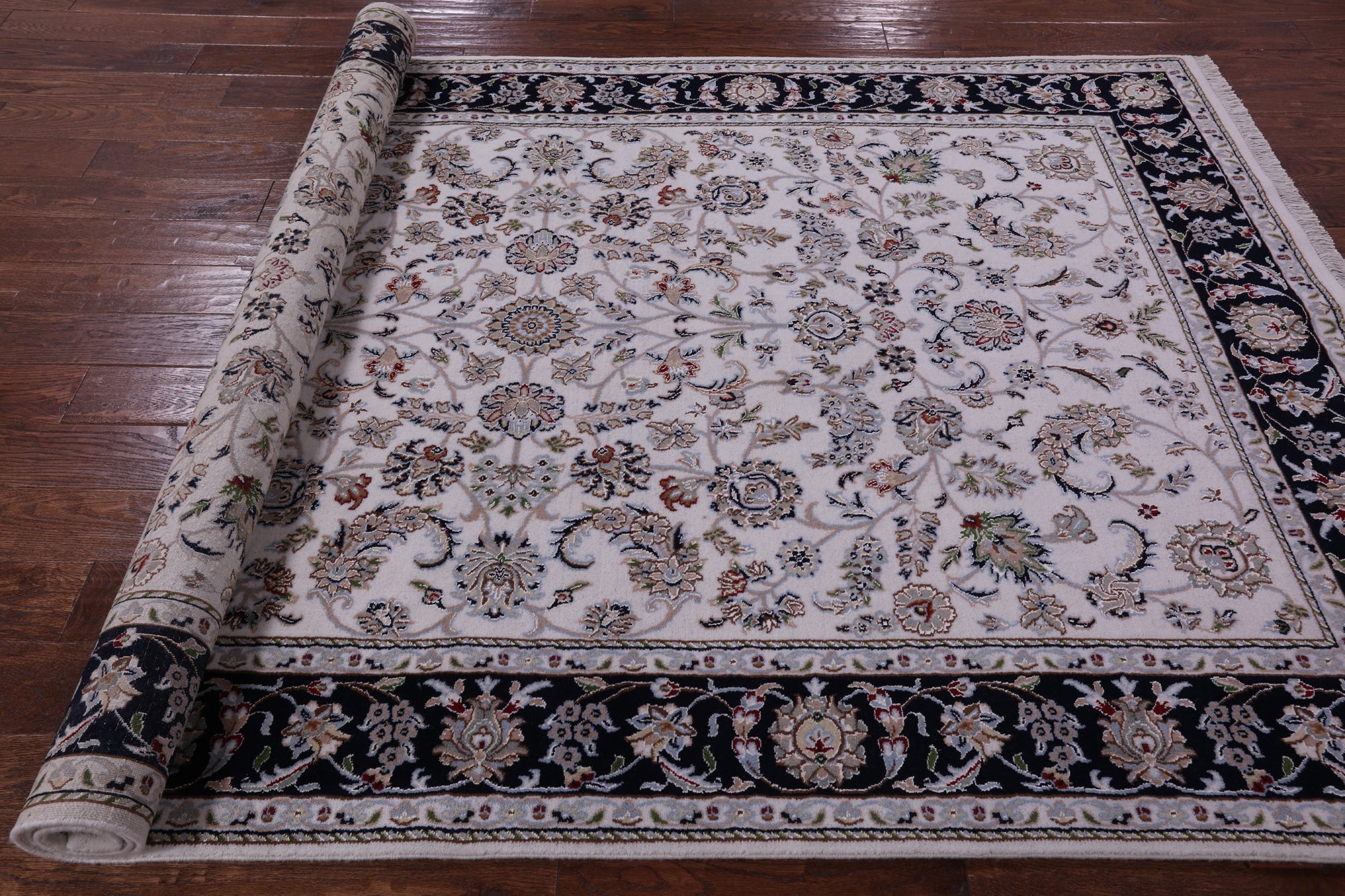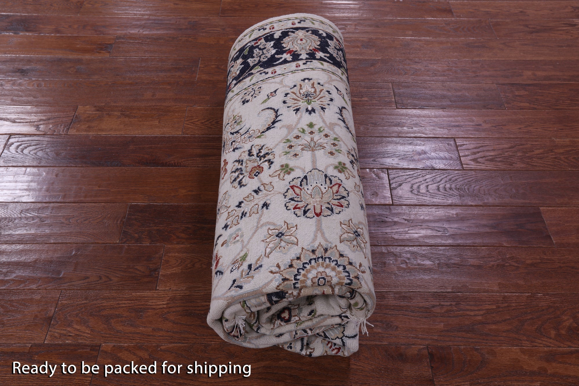 Ivory/Navy Blue Border 5' 10" X 9' 1" Wool & Silk Persian Nain Handmade Rug - Q14765 is backordered and will ship as soon as it is back in stock.