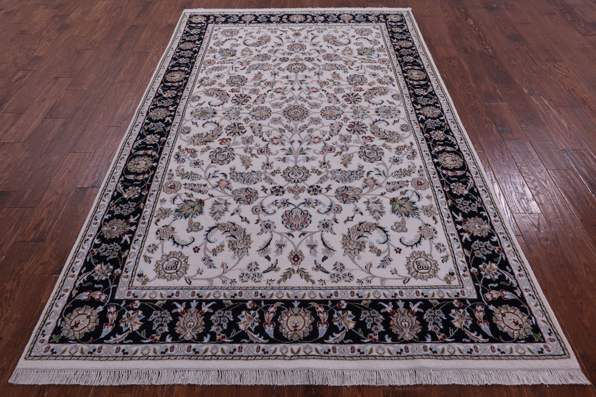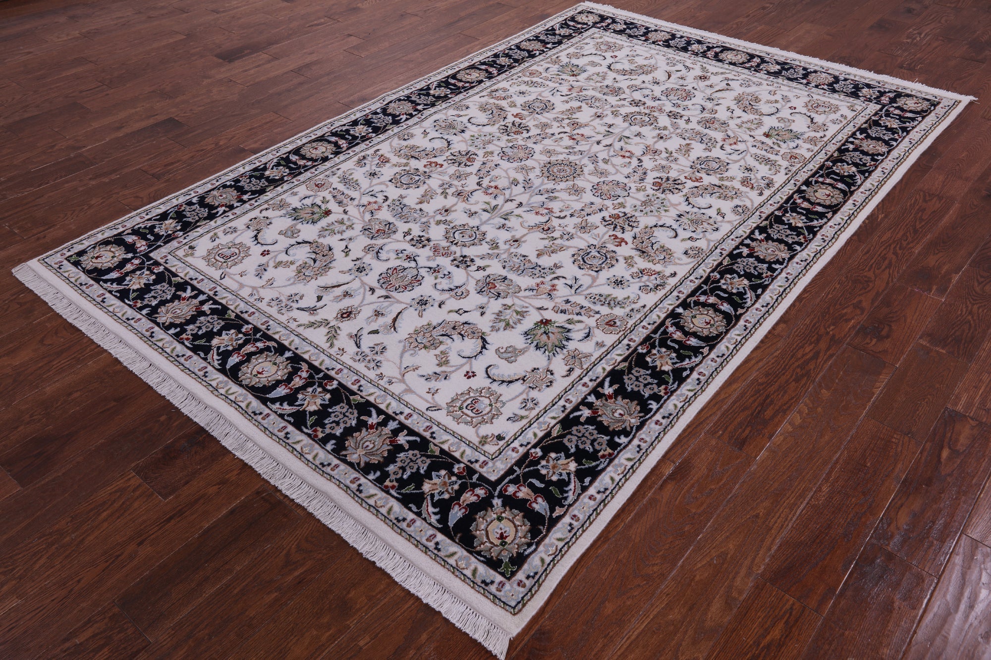 Ivory/Navy Blue Border 5' 10" X 9' 1" Wool & Silk Persian Nain Handmade Rug - Q14765
