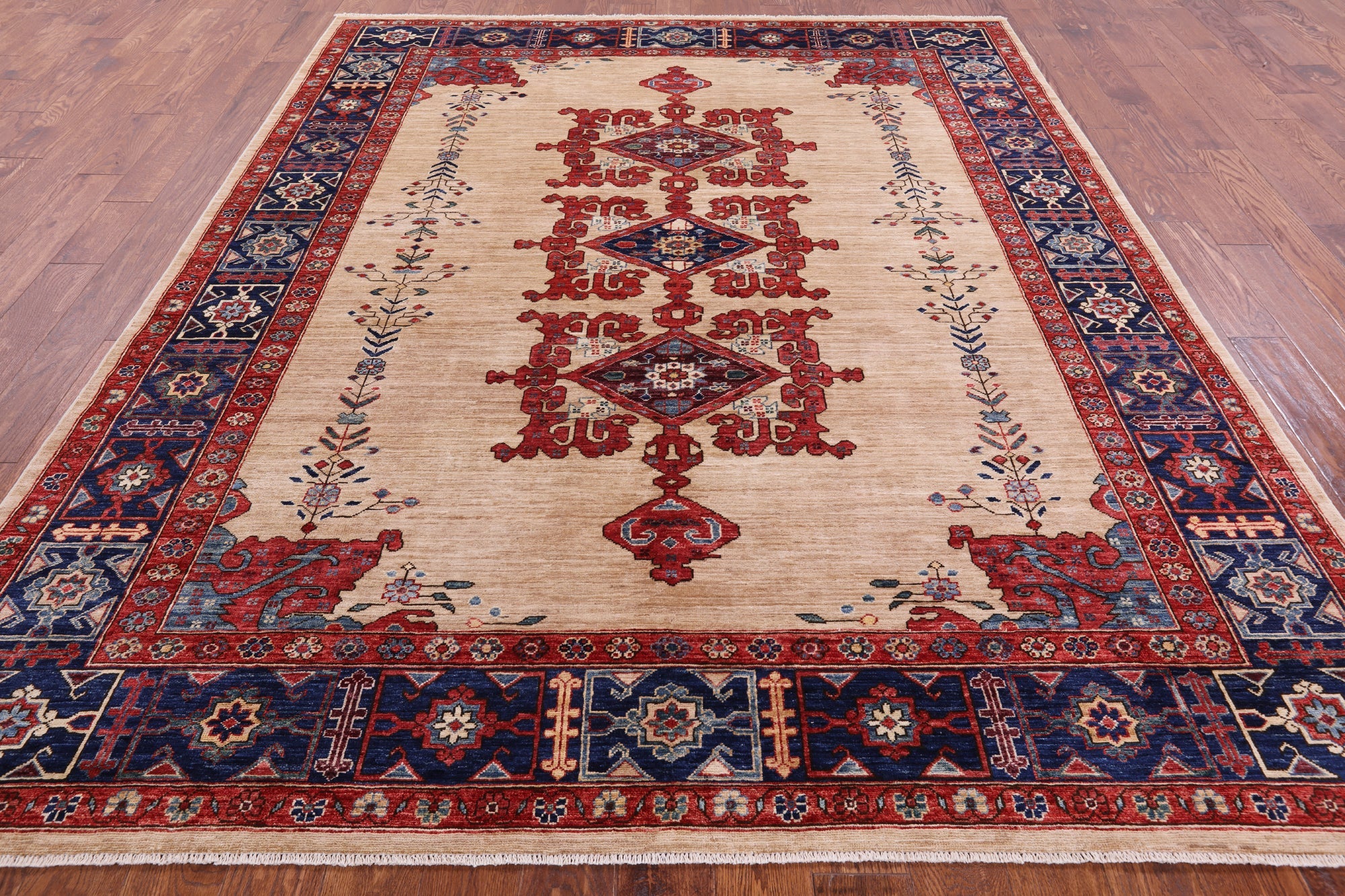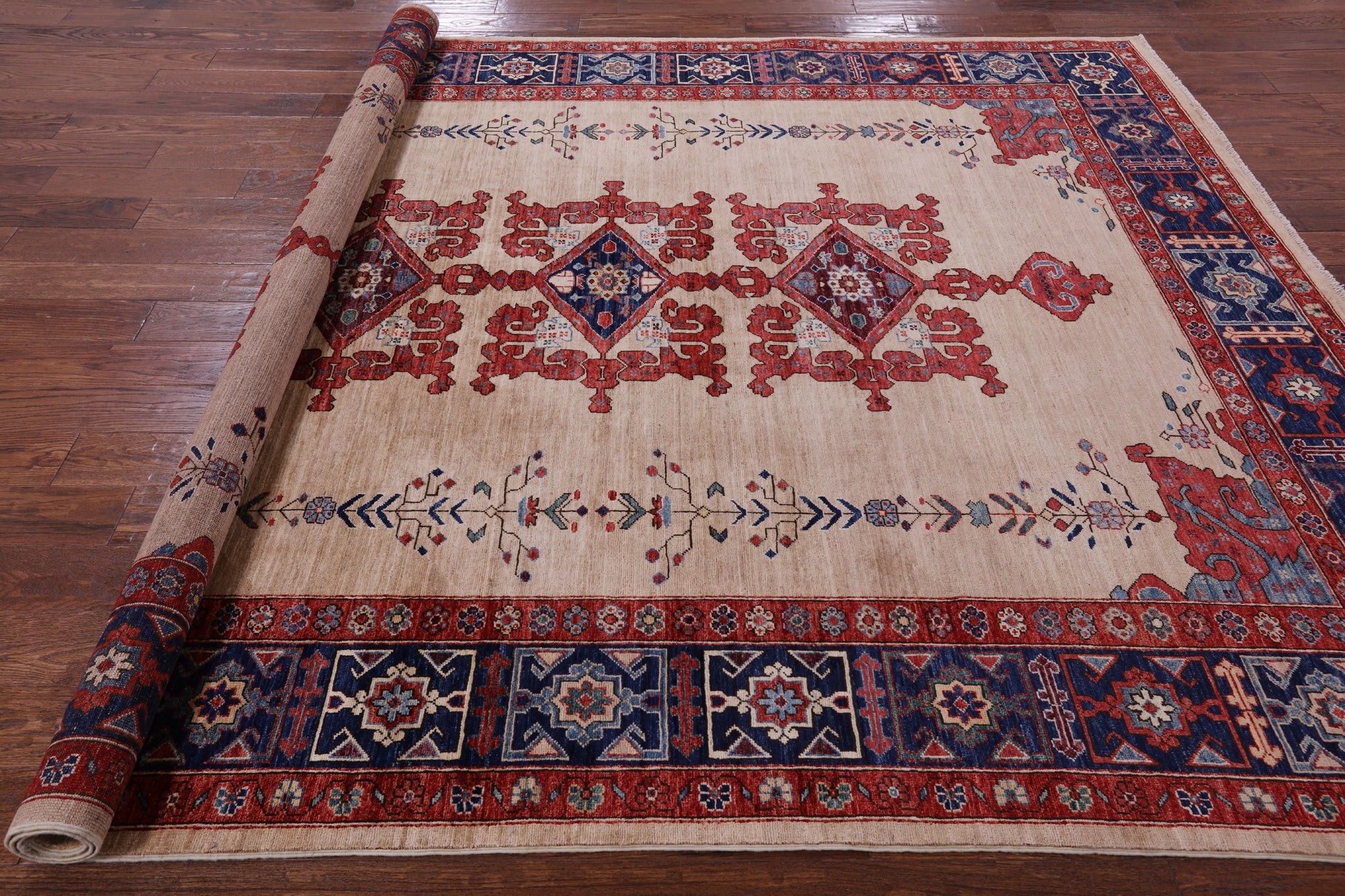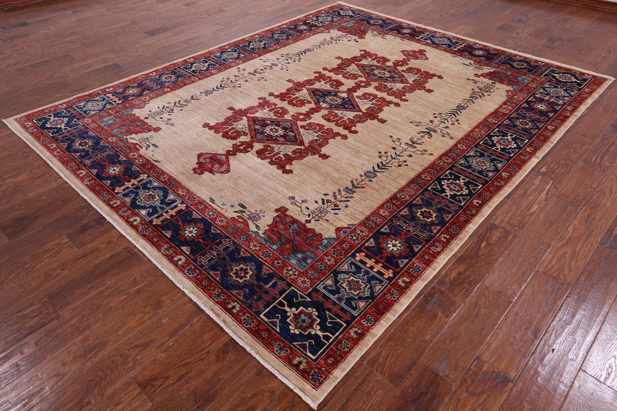 Heriz, Serapi rugs are well known for their bold and angular designs. Many being symmetric, they withhold boldly done geometric and floral-inspired shapes. These shapes are brought out with rich reds, blues, greens, and yellows contrasted against ivory. Heriz, Serapi rugs are very elegant and durable, perfect for a variety of different rooms and spaces within a home.