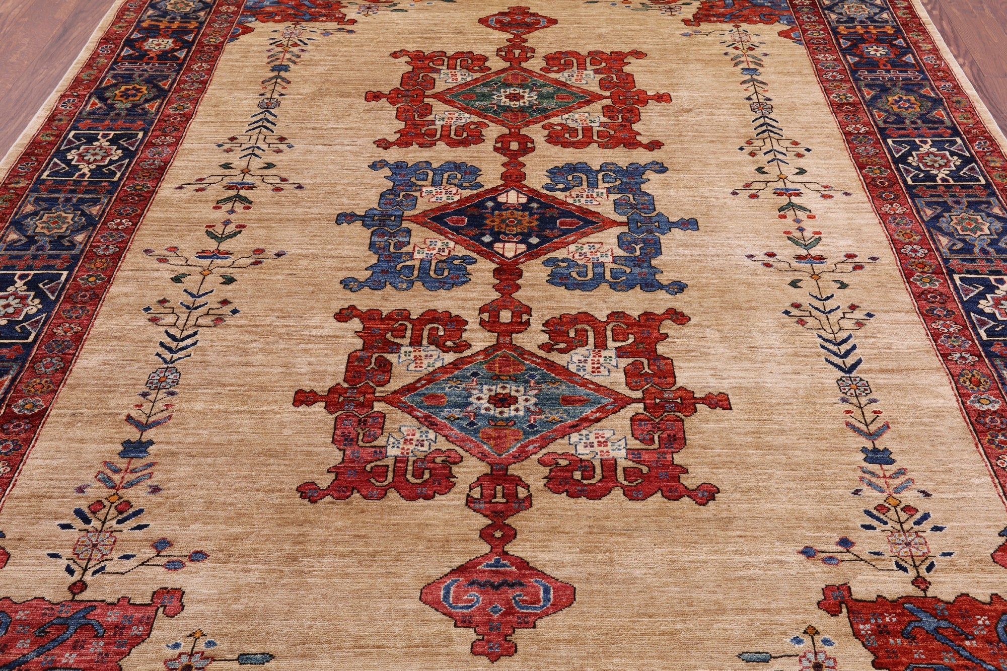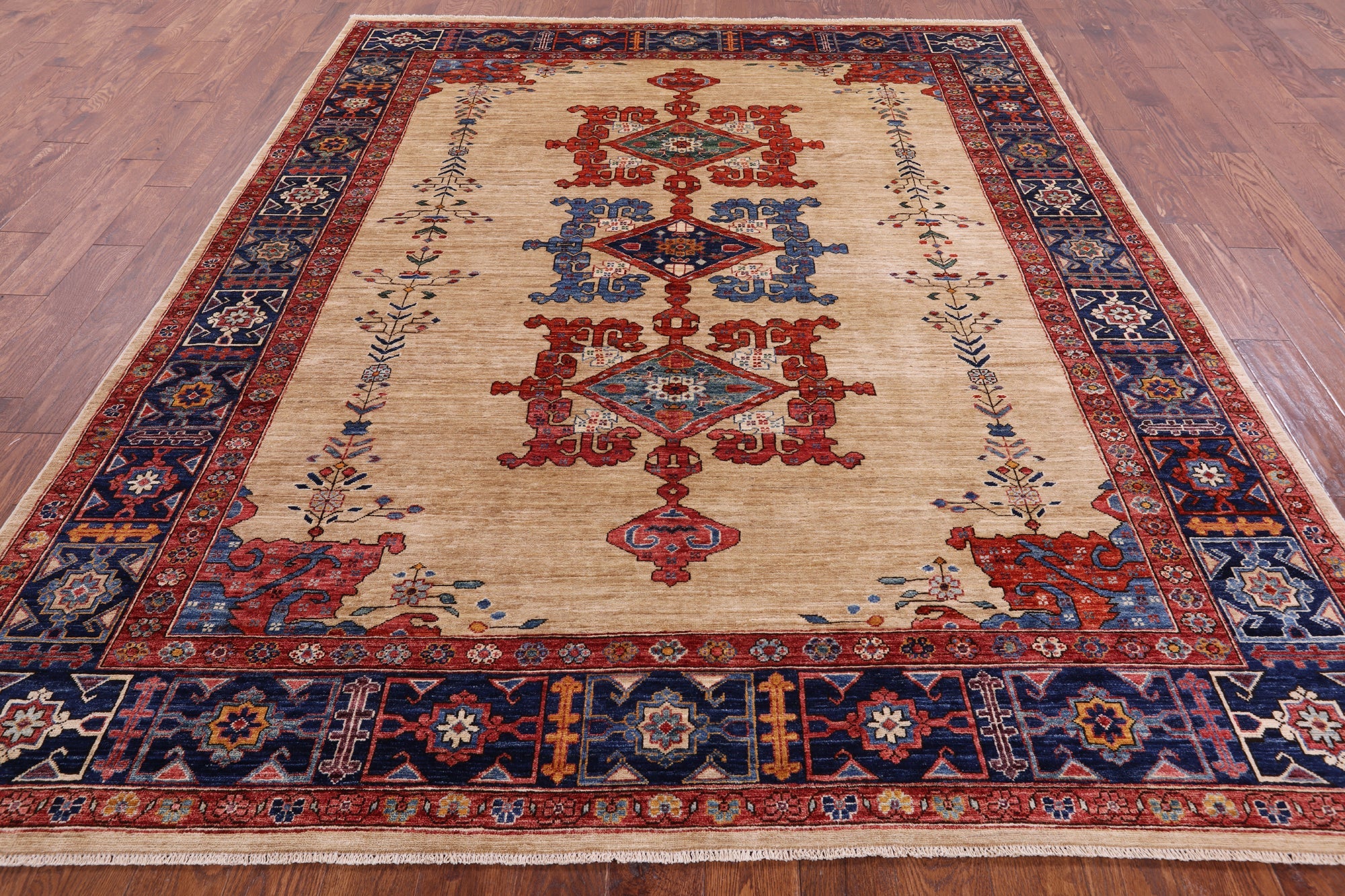 Heriz, Serapi rugs are well known for their bold and angular designs. Many being symmetric, they withhold boldly done geometric and floral-inspired shapes. These shapes are brought out with rich reds, blues, greens, and yellows contrasted against ivory. Heriz, Serapi rugs are very elegant and durable, perfect for a variety of different rooms and spaces within a home.