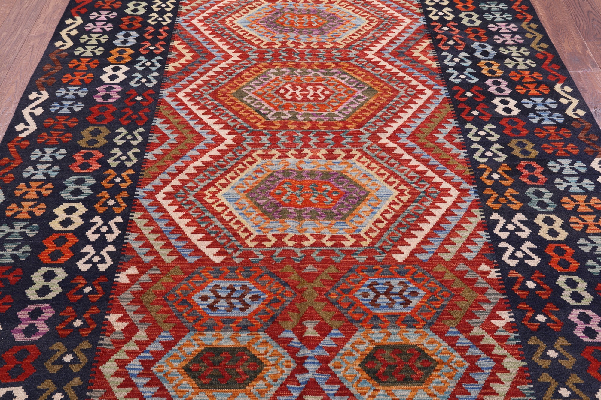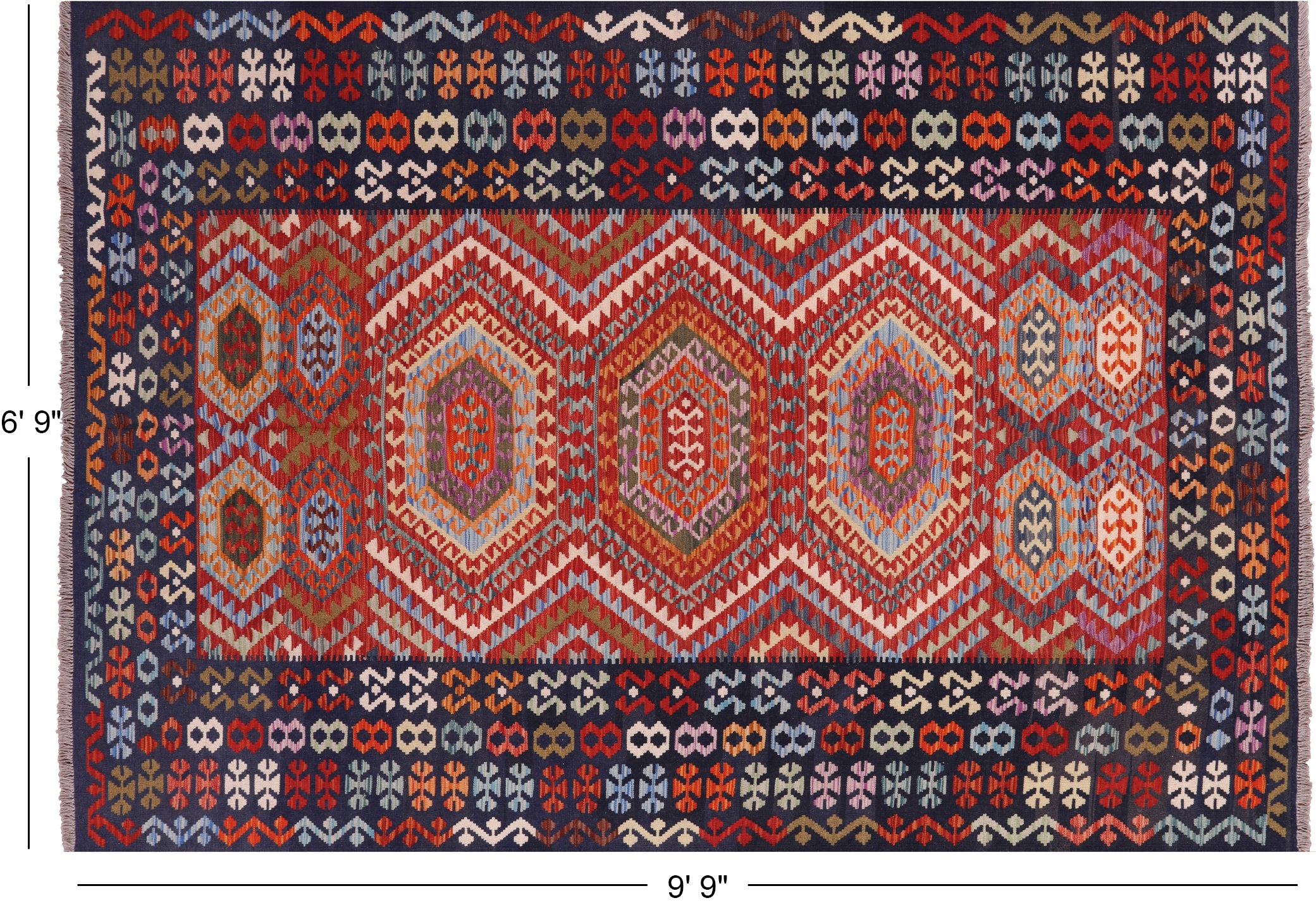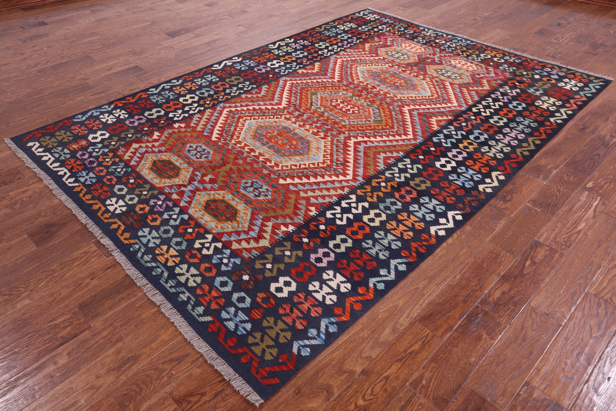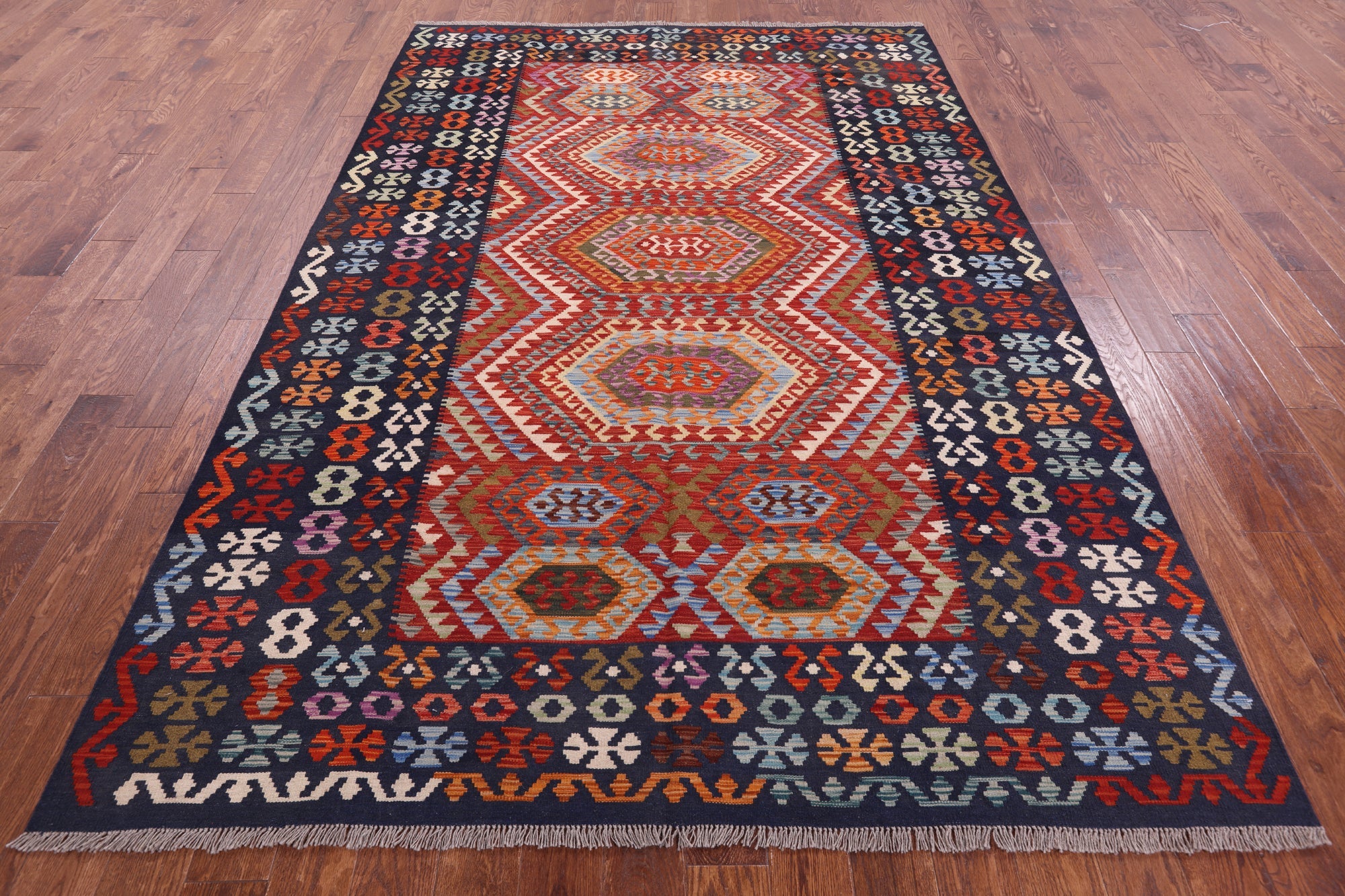 Kilim Flat Weave Reversible Wool On Wool Rug 6' 9" X 9' 9" - Q9464 is backordered and will ship as soon as it is back in stock.