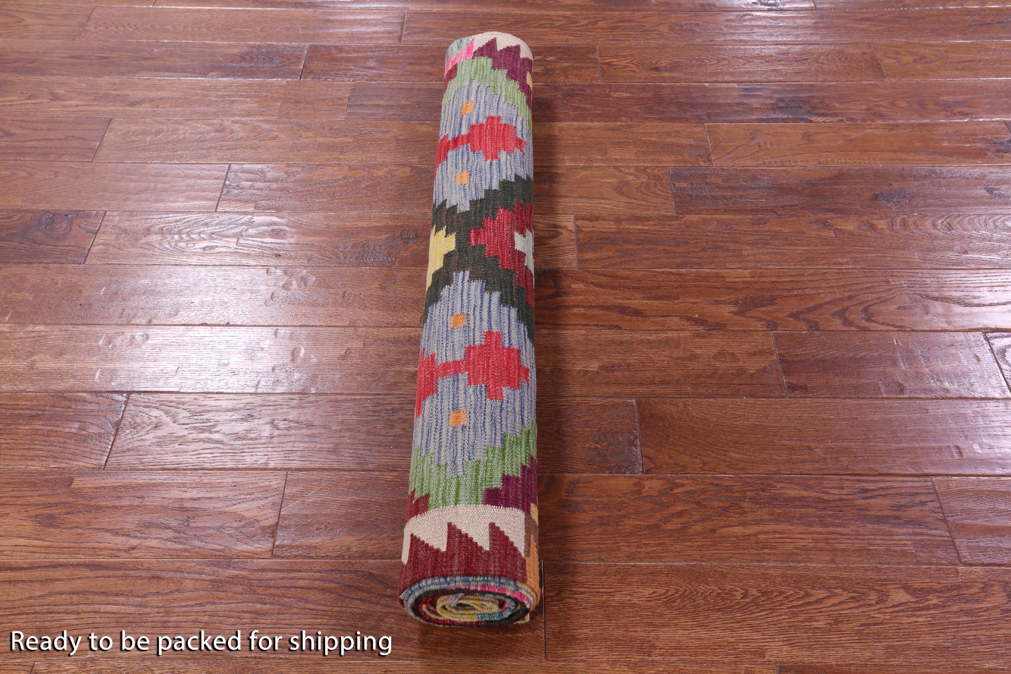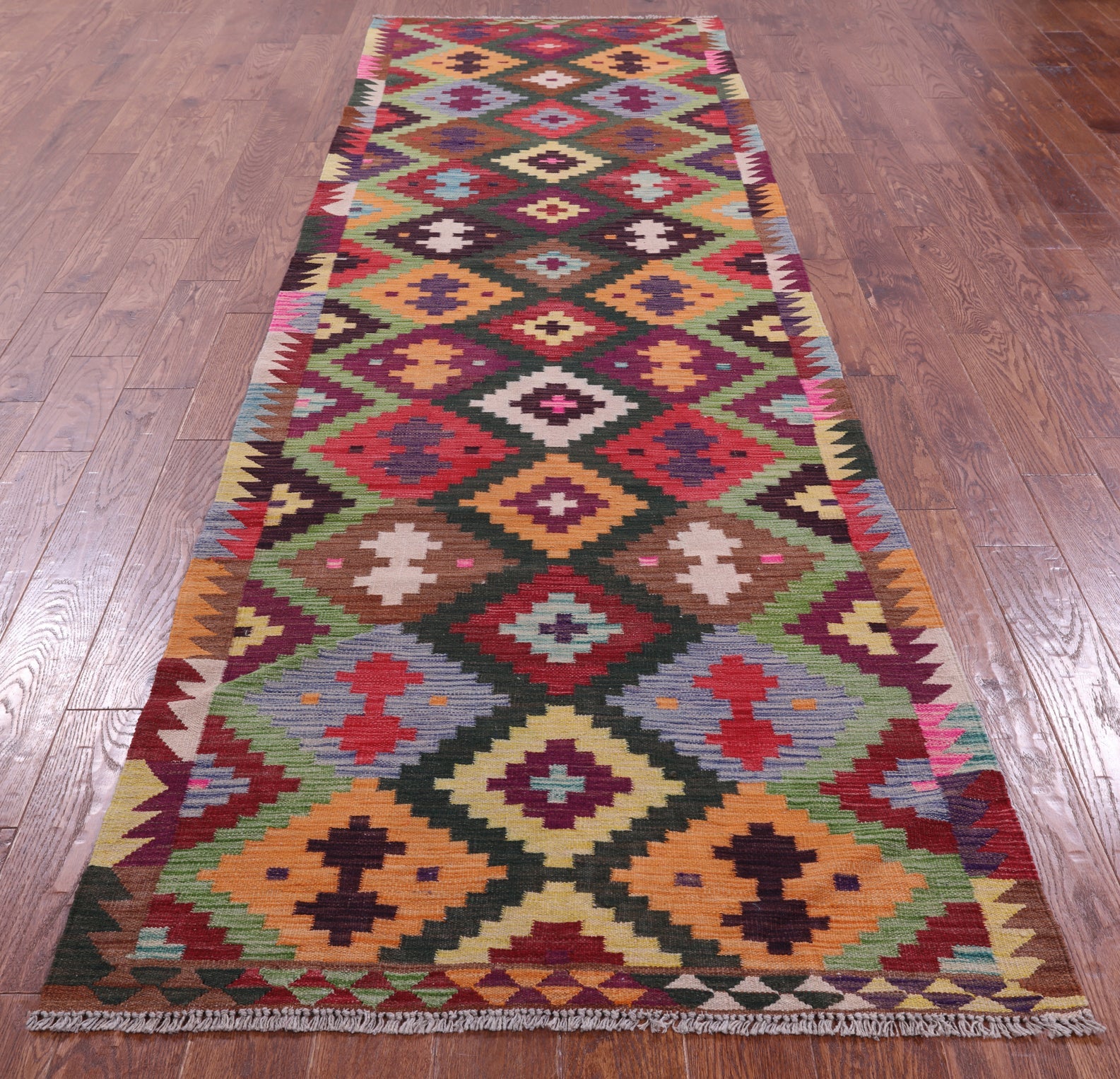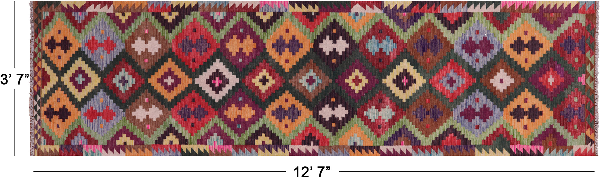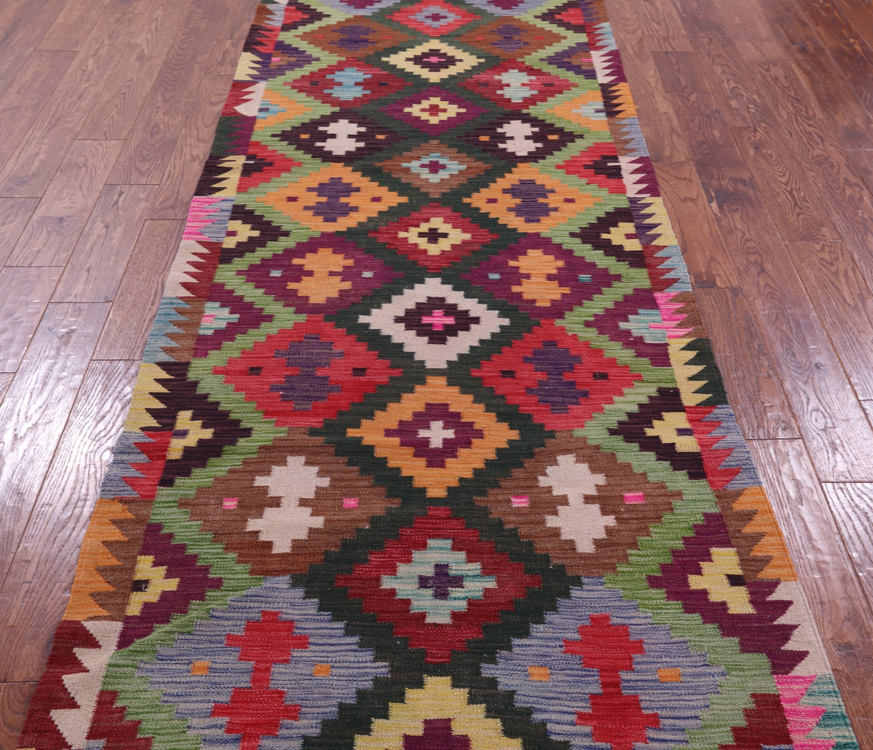 Kilim Flat Weave Reversible Wool On Wool Runner Rug 3' 7" X 12' 7" - Q18138 is backordered and will ship as soon as it is back in stock.