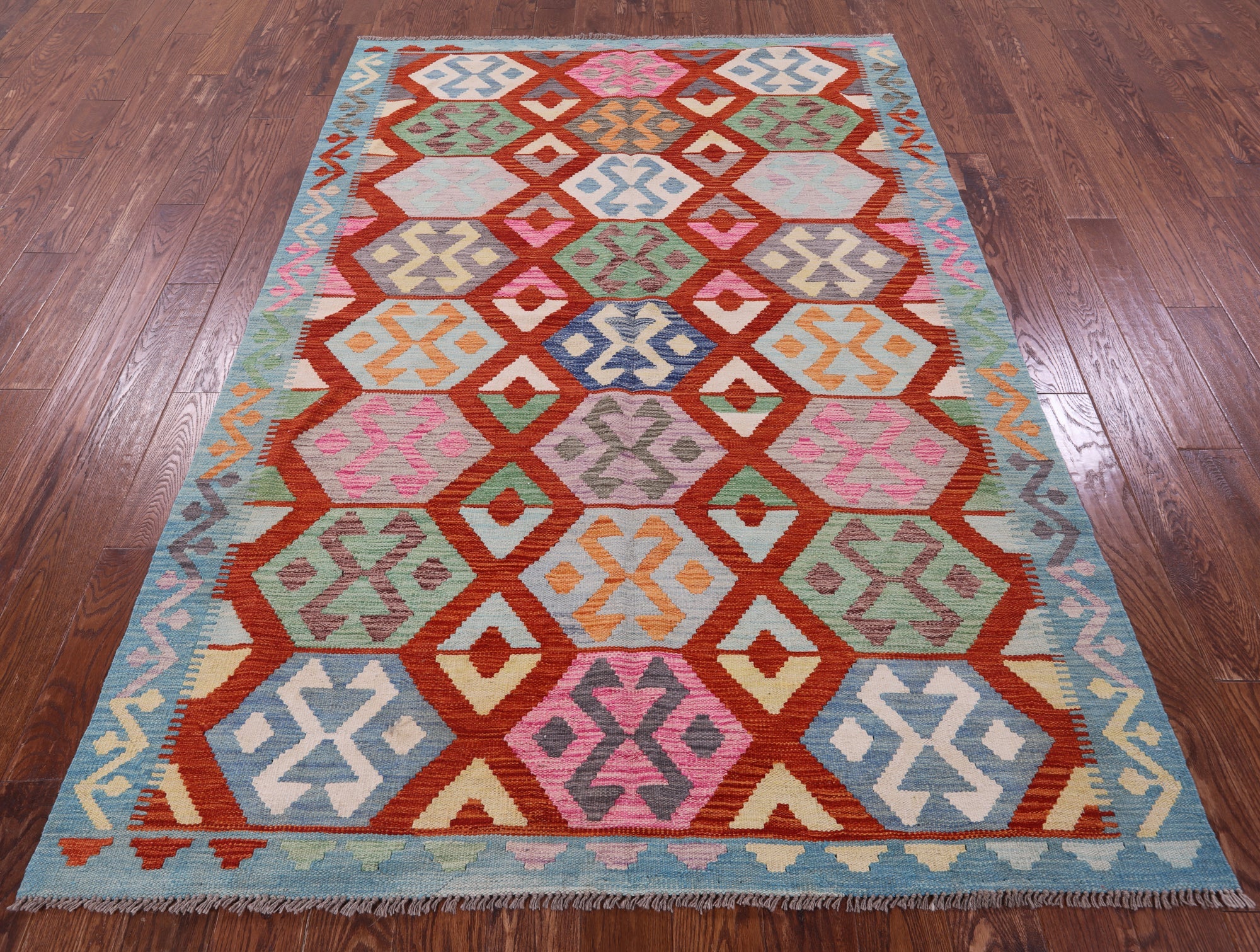 A kilim rug is a flat-woven rug. Kilim rugs are known for their intricate geometric patterns, vibrant colors, and durable construction. Unlike traditional pile rugs, kilims have a smooth surface with no pile, making them lightweight and versatile. They are often used as decorative pieces, floor coverings, or wall hangings, reflecting the cultural heritage and artistic expression of the regions they originate from.