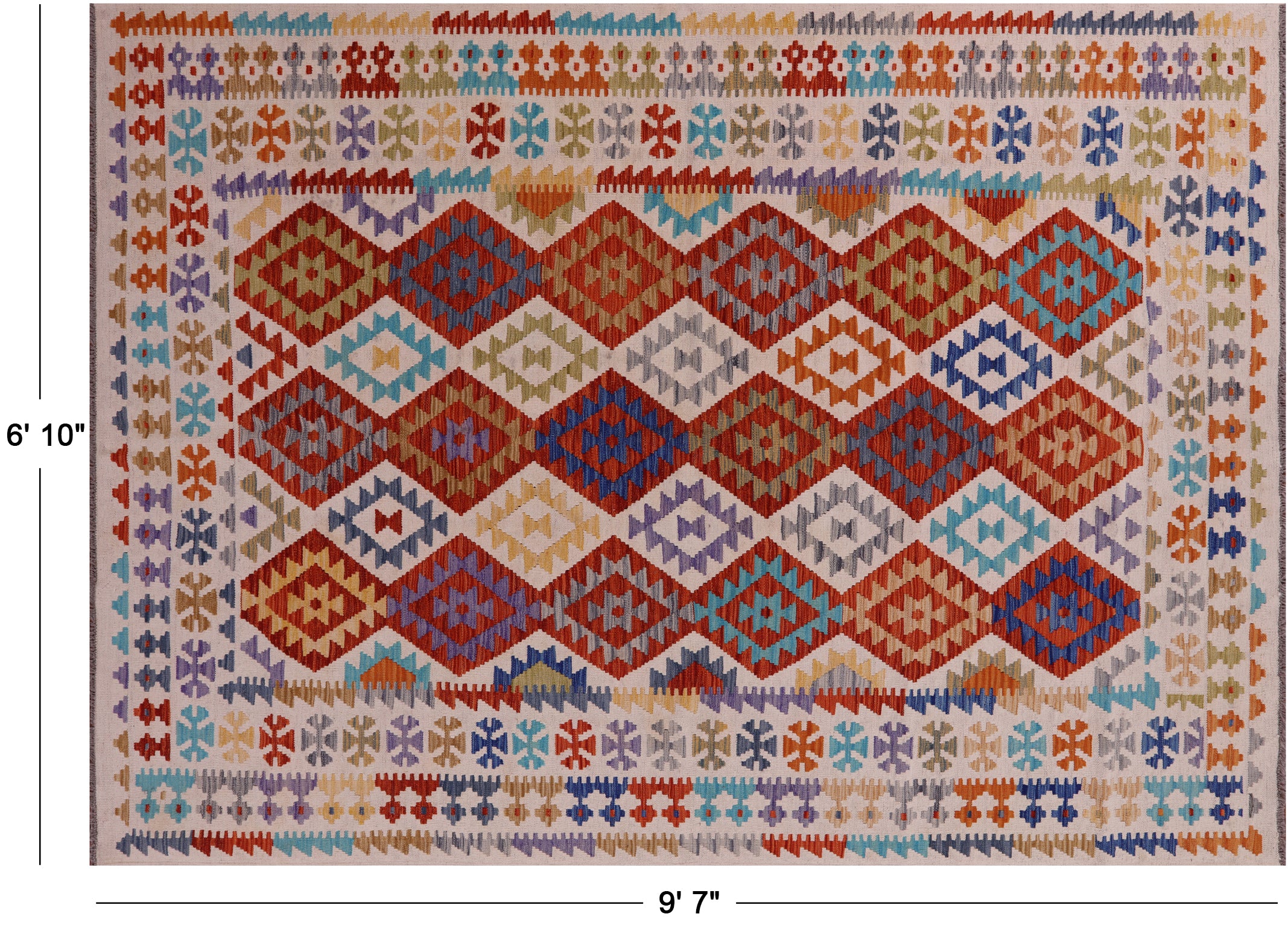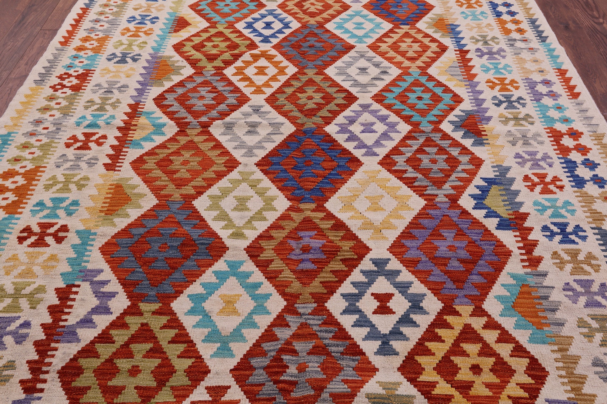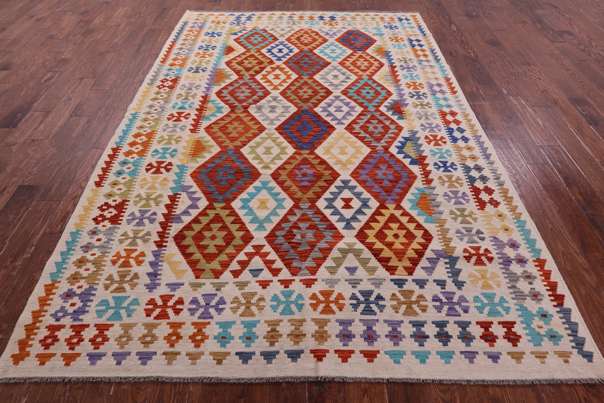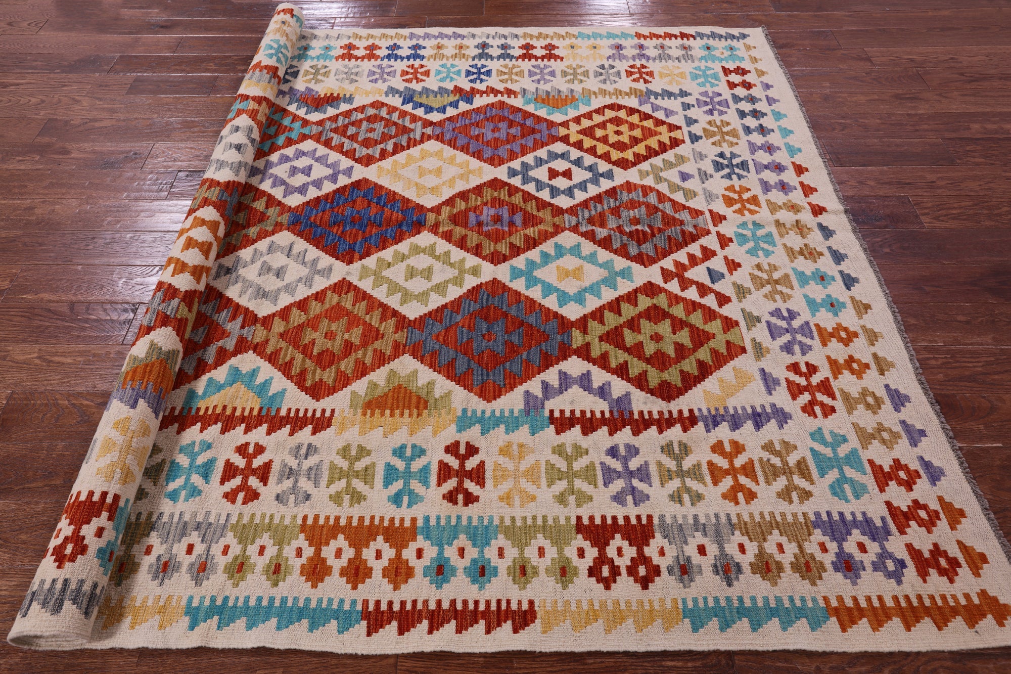 6' 10" X 9' 7" Reversible Kilim Flat Weave Wool On Wool Rug - Q17840 is backordered and will ship as soon as it is back in stock.