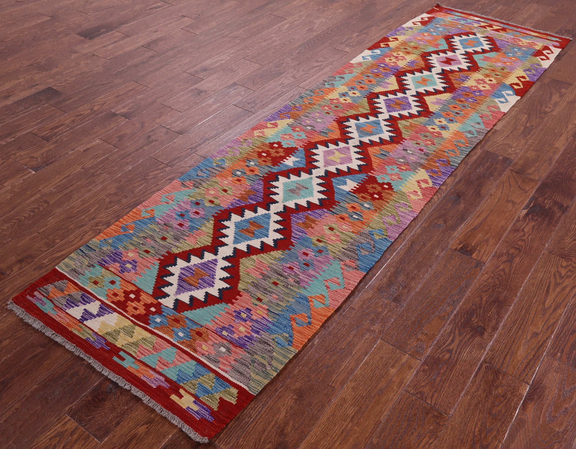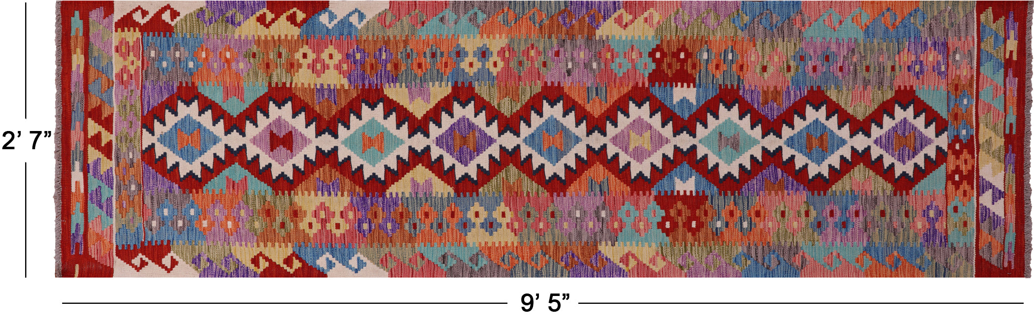 2' 7" X 9' 5" Runner Kilim Flat Weave Wool On Wool Reversible Rug - Q18094 is backordered and will ship as soon as it is back in stock.