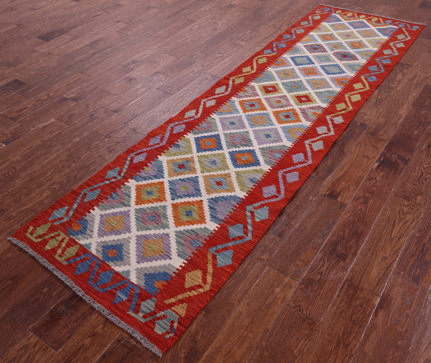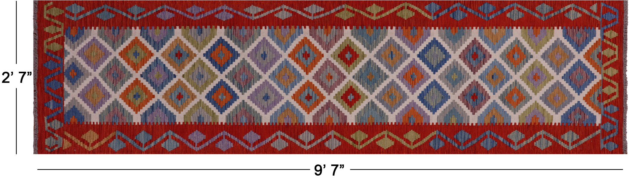 Wool On Wool Kilim Flat Reversible Weave Runner Rug 2' 7" X 9' 7" - Q18082 is backordered and will ship as soon as it is back in stock.