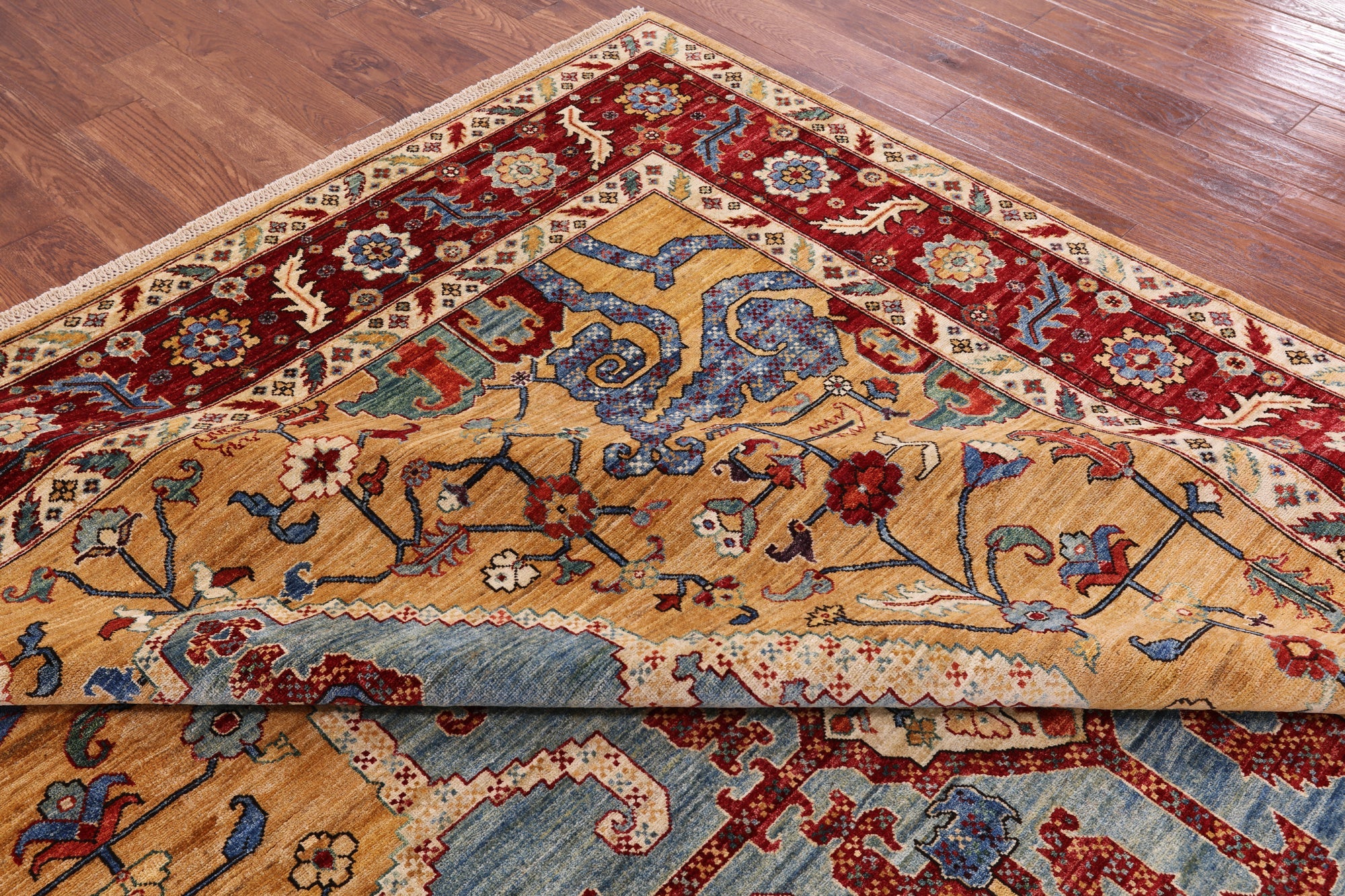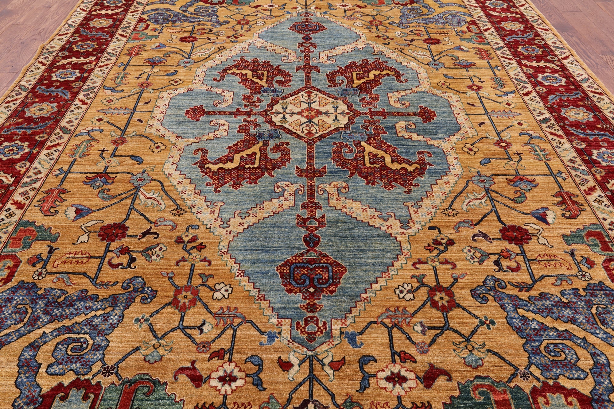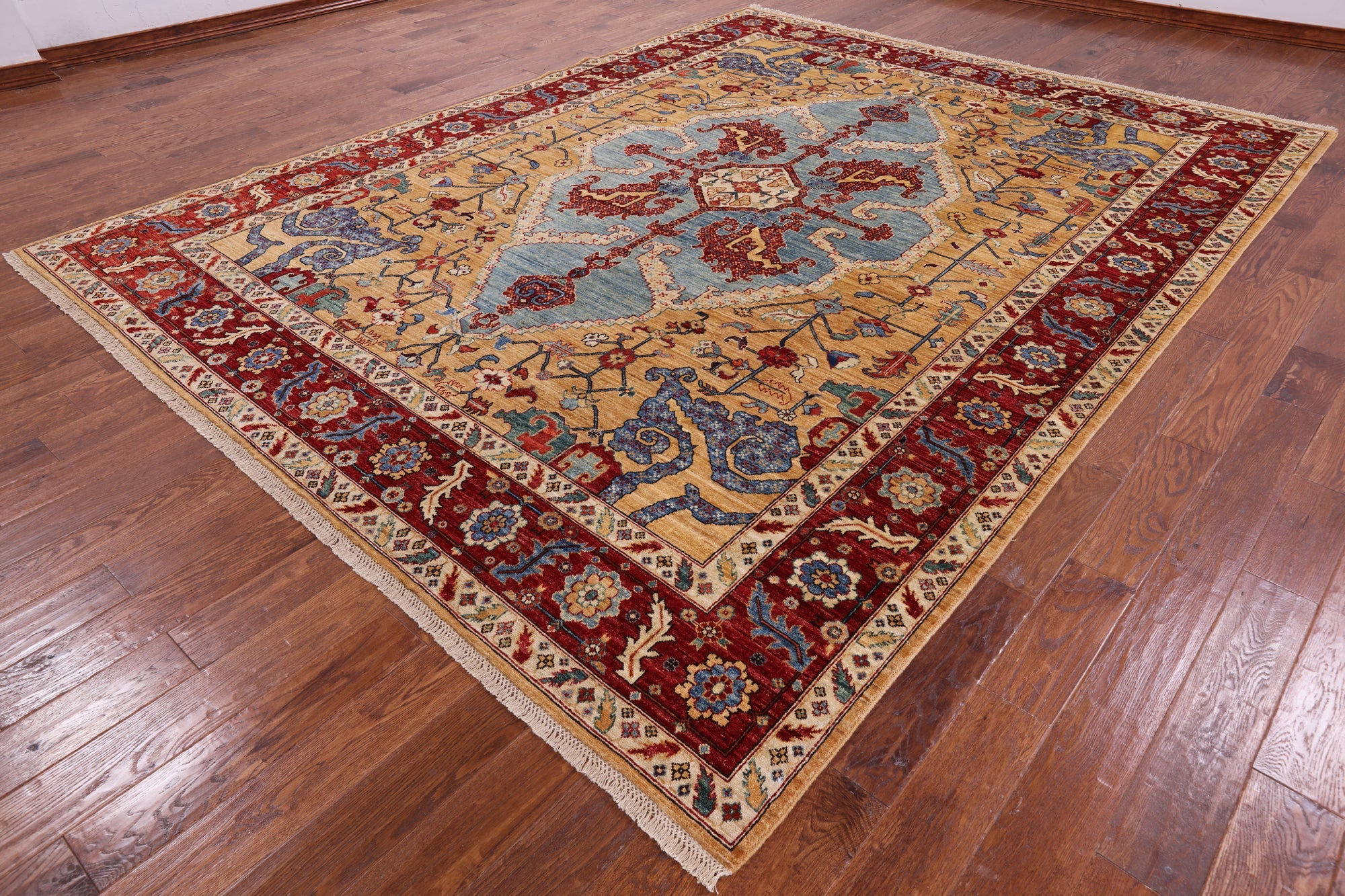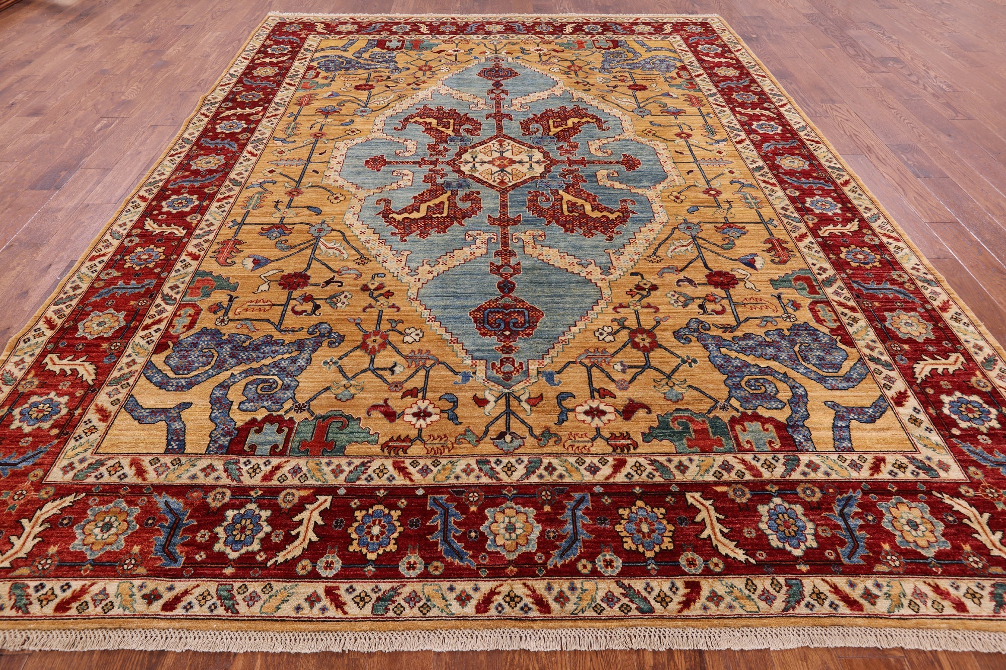 The nature-inspired color palette of Serapi/Heriz rugs gives them an antique look, which has historically sought after for many years. They commonly feature intricate medallions, followed by abstract florals and geometric designs. What makes the Serapi/Heriz so desirable, is their high endurance and longevity under high traffic. Serapi/Heriz rugs are constructed by a labor intensive hand knotting process, made from thick plush piles of wool.