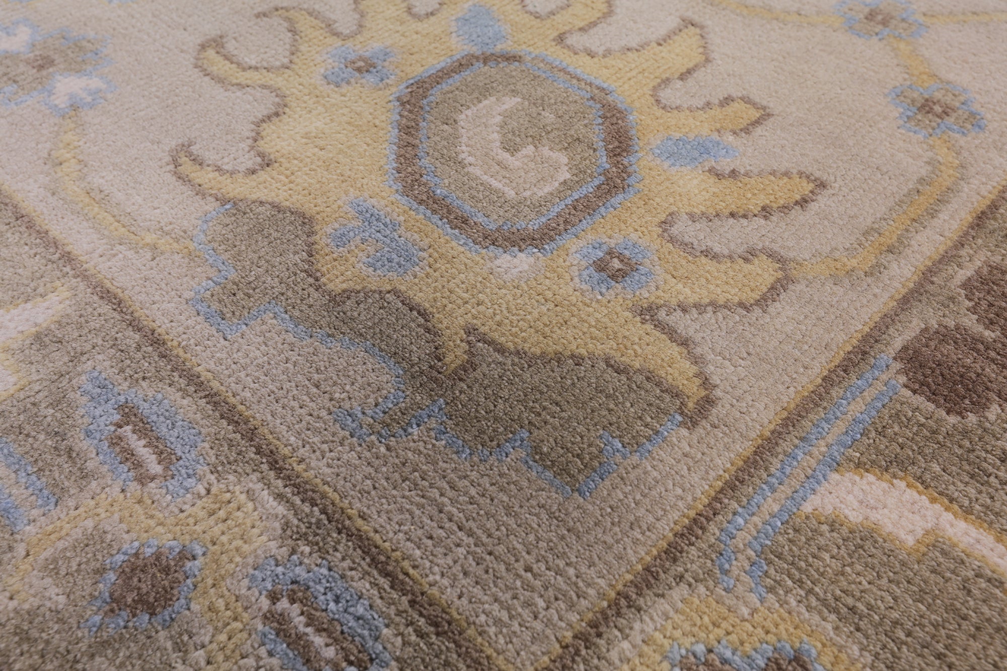 Oushak rugs, hand-knotted with meticulous craftsmanship, are celebrated for their timeless beauty, luxurious feel, and vibrant colors. These rugs feature a harmonious blend of muted earthy tones and colorful hues, with intricate designs inspired by traditional Turkish motifs. Their versatile style seamlessly complements various interiors, from traditional to modern. With a dense pile and careful hand-knotting techniques, Oushak handmade rugs not only enhance visual appeal but also stand as enduring pieces, adding a touch of refined elegance and a splash of color to any space.