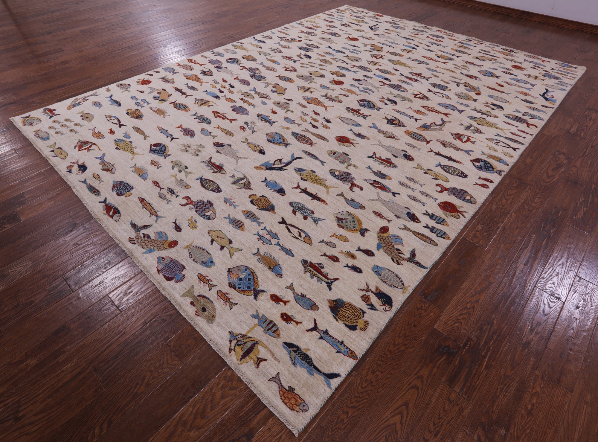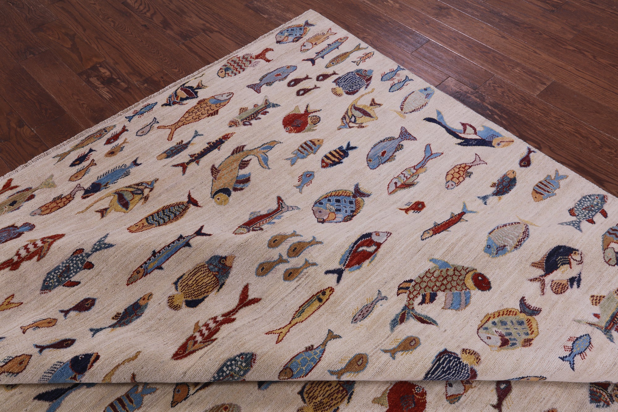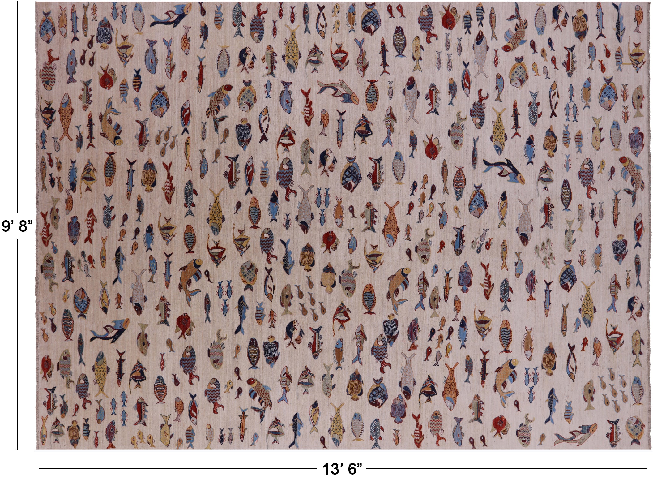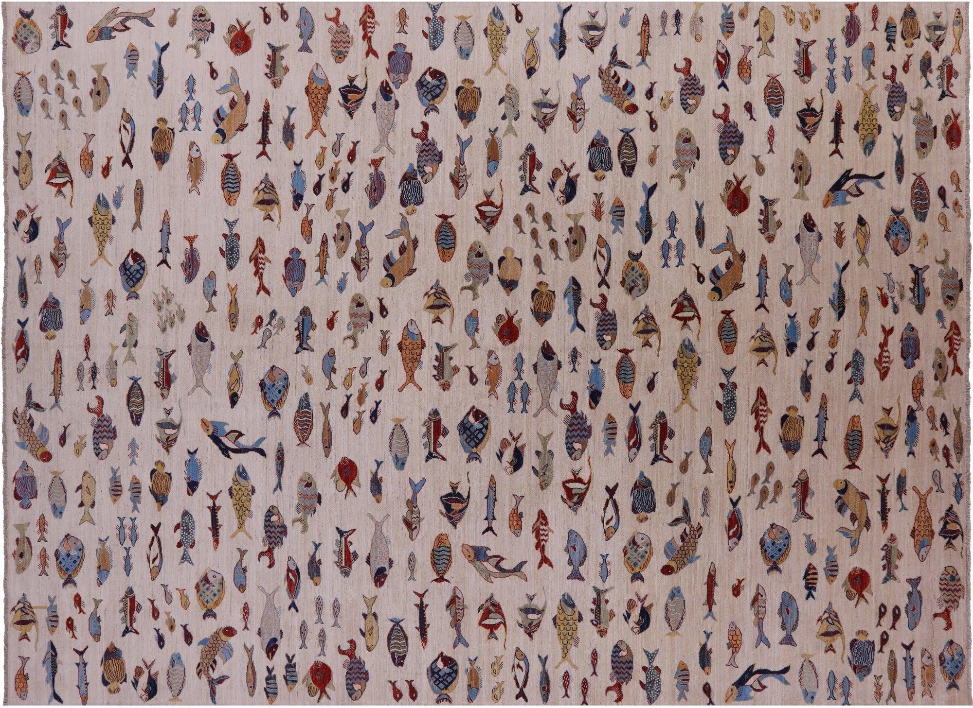 Ivory Gabbeh Fish Design Hand Knotted Wool Rug 9' 8" X 13' 6" - Q20744
