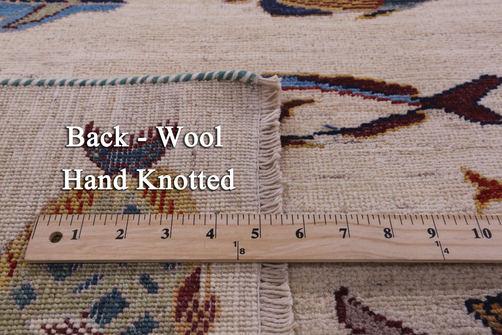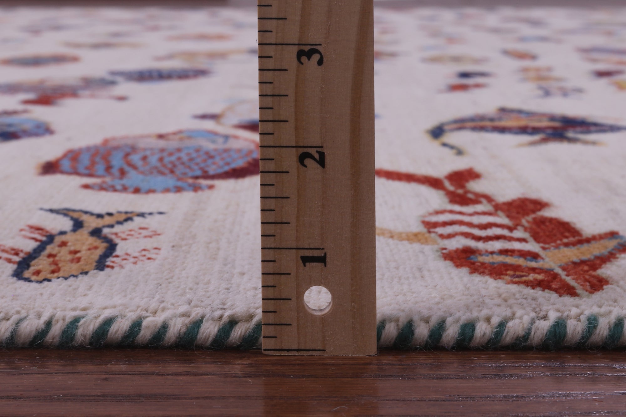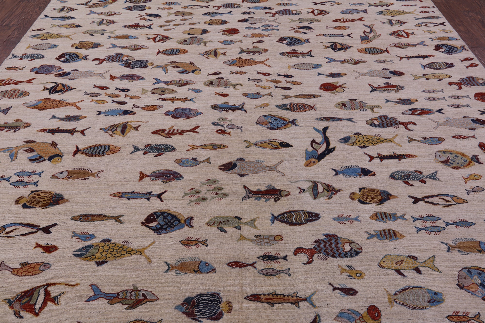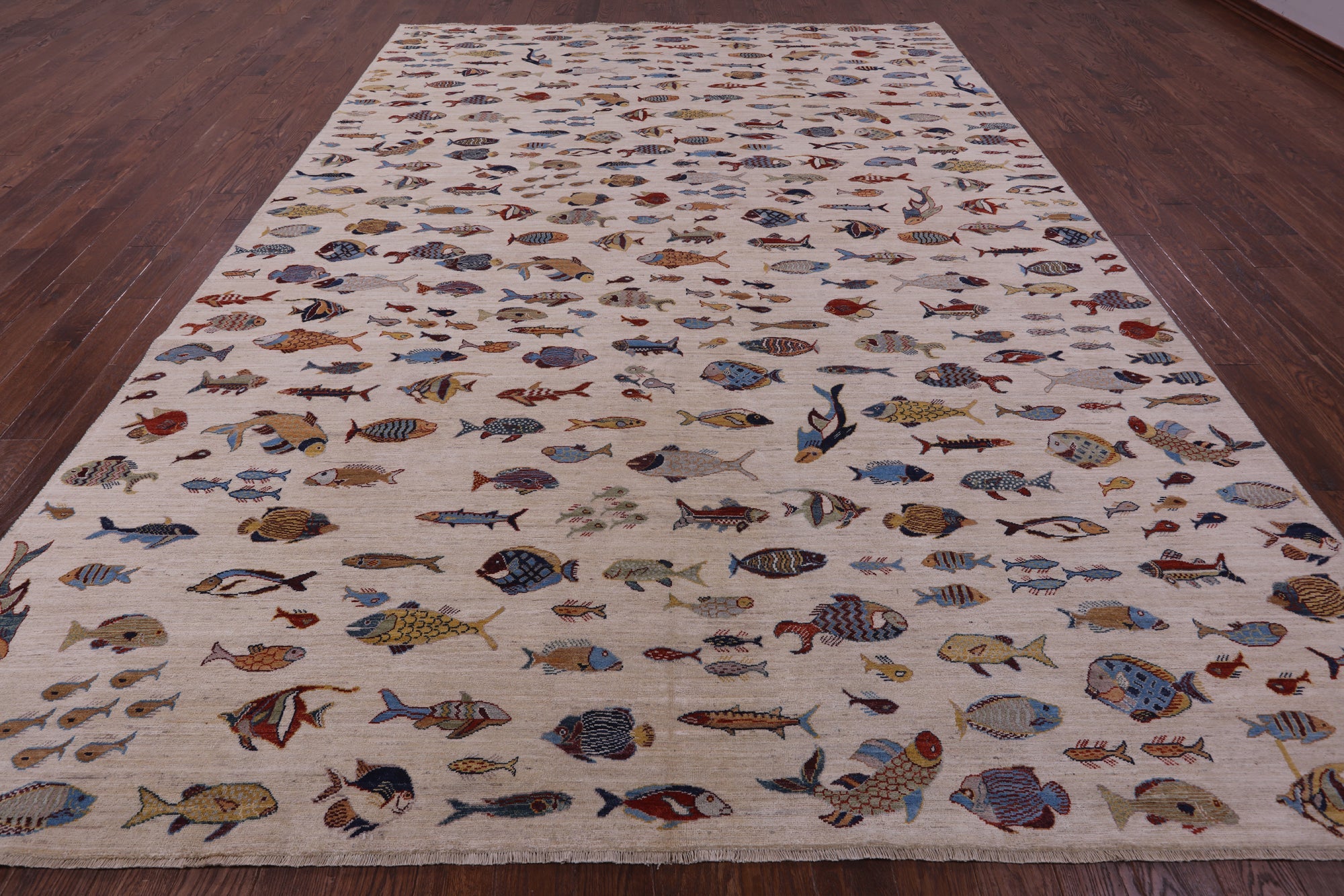 Ivory Gabbeh Fish Design Hand Knotted Wool Rug 9' 8" X 13' 6" - Q20744