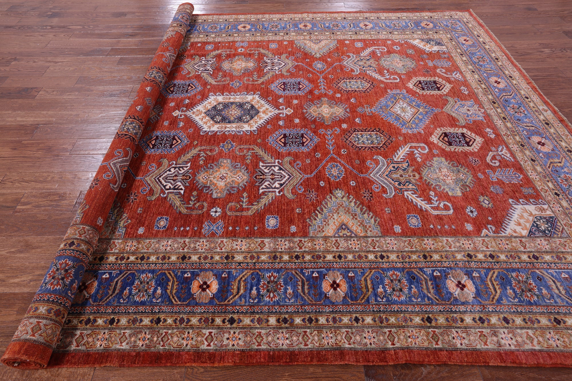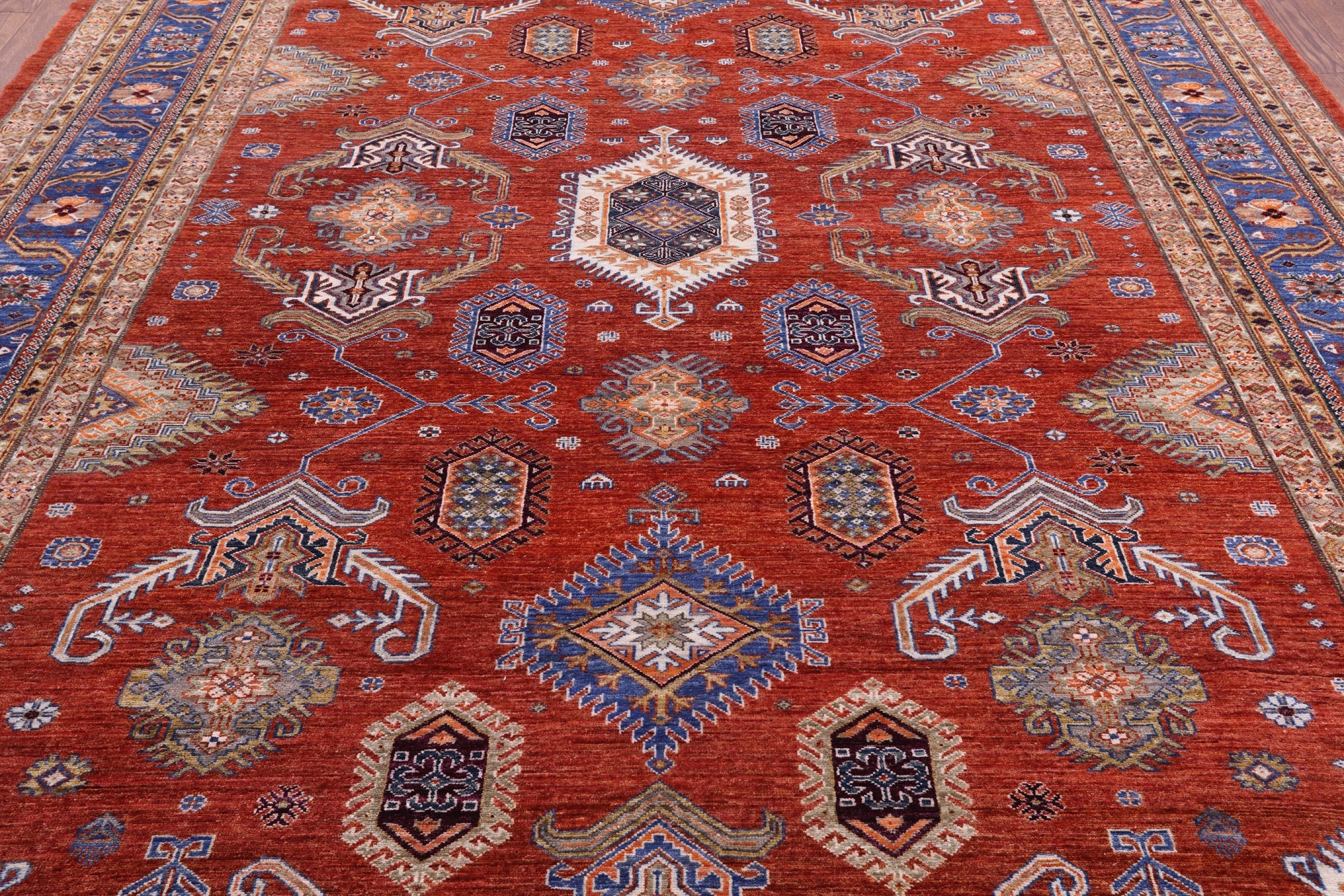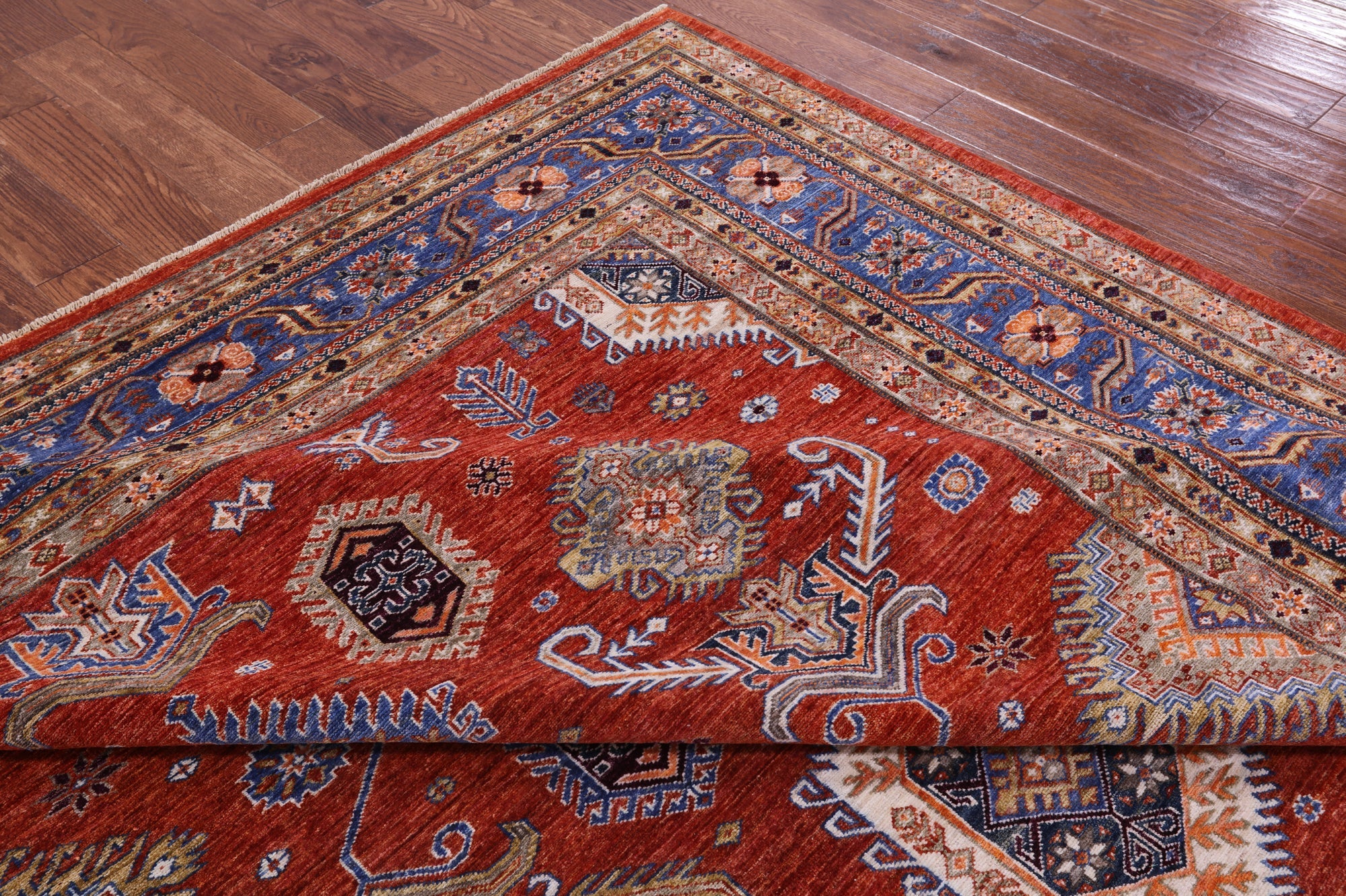 Super Kazak rugs were woven in the south of Caucasus and are very regional in their designs. Super Kazak rugs are very traditional in look and the patterns can vary from geometric shapes, tribal designs like people and animals, and symbolic medallions. They are beautifully intricate and heavy in design. These rugs come in varieties of rich, warm, jewel tones that can liven up any space.