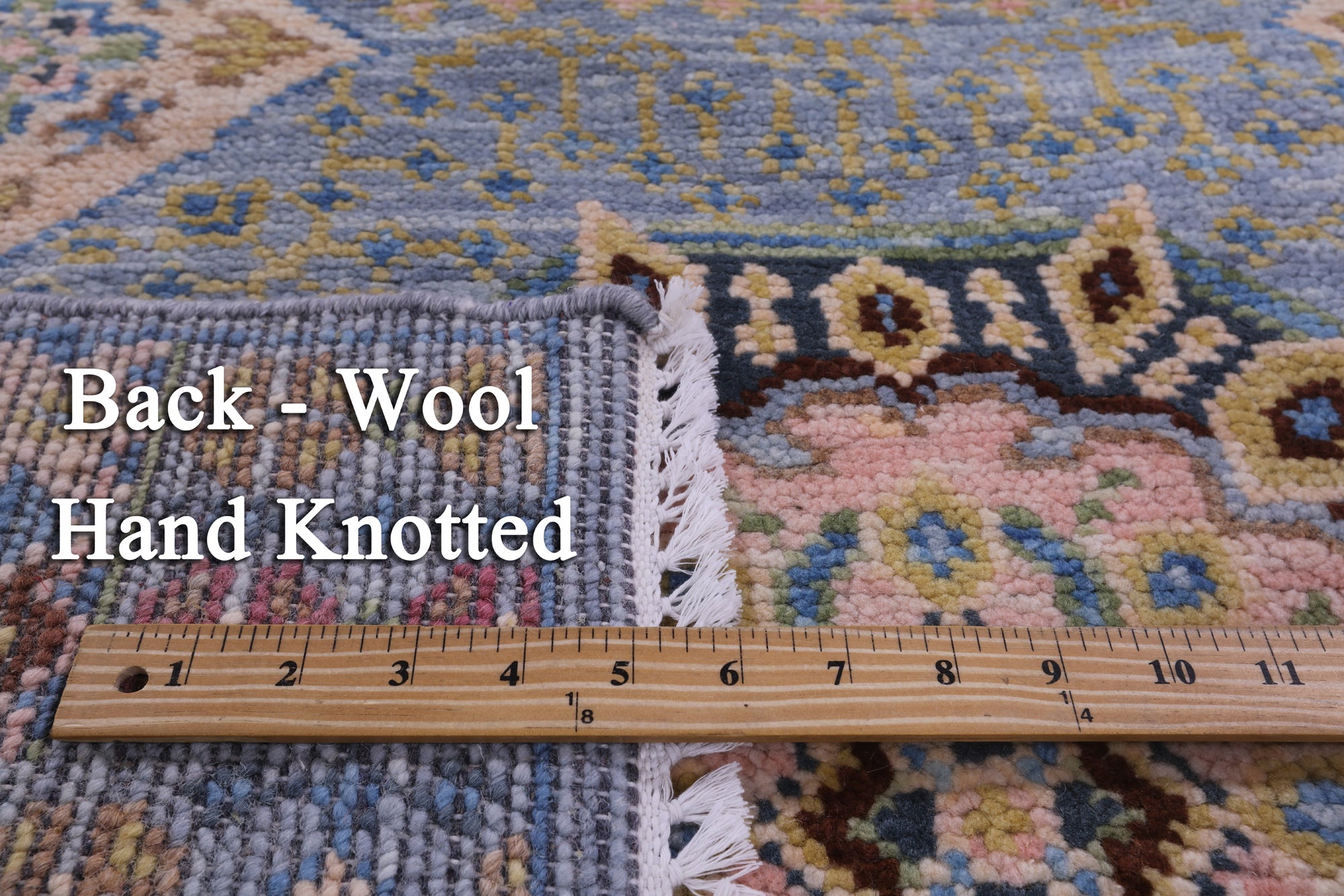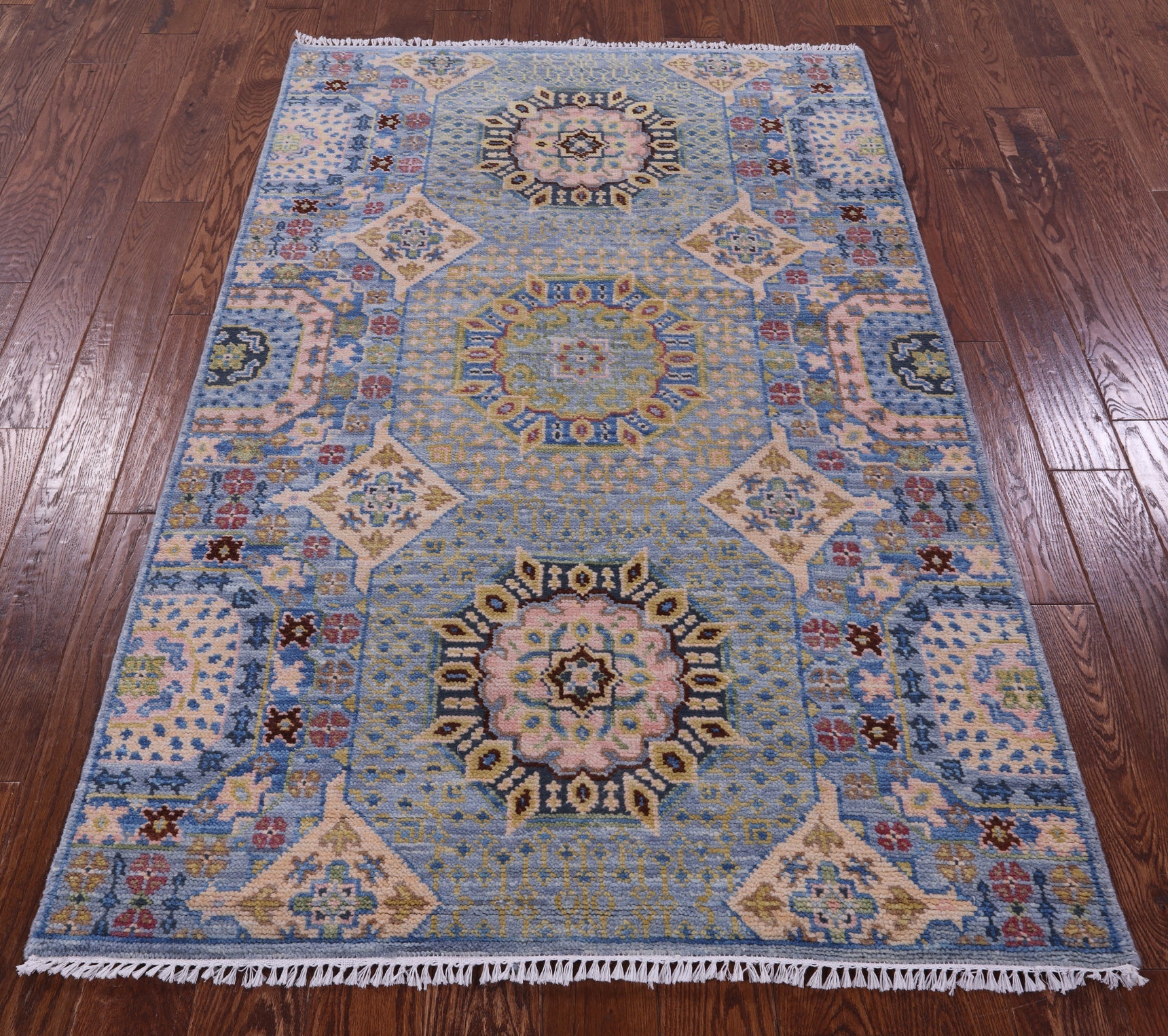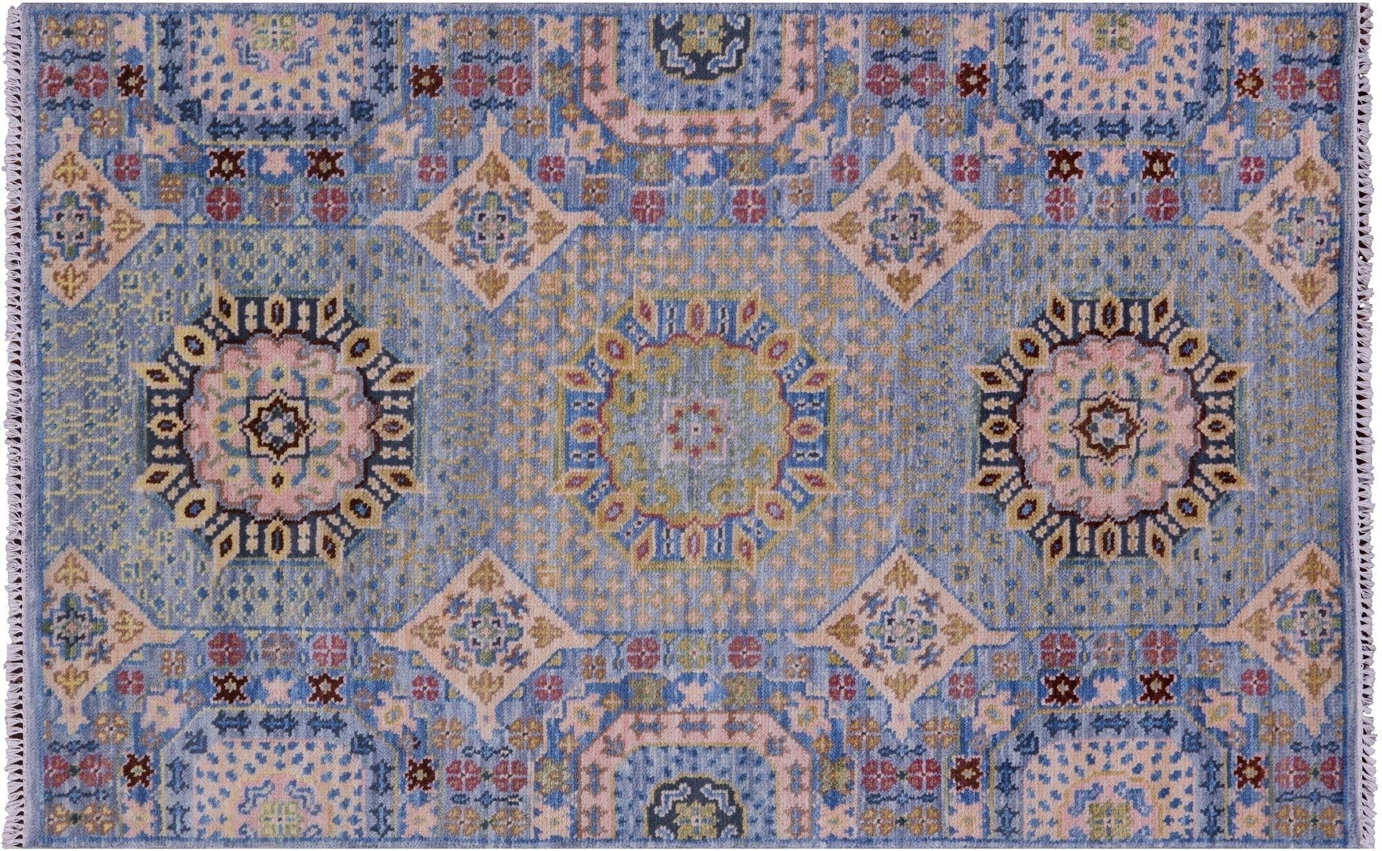 Blue Mamluk Geometric Handmade Wool Rug 4' 1" X 6' 4" - Q19310 is backordered and will ship as soon as it is back in stock.