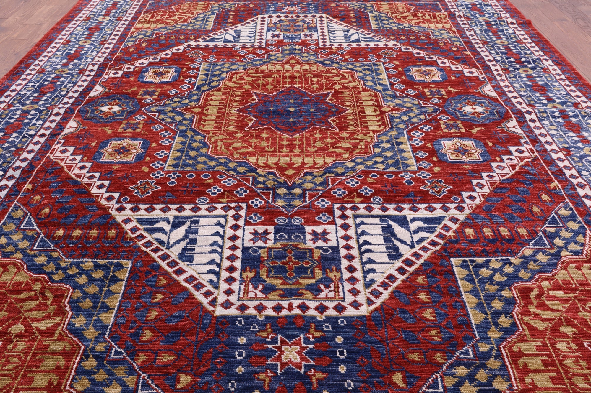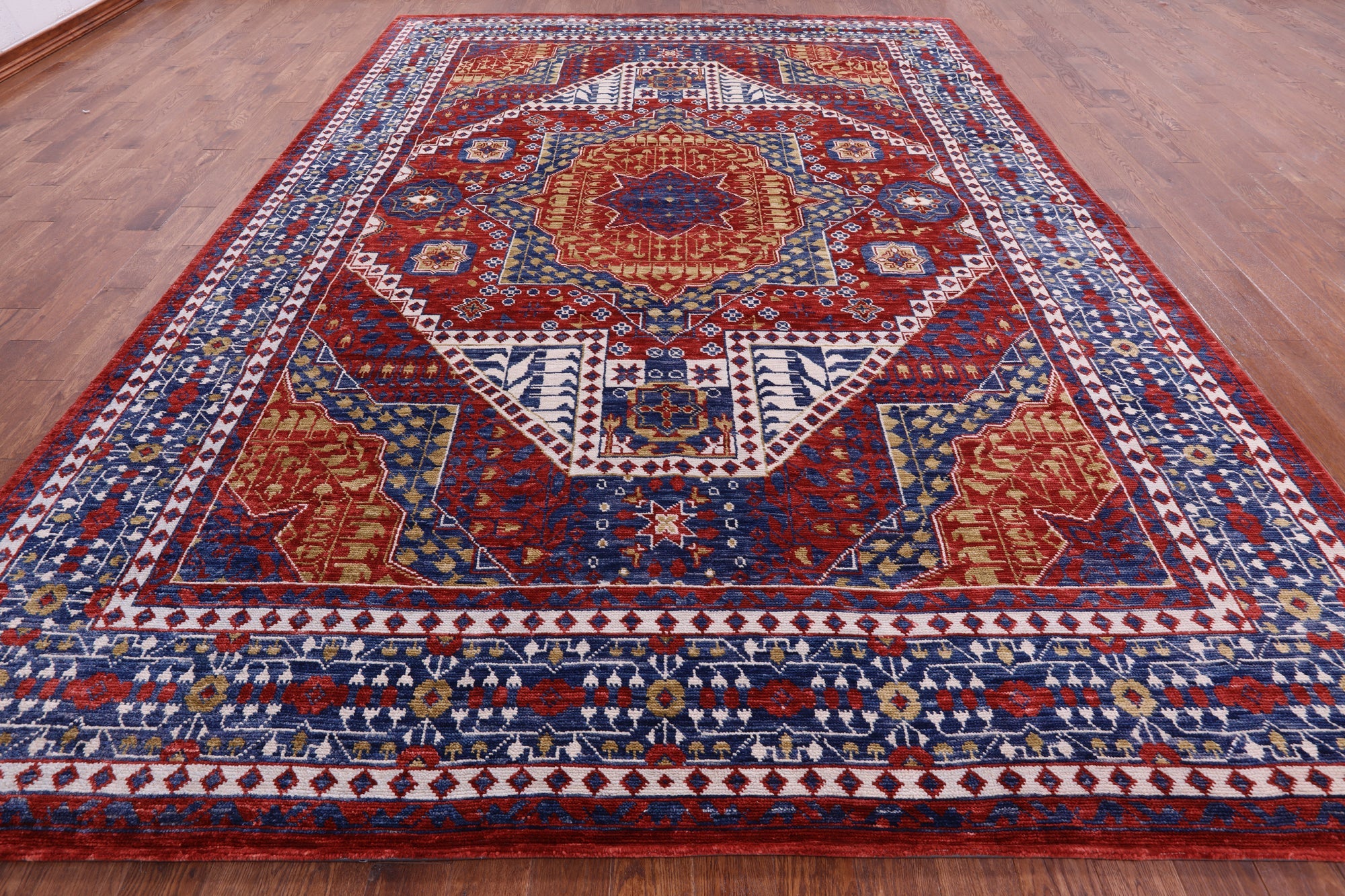 Originating in Cairo, Egypt, Mamluk rugs are prominent for their amazing ability to have extremely symmetrical designs. This creates a splendid mirror-like effect. The medallions can be seen as interlacing stars and polygons, with other geometric patterns surrounding. The colors commonly used for these traditional rugs are blues, rich reds, ivory, and greens.