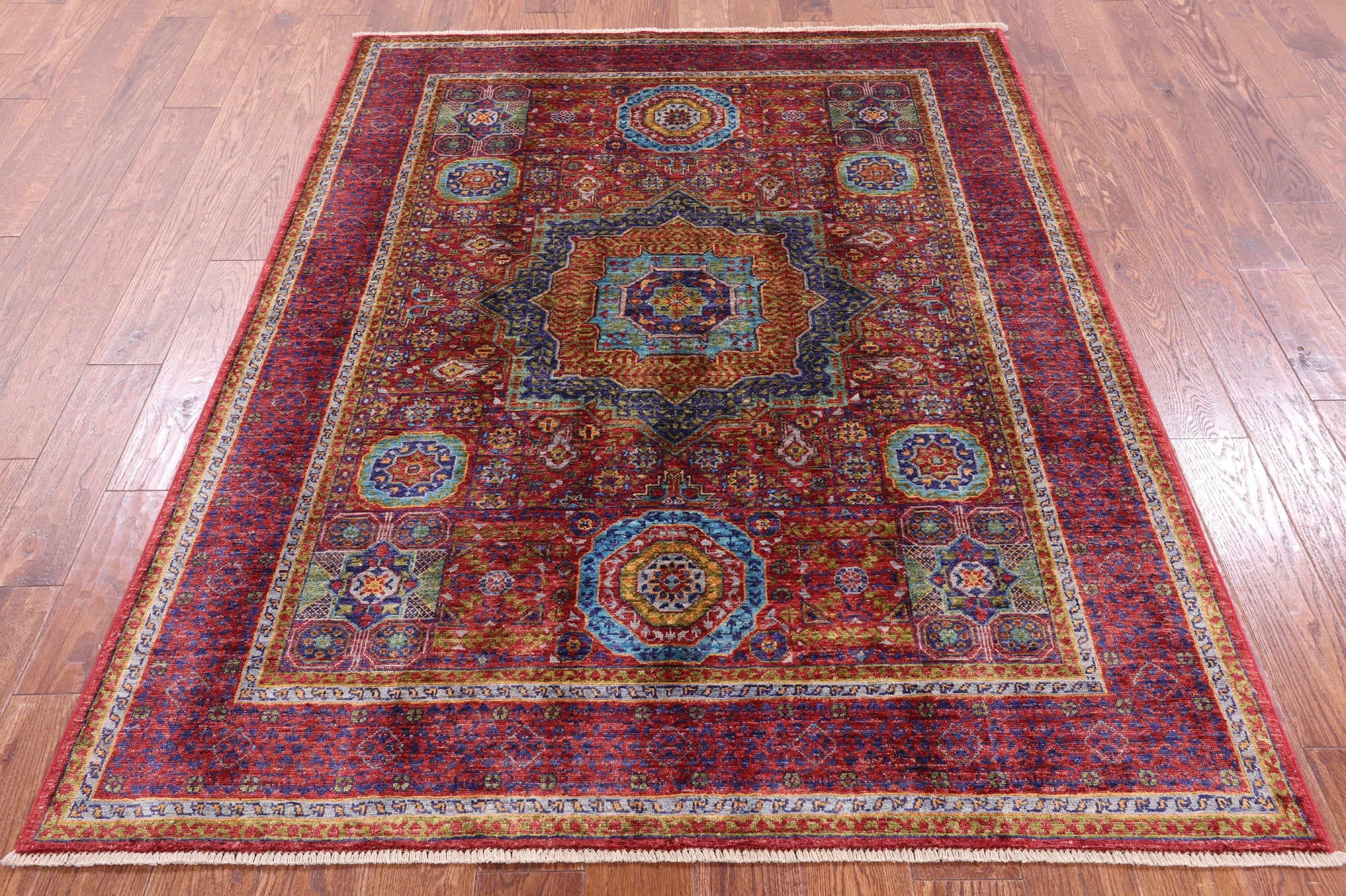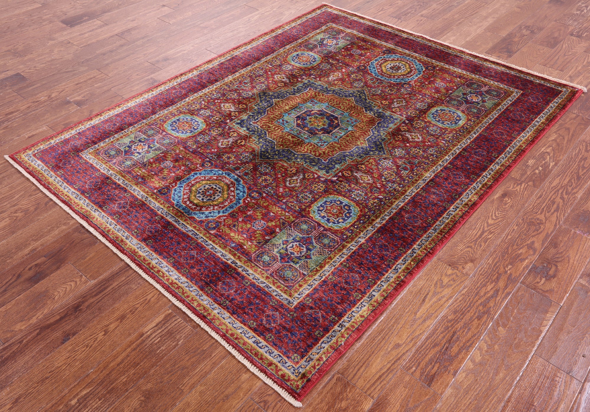 Originating in Cairo, Egypt, Mamluk rugs are prominent for their amazing ability to have extremely symmetrical designs. This creates a splendid mirror-like effect. The medallions can be seen as interlacing stars and polygons, with other geometric patterns surrounding. The colors commonly used for these traditional rugs are blues, rich reds, ivory, and greens.