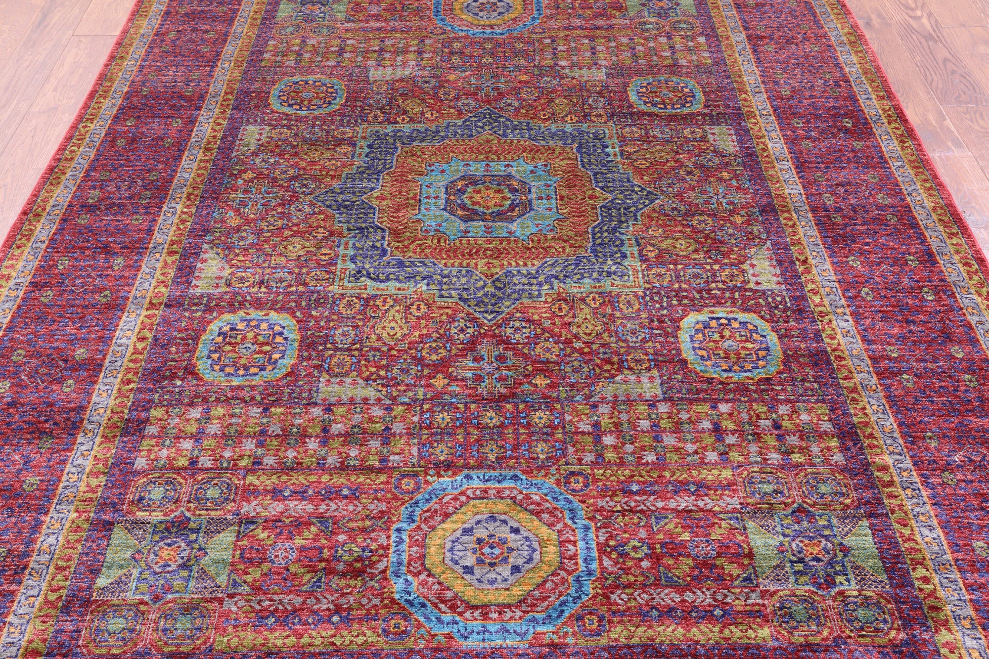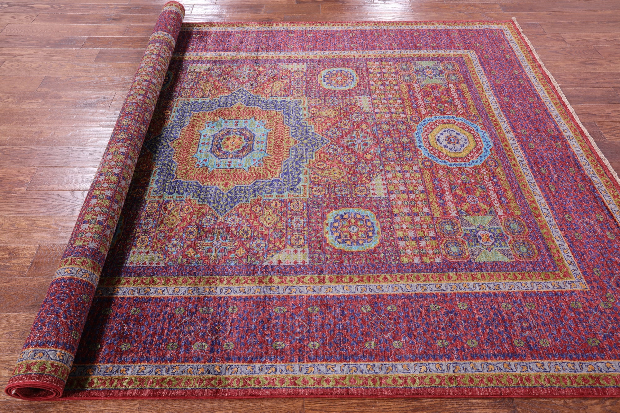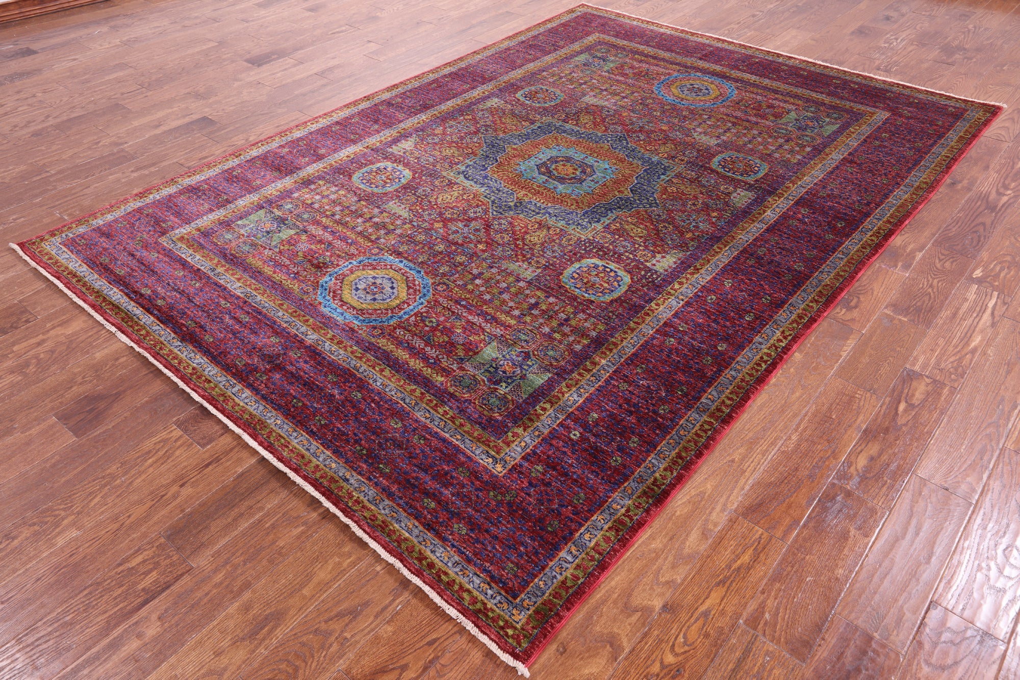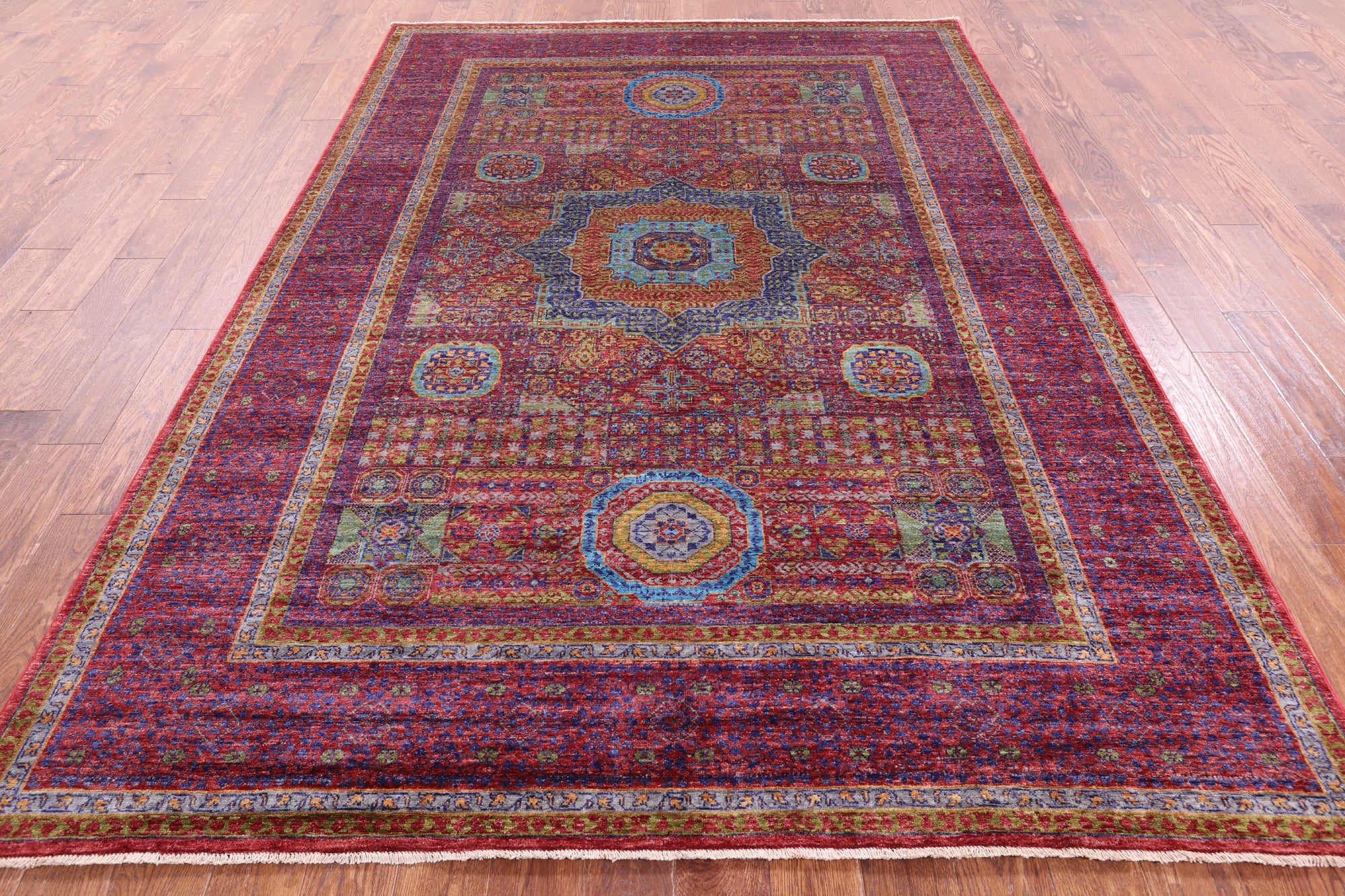 Originating in Cairo, Egypt, Mamluk rugs are prominent for their amazing ability to have extremely symmetrical designs. This creates a splendid mirror-like effect. The medallions can be seen as interlacing stars and polygons, with other geometric patterns surrounding. The colors commonly used for these traditional rugs are blues, rich reds, ivory, and greens.