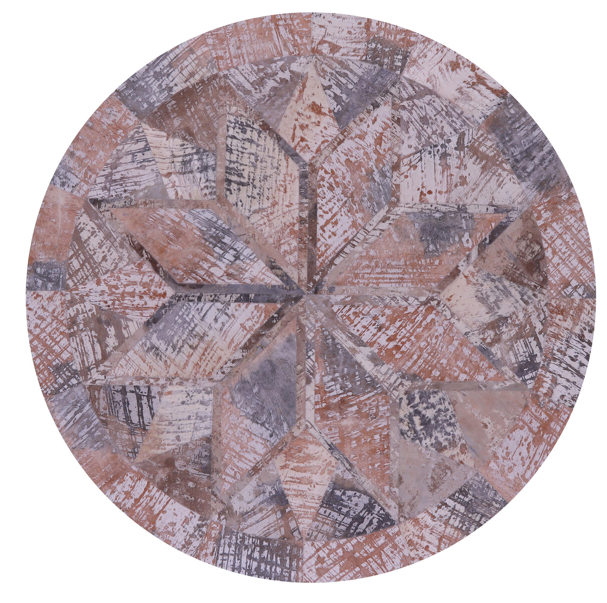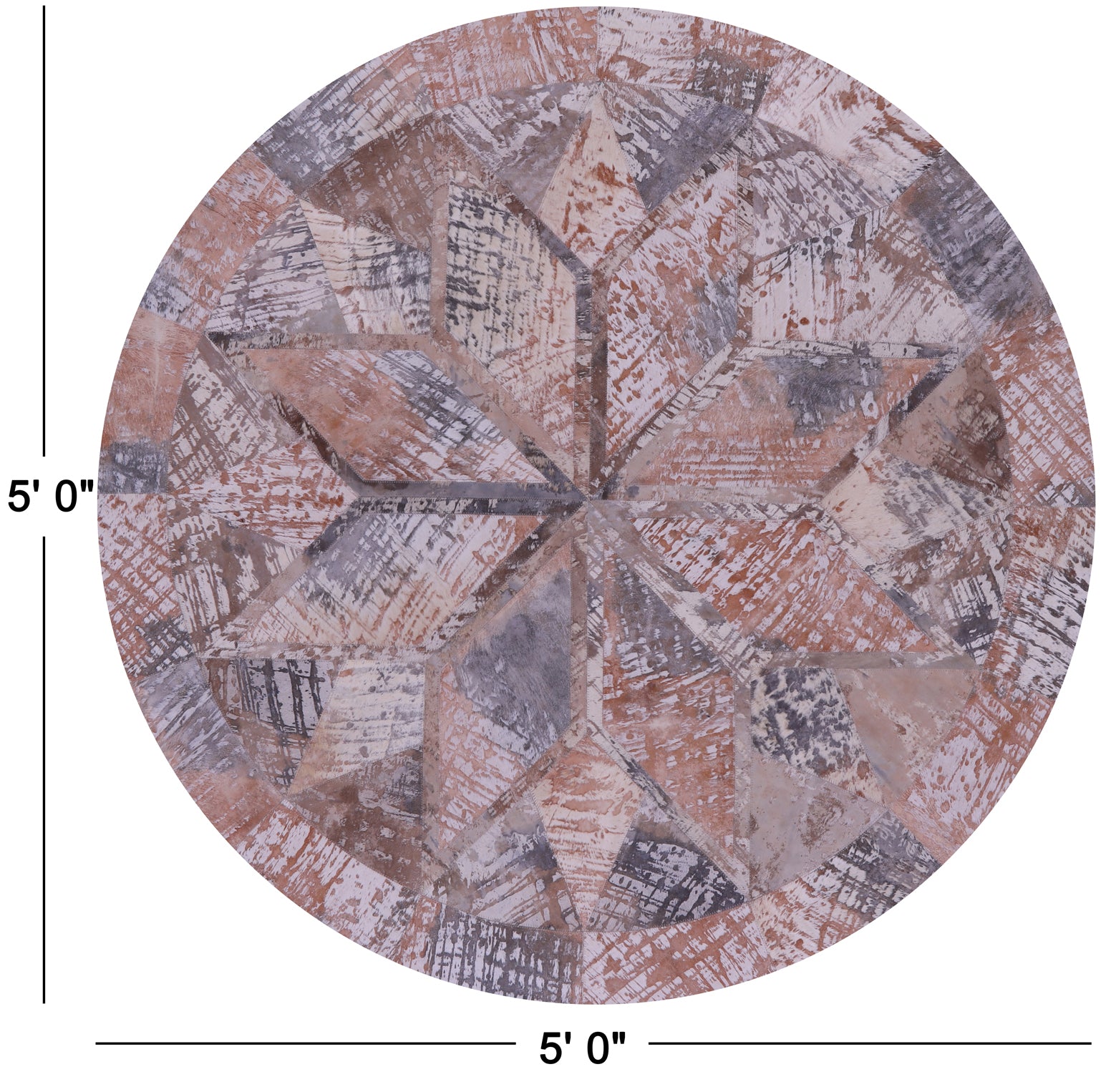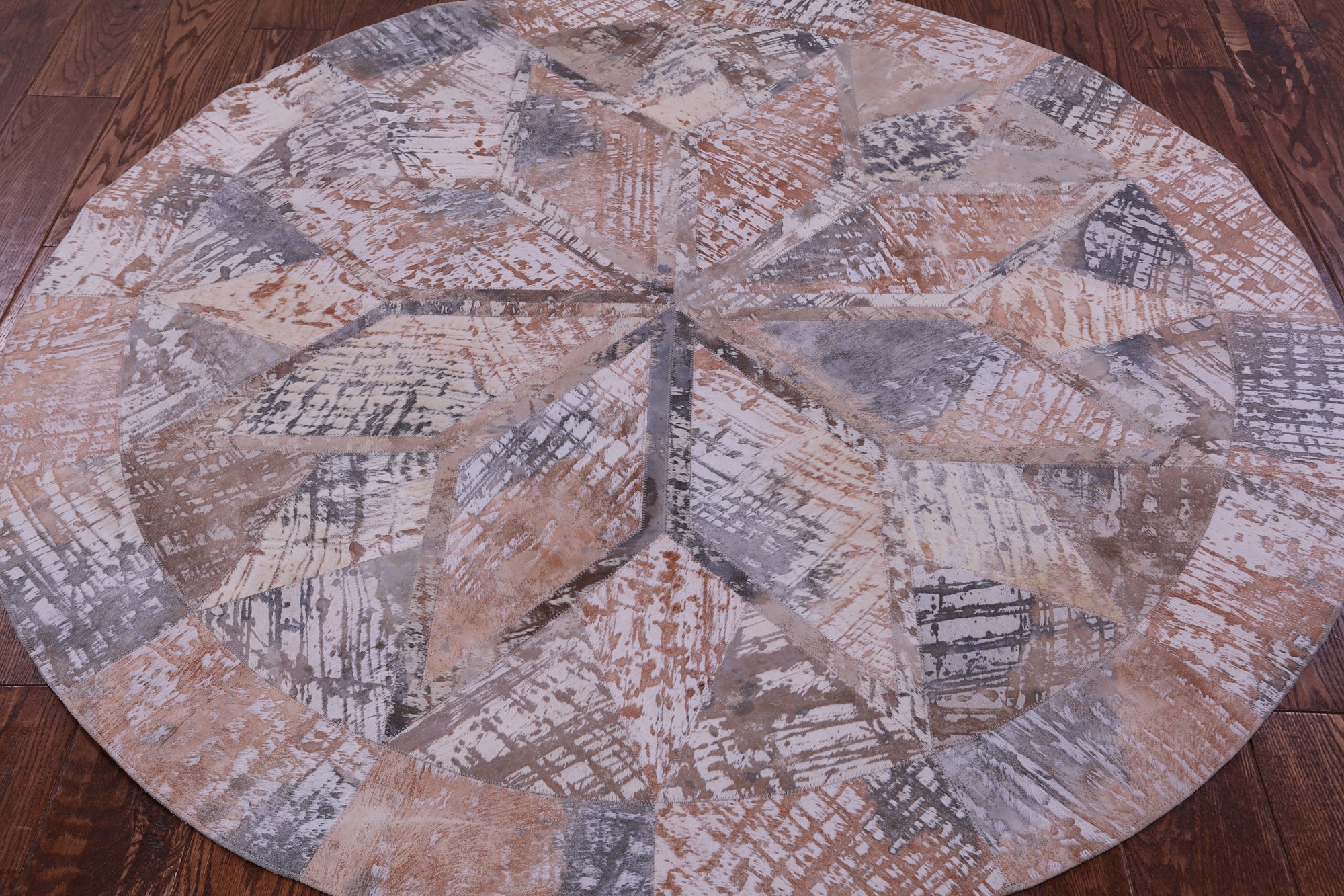 5' Abstract Round Printed Natural Cowhide Hand Stitched Rug - C3324