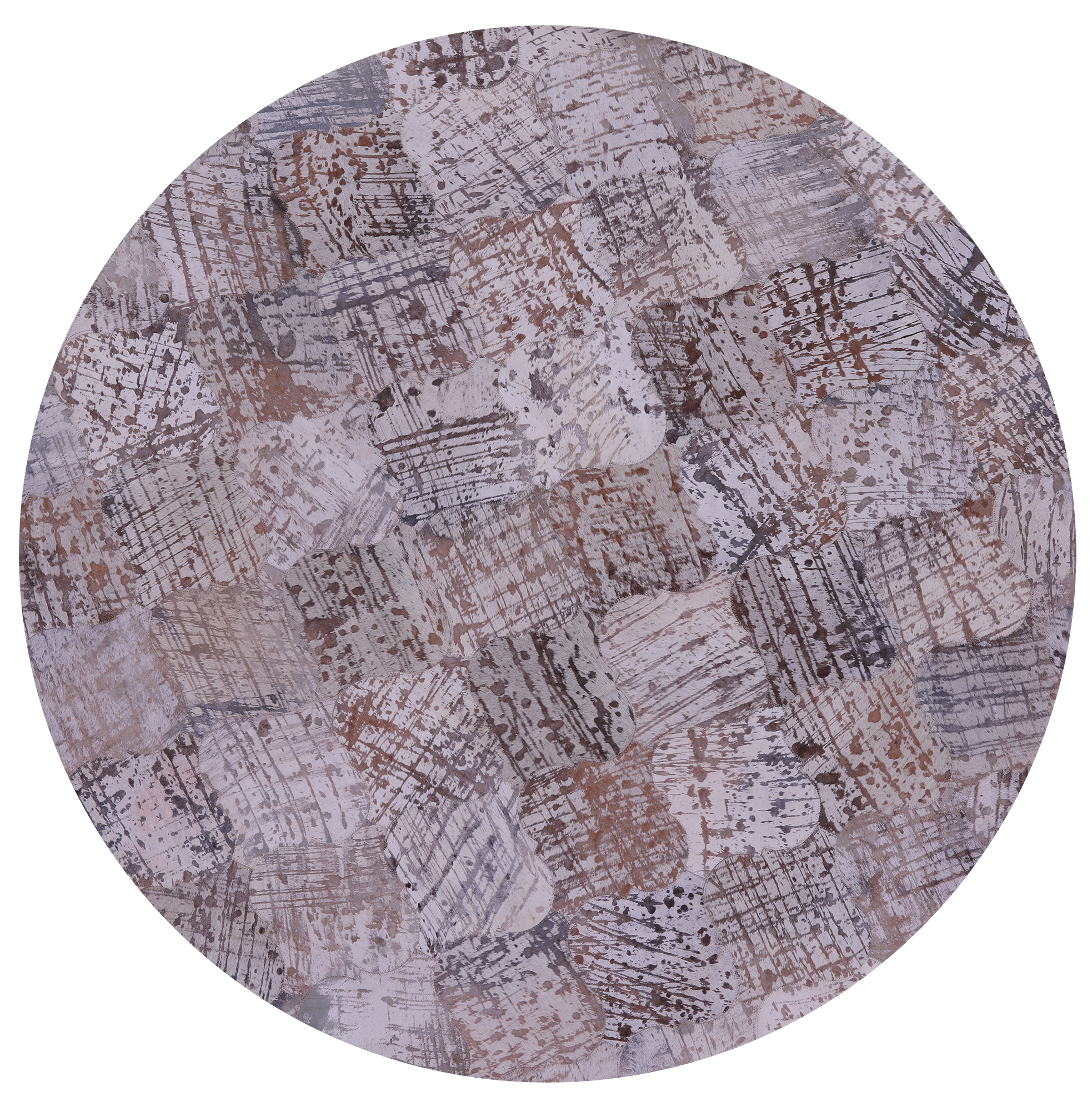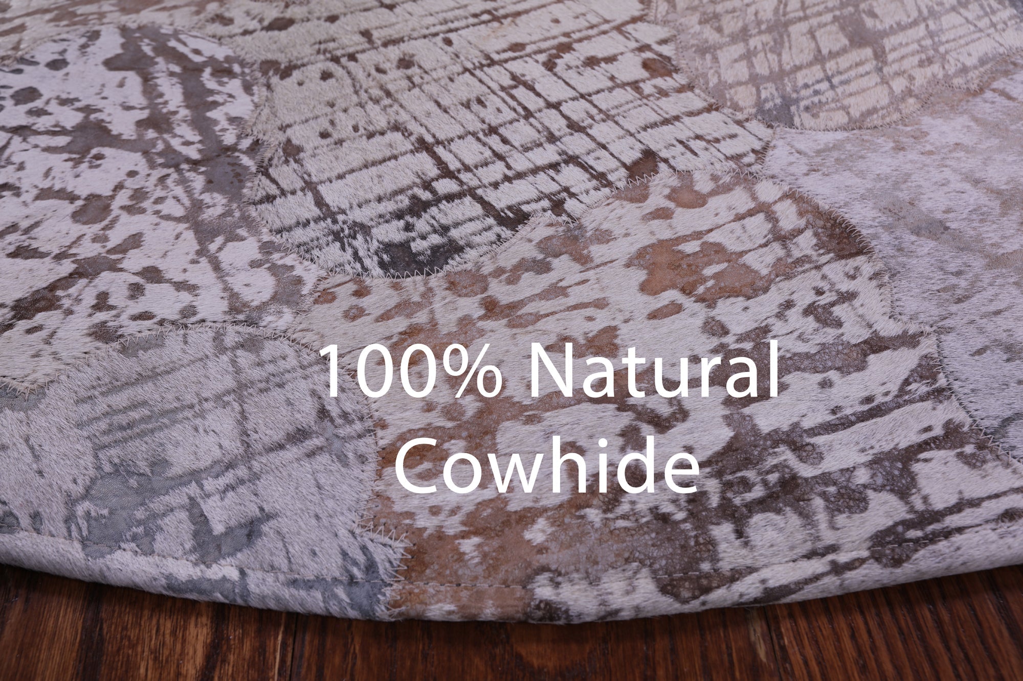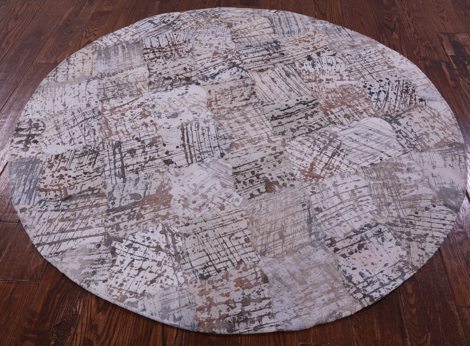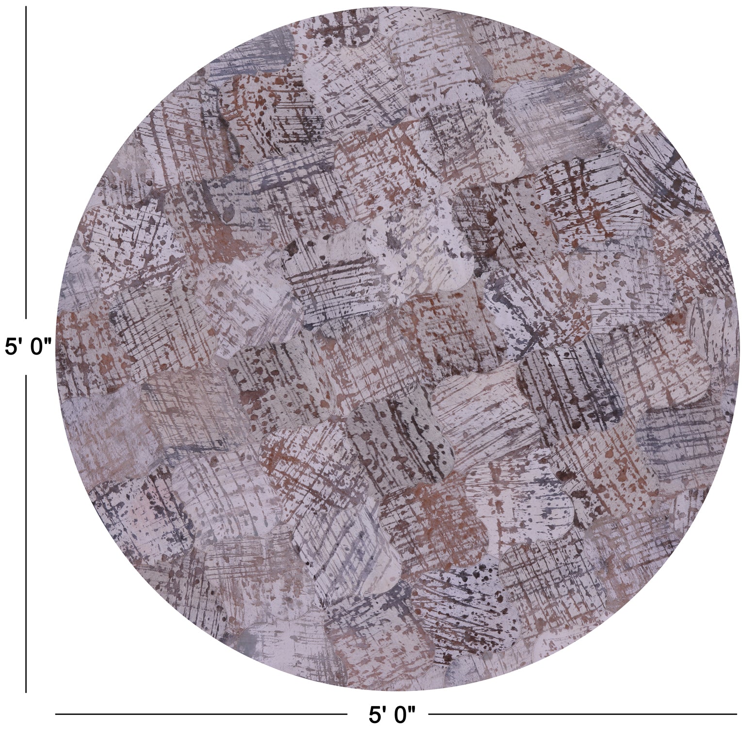 5' Abstract Round Printed Natural Cowhide Hand Stitched Rug - C3330