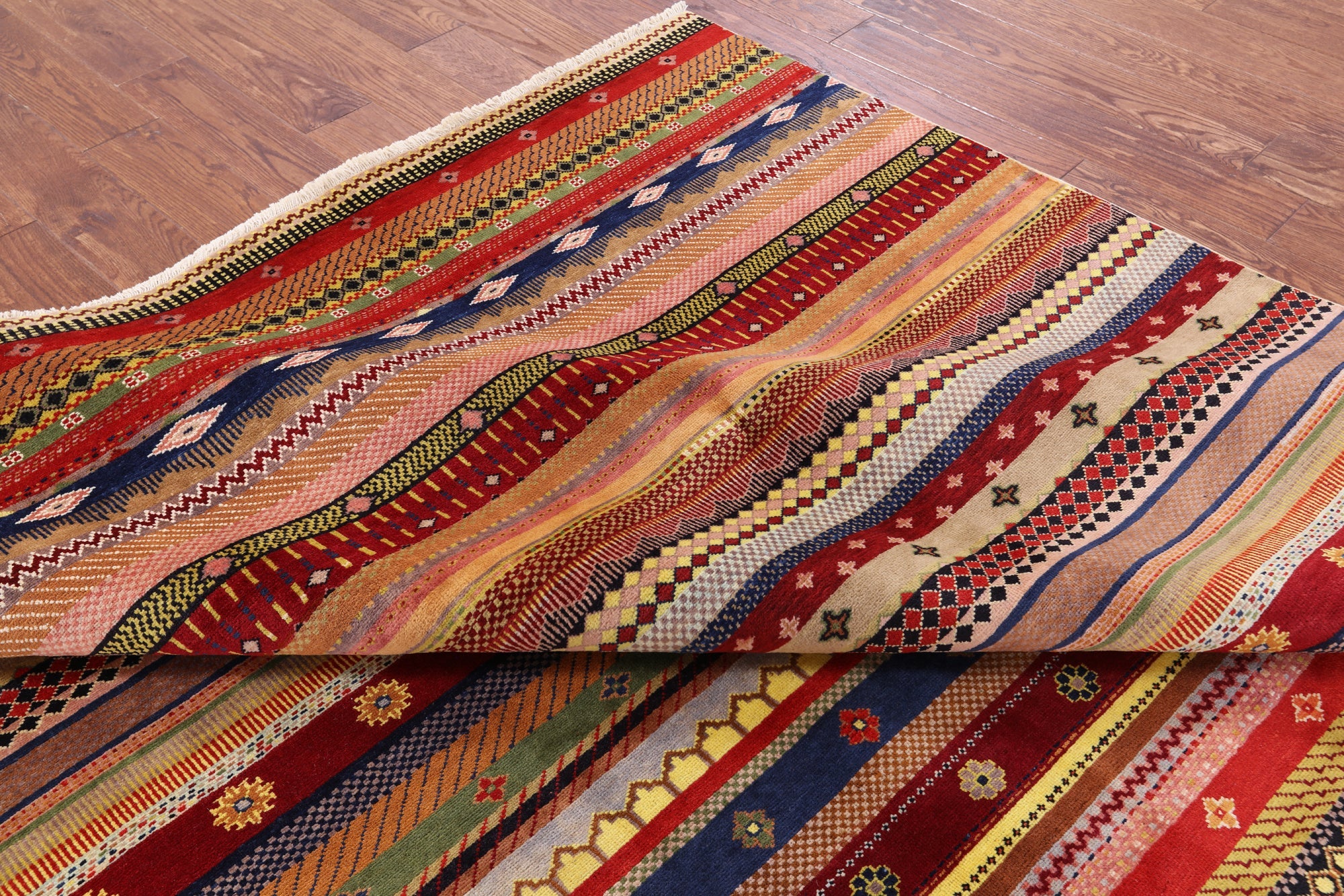 Gabbeh rugs are hand knotted to reflect tribal and other patterns such as solids, and nomadic designs. The simplistic "child-like" bold designs of Gabbeh rugs is what makes them perfectly suitable for any decor. Gabbeh rugs are made from high-quality wool and have a high density of knots. Gabbeh rugs are hand-knotted and eco-friendly, because only natural dyes are used in their production.