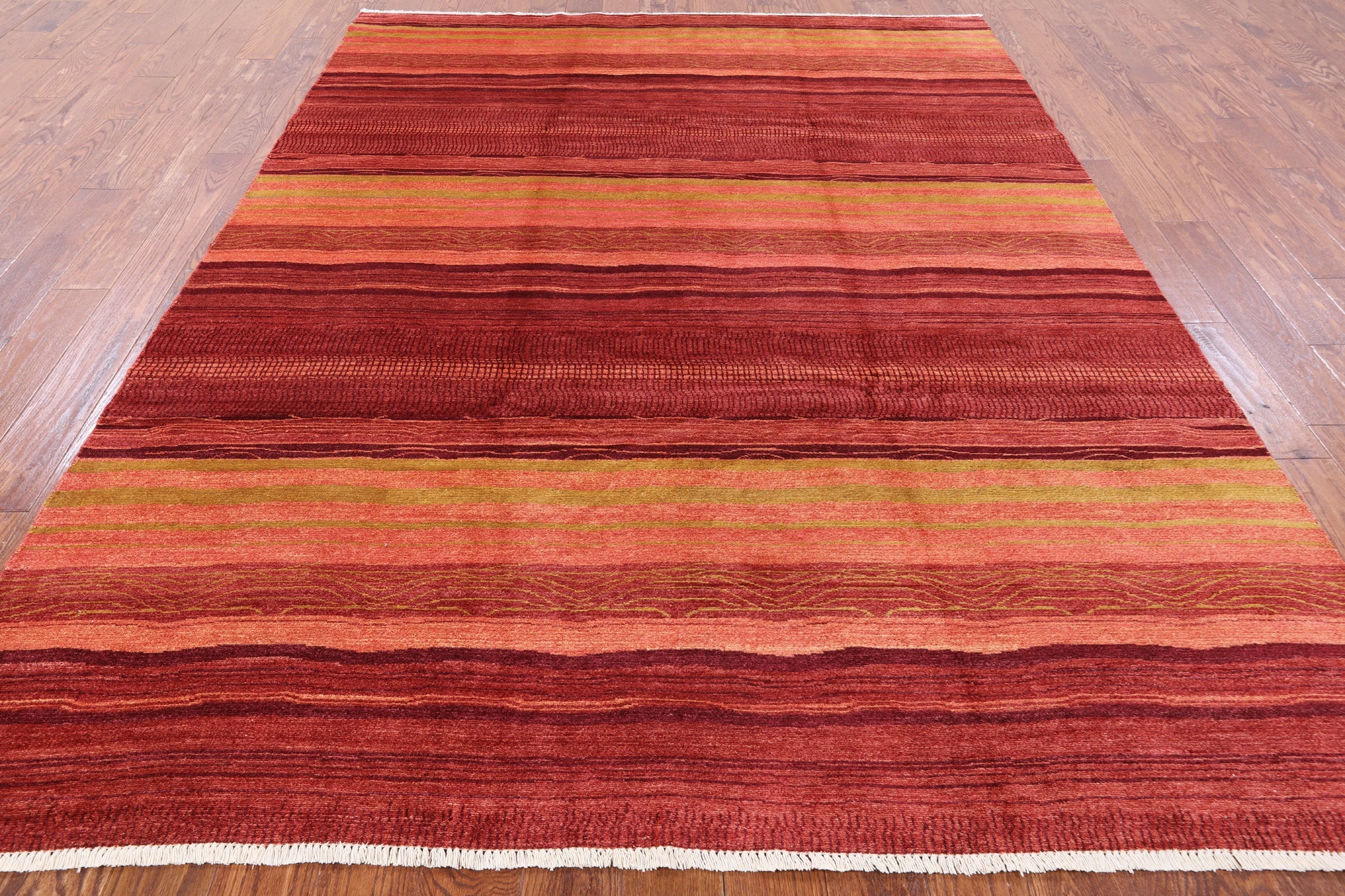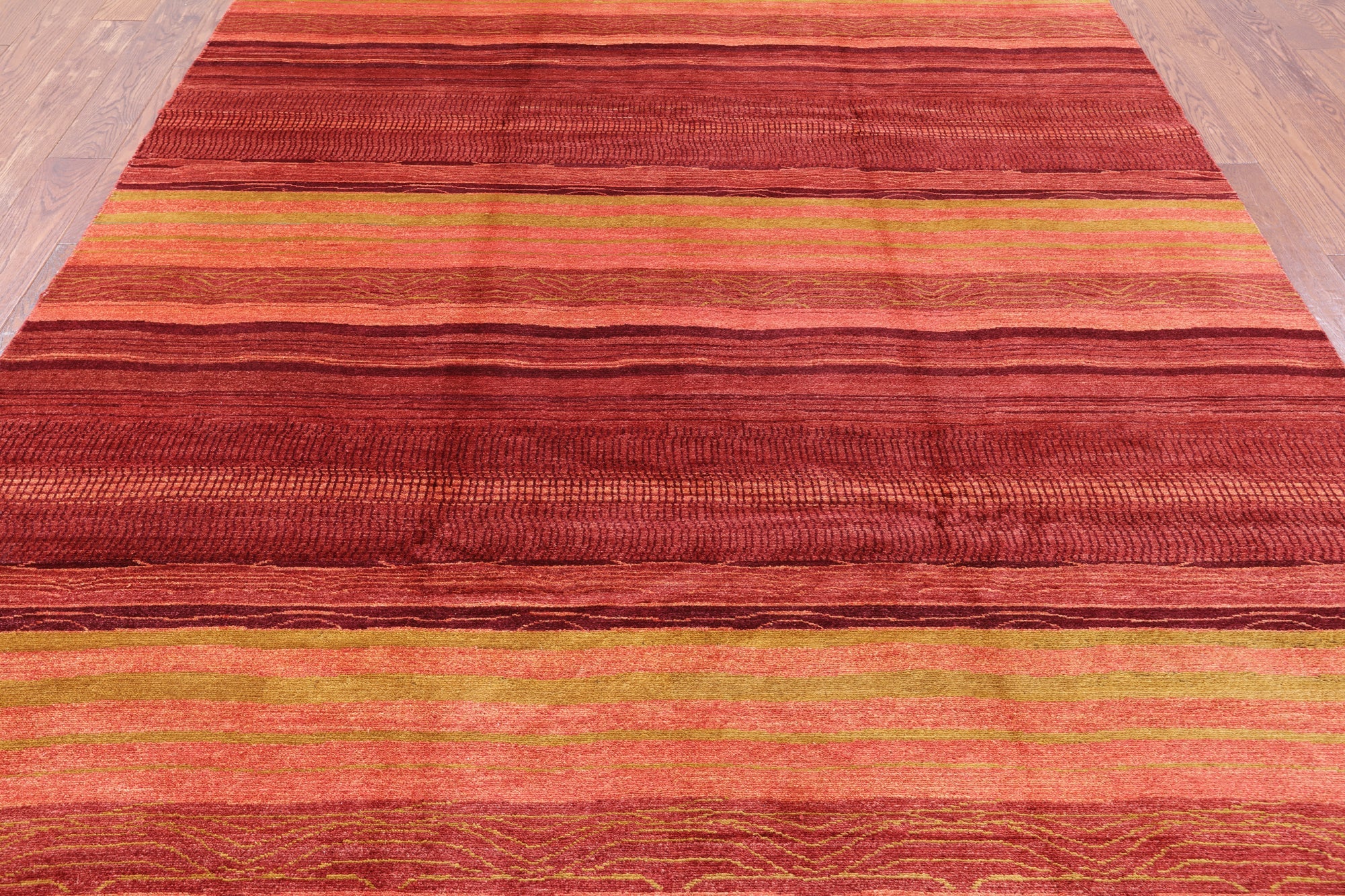 Gabbeh rugs are hand knotted to reflect tribal and other patterns such as solids, and nomadic designs. The simplistic "child-like" bold designs of Gabbeh rugs is what makes them perfectly suitable for any decor. Gabbeh rugs are made from high-quality wool and have a high density of knots. Gabbeh rugs are hand-knotted and eco-friendly, because only natural dyes are used in their production.