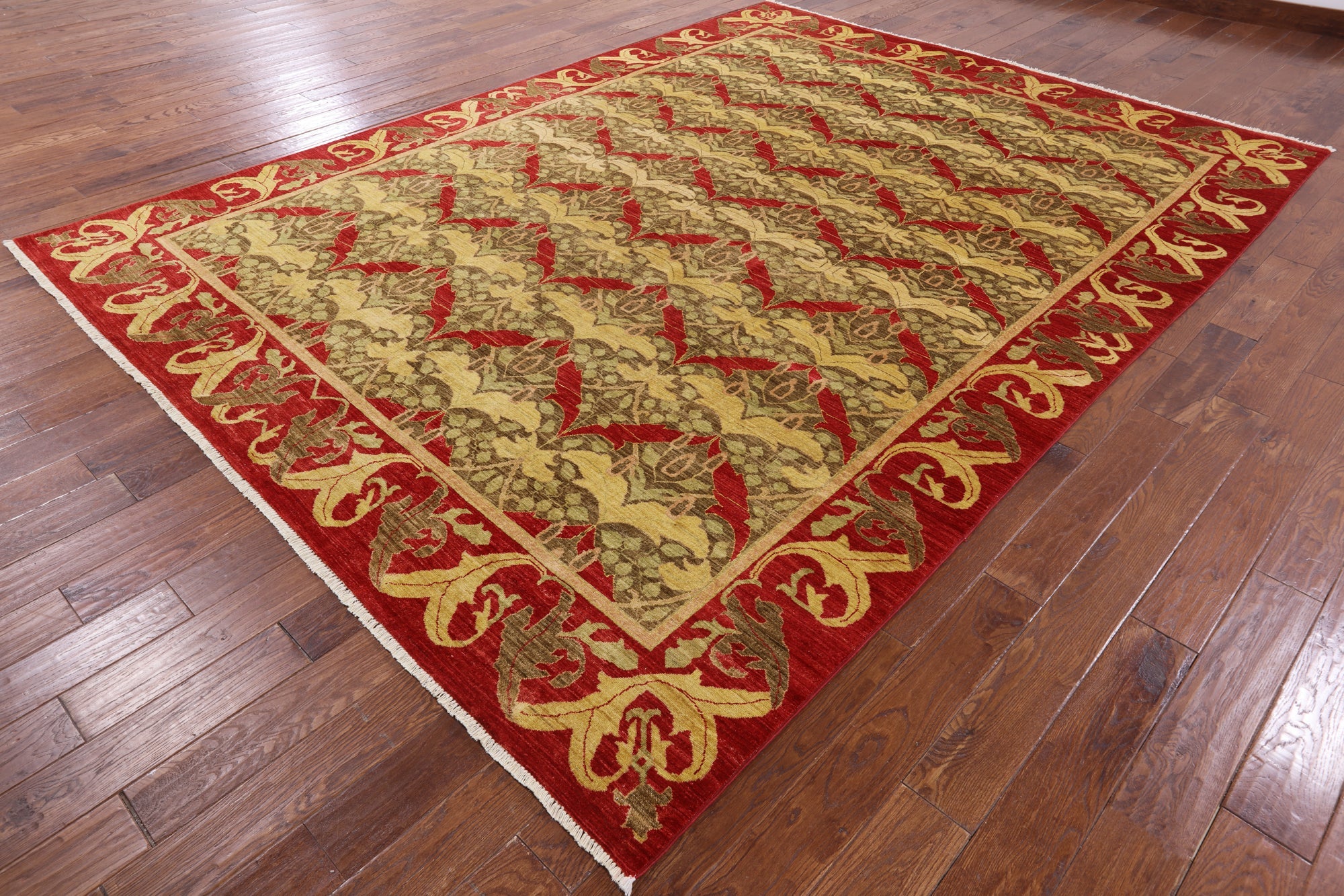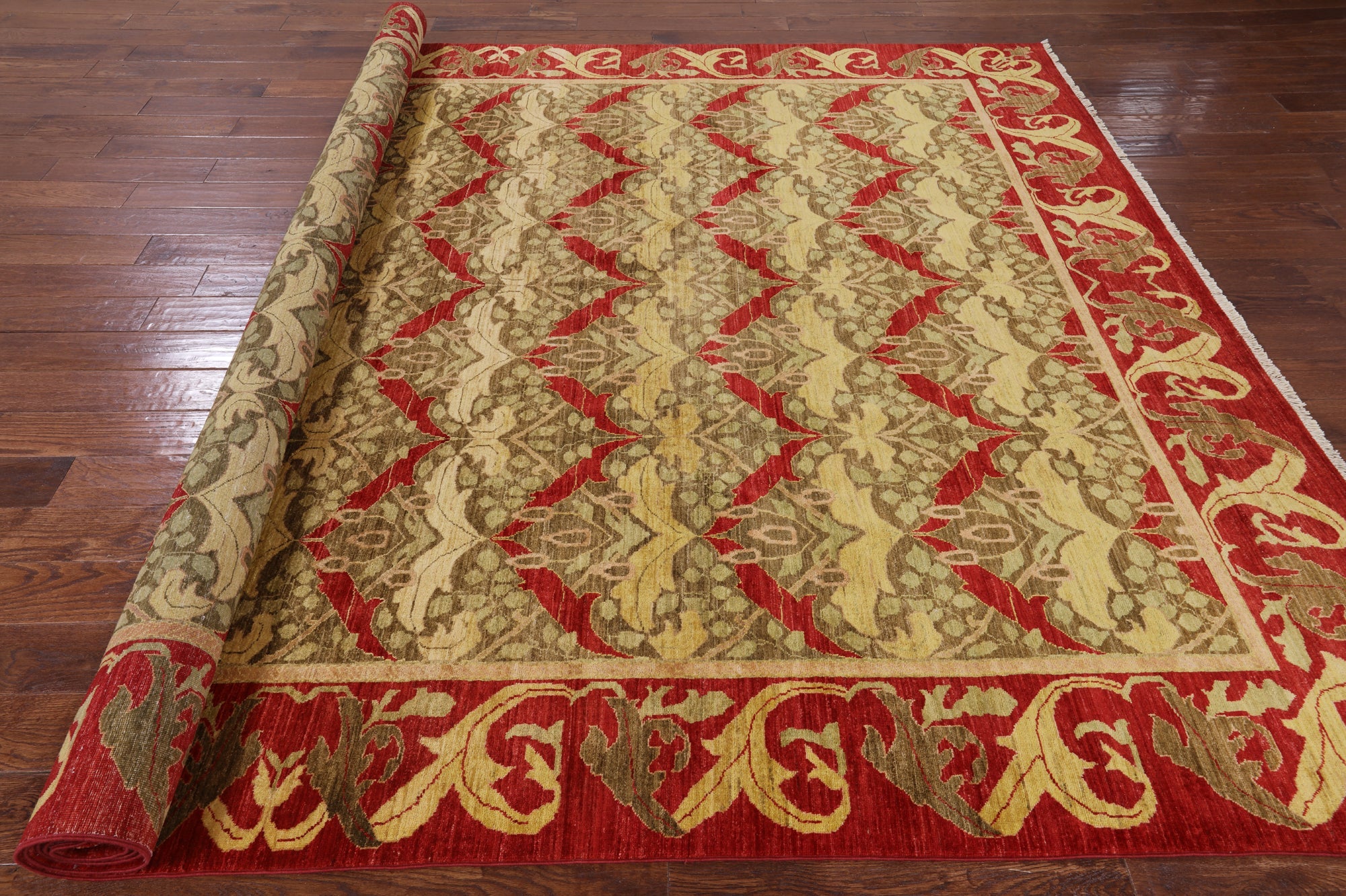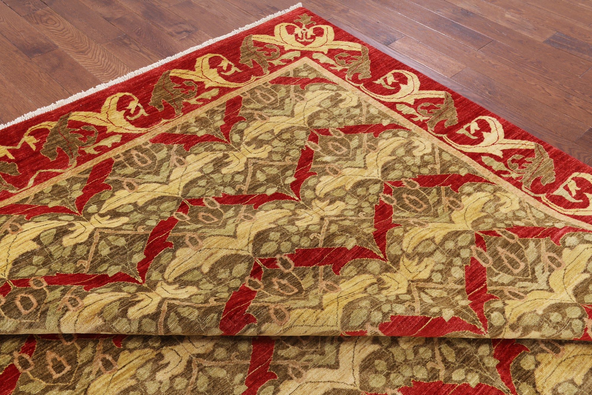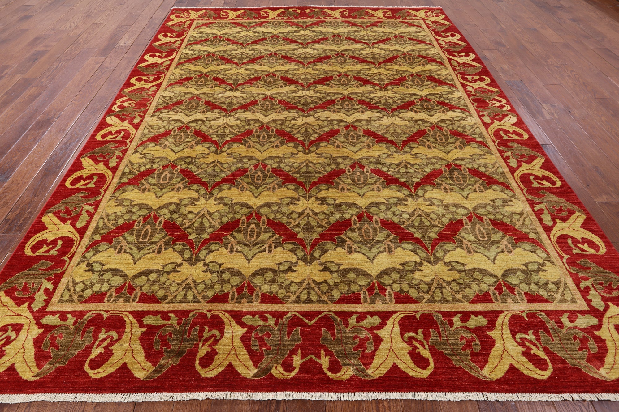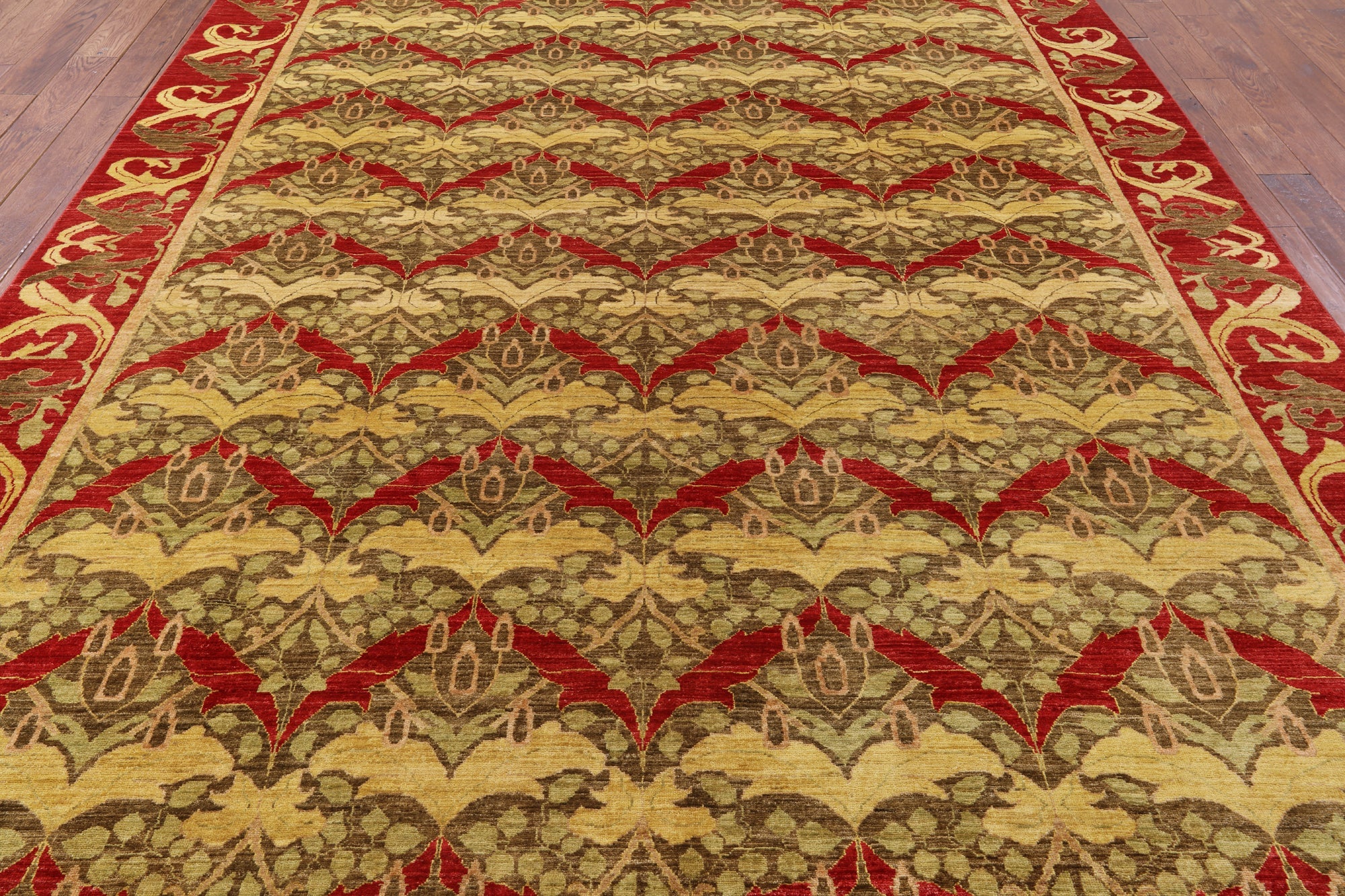 William Morris design are part of arts and crafts movement often including natural forms. These 19th and early 20th century designs are distinctive for their stylized natural forms, their symmetry and their vibrant colors. William Morris patterns are based on nature such thistles, ginkgo leaves, willow trees and flowers. These modern hand knotted rugs are woven with high quality wool, silk or both.