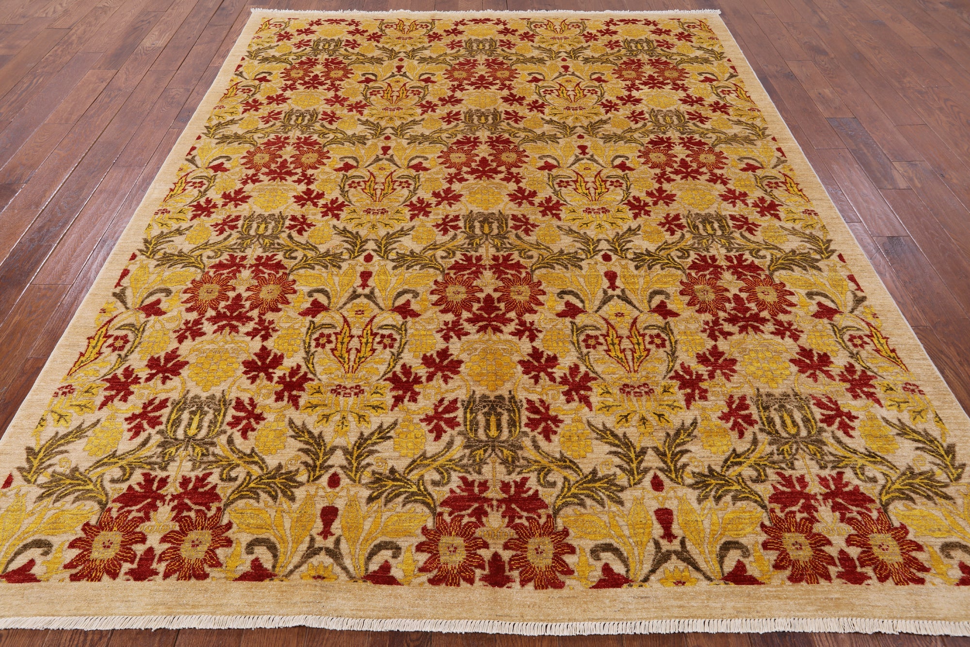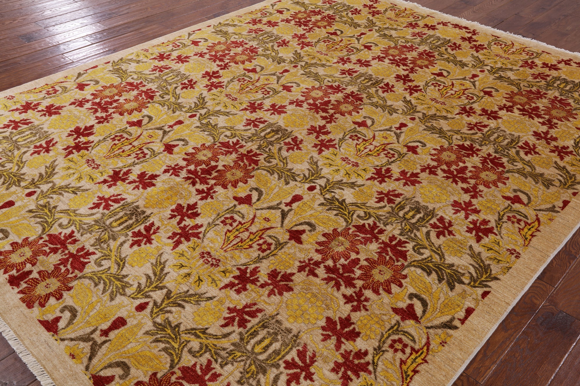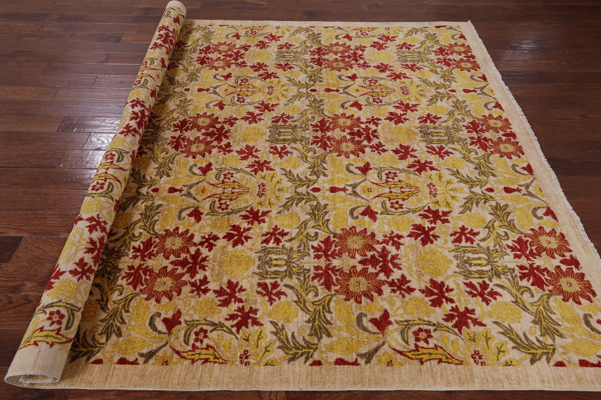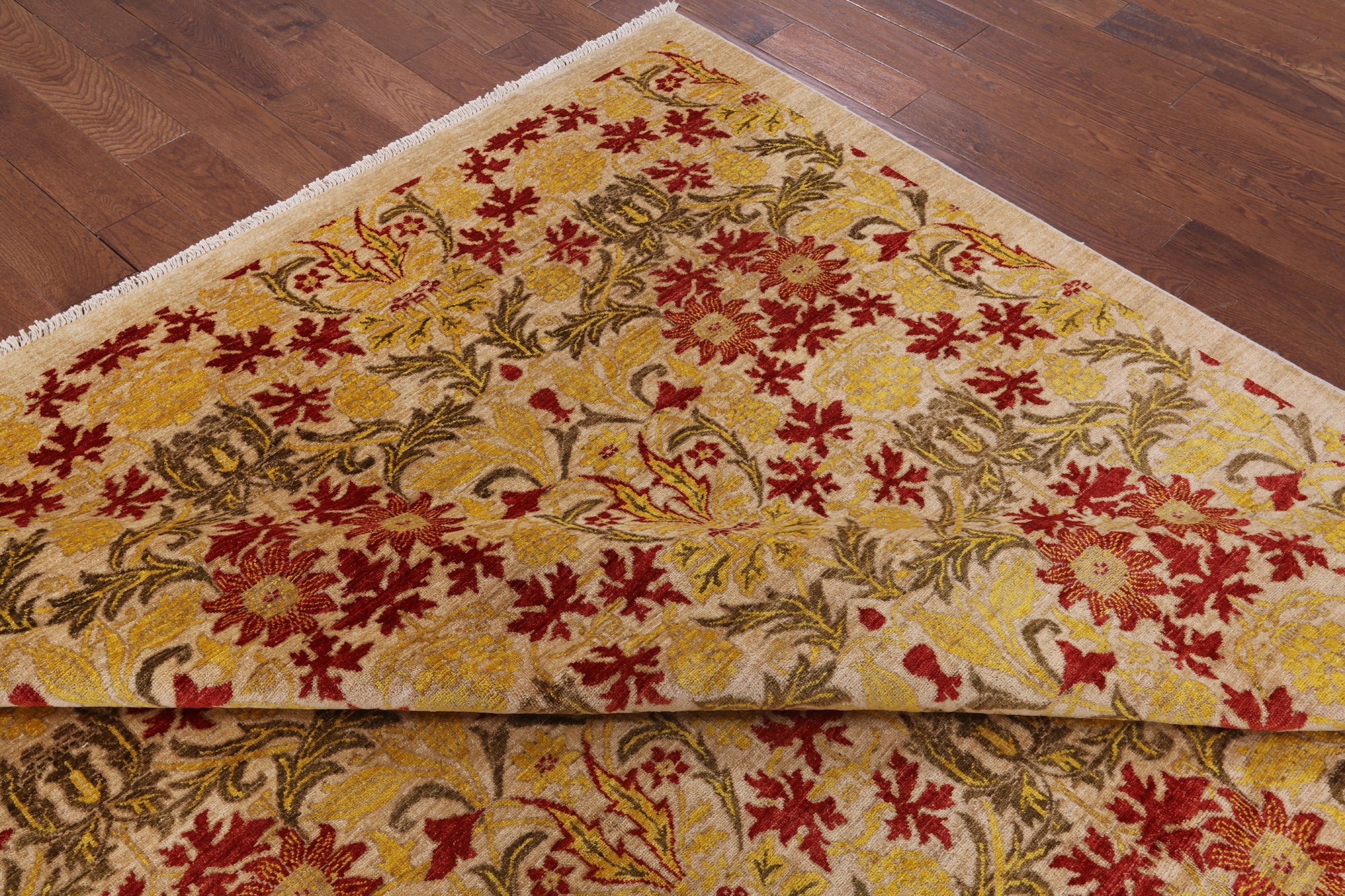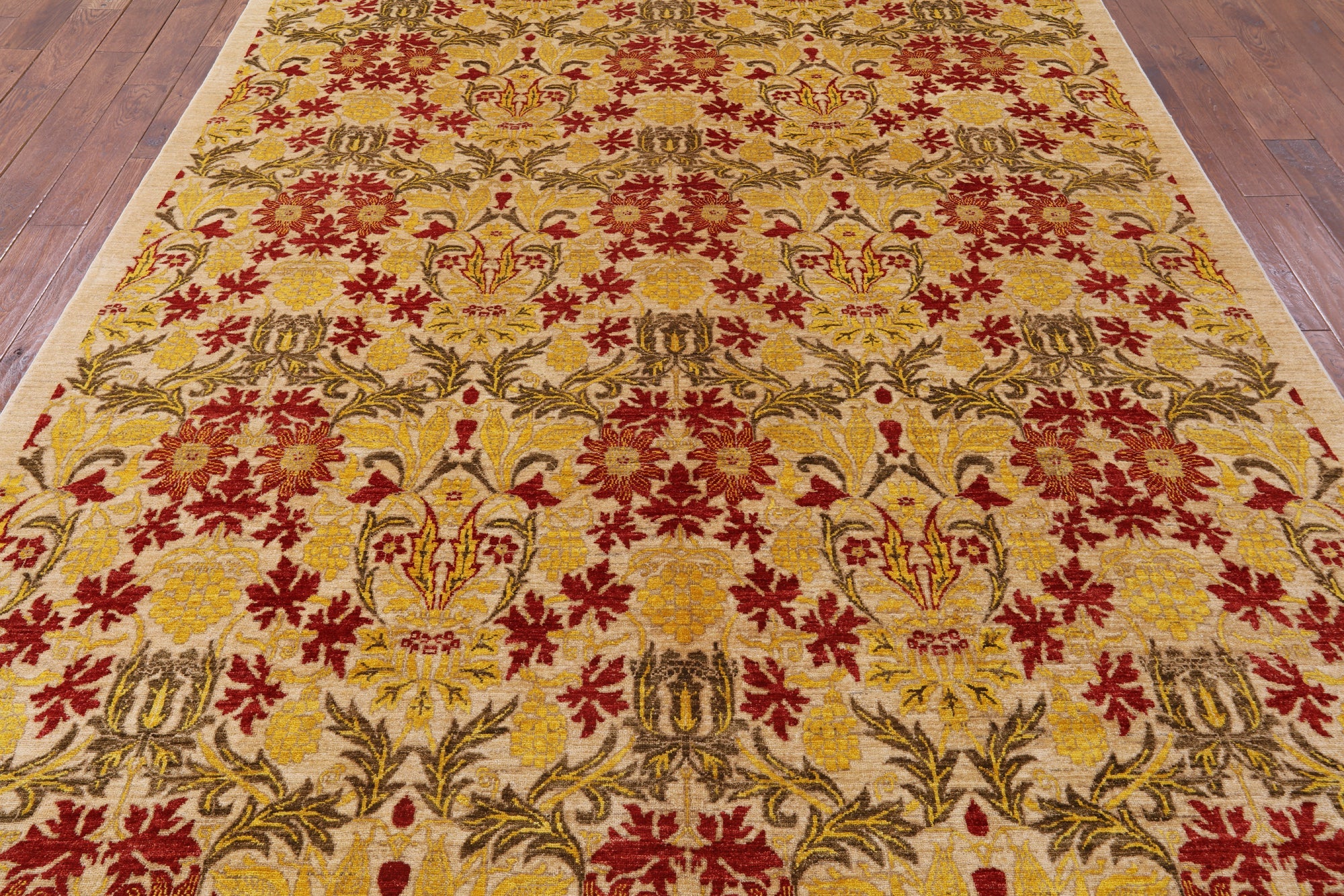 William Morris design are part of arts and crafts movement often including natural forms. These 19th and early 20th century designs are distinctive for their stylized natural forms, their symmetry and their vibrant colors. William Morris patterns are based on nature such thistles, ginkgo leaves, willow trees and flowers. These modern hand knotted rugs are woven with high quality wool, silk or both.