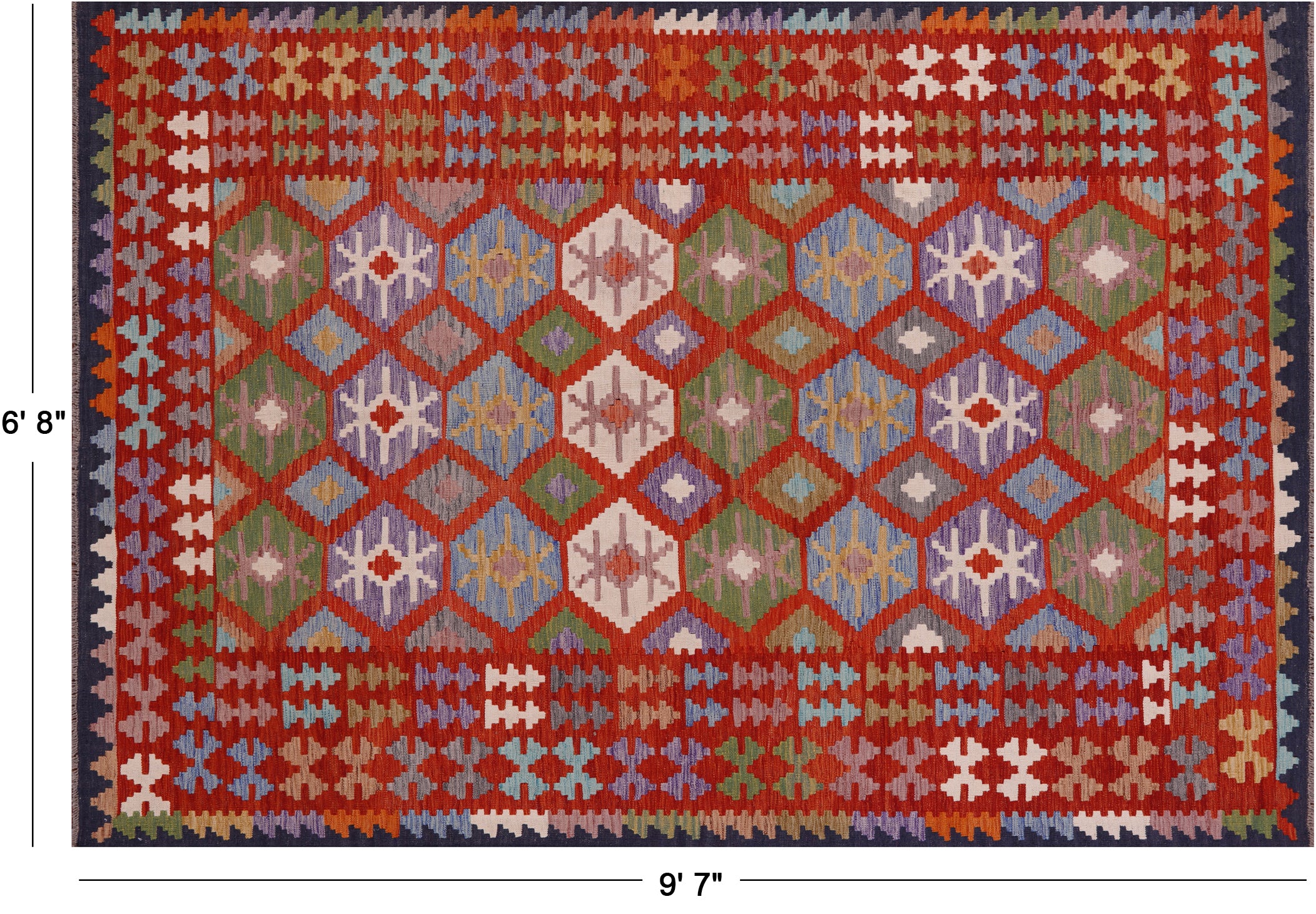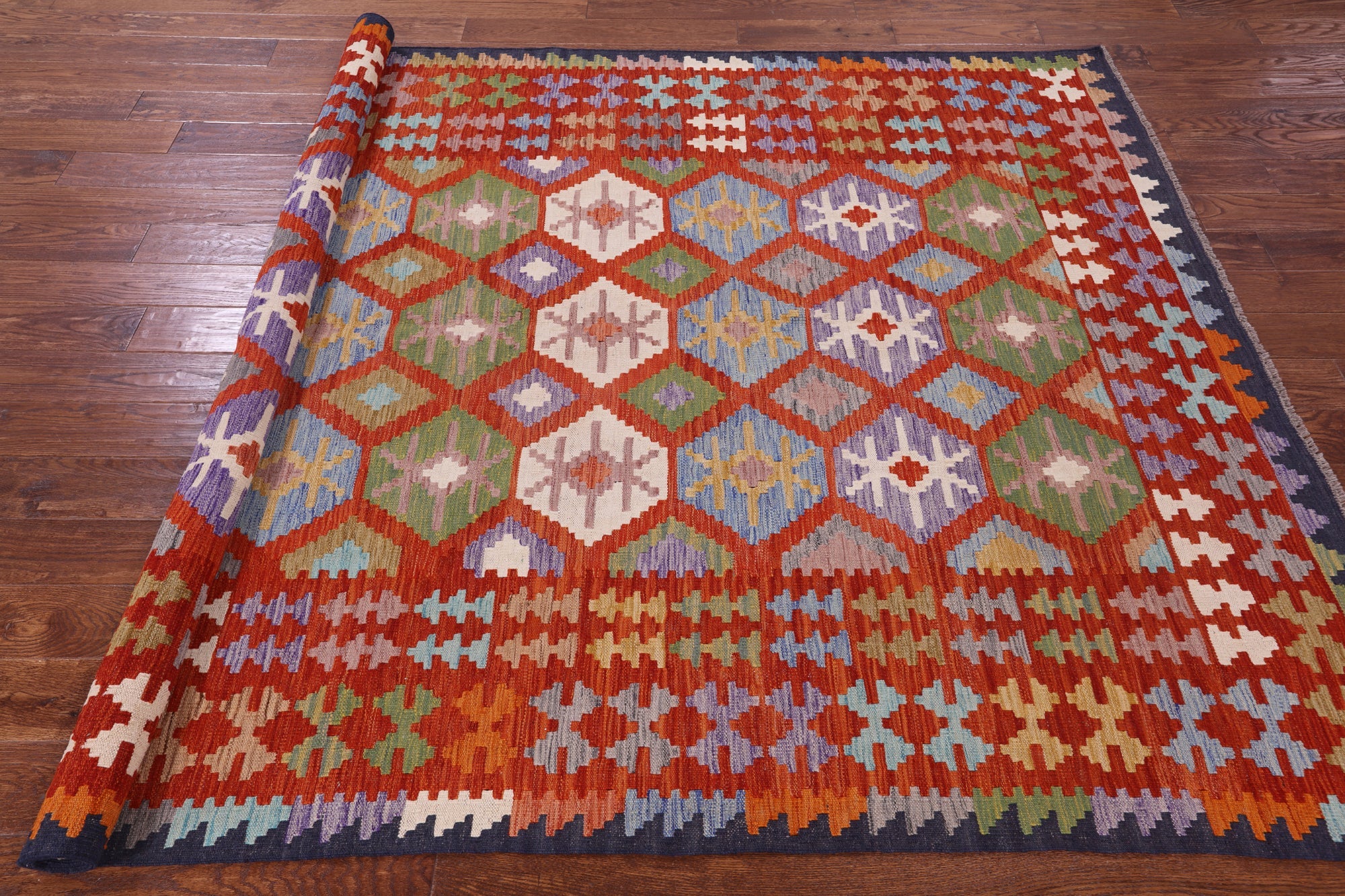 Wool On Wool Reversible Kilim Flat Weave Rug 6' 8" X 9' 7" - Q17848 is backordered and will ship as soon as it is back in stock.