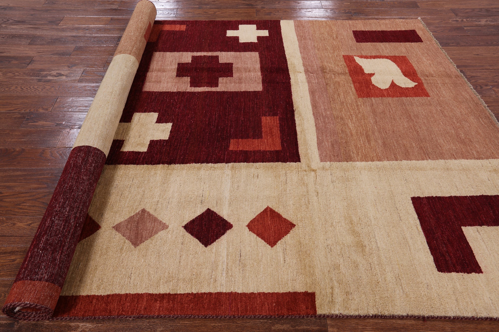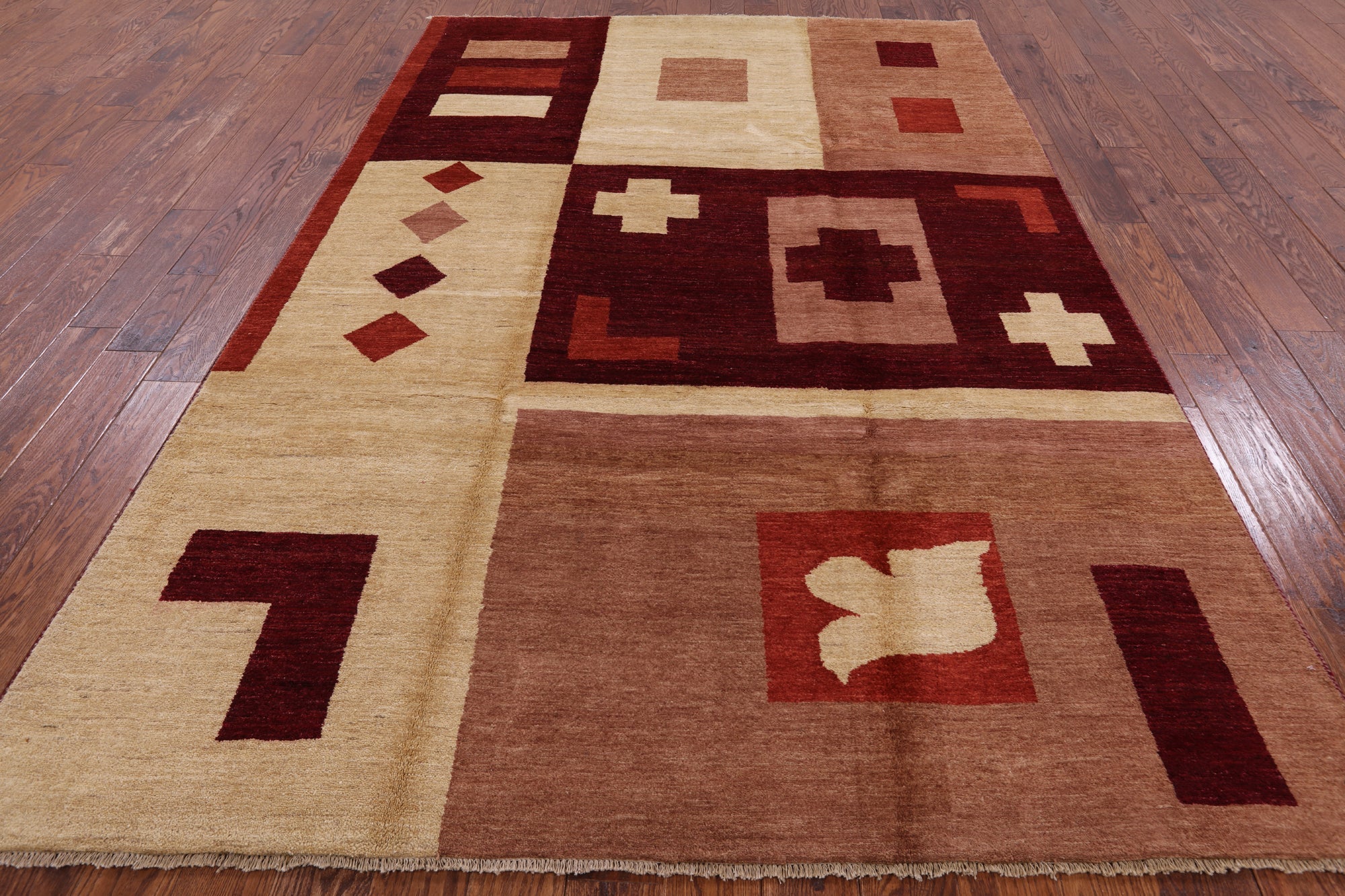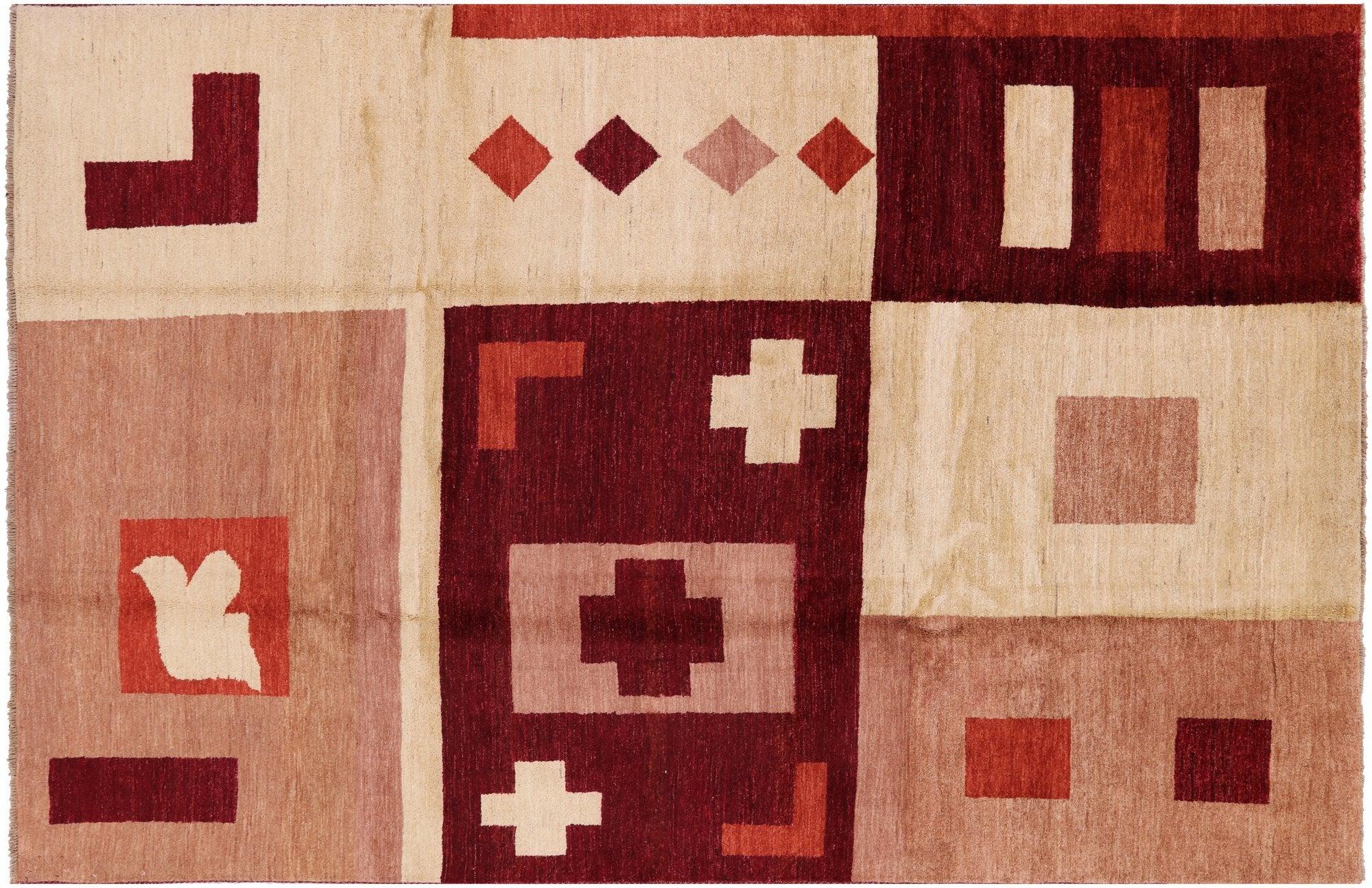 Gabbeh rugs are hand knotted to reflect tribal and other patterns such as solids, and nomadic designs. The simplistic "child-like" bold designs of Gabbeh rugs is what makes them perfectly suitable for any decor. Gabbeh rugs are made from high-quality wool and have a high density of knots. Gabbeh rugs are hand-knotted and eco-friendly, because only natural dyes are used in their production.