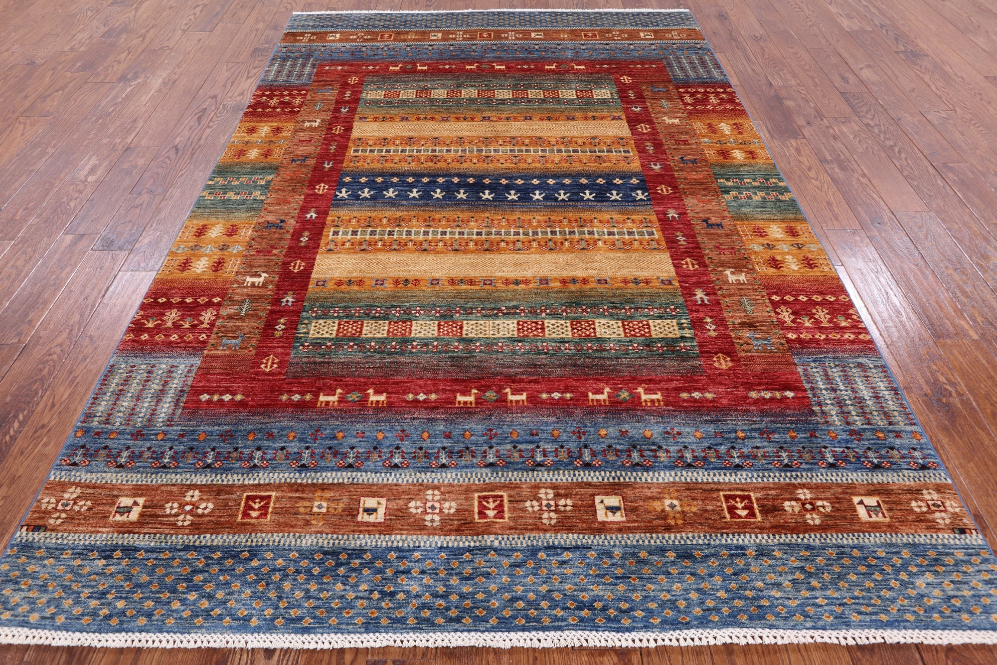 Gabbeh rugs are hand-spun wool in both the pile and the foundation, as well as all natural dyes. Simple, colorful geometric patterns, abstract scenery, child-like representations of people and animals, different colors, reds, blue, greens ,yellow, purple. Modern technology has improved the dye process to allow a wider range of colors as well as more stable and easier to care for colors.