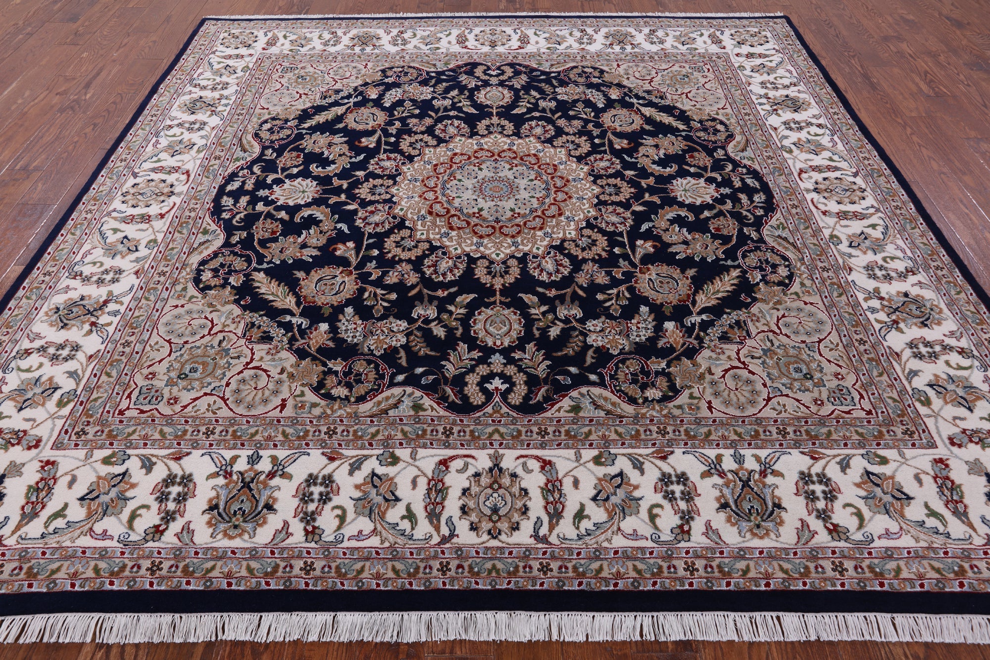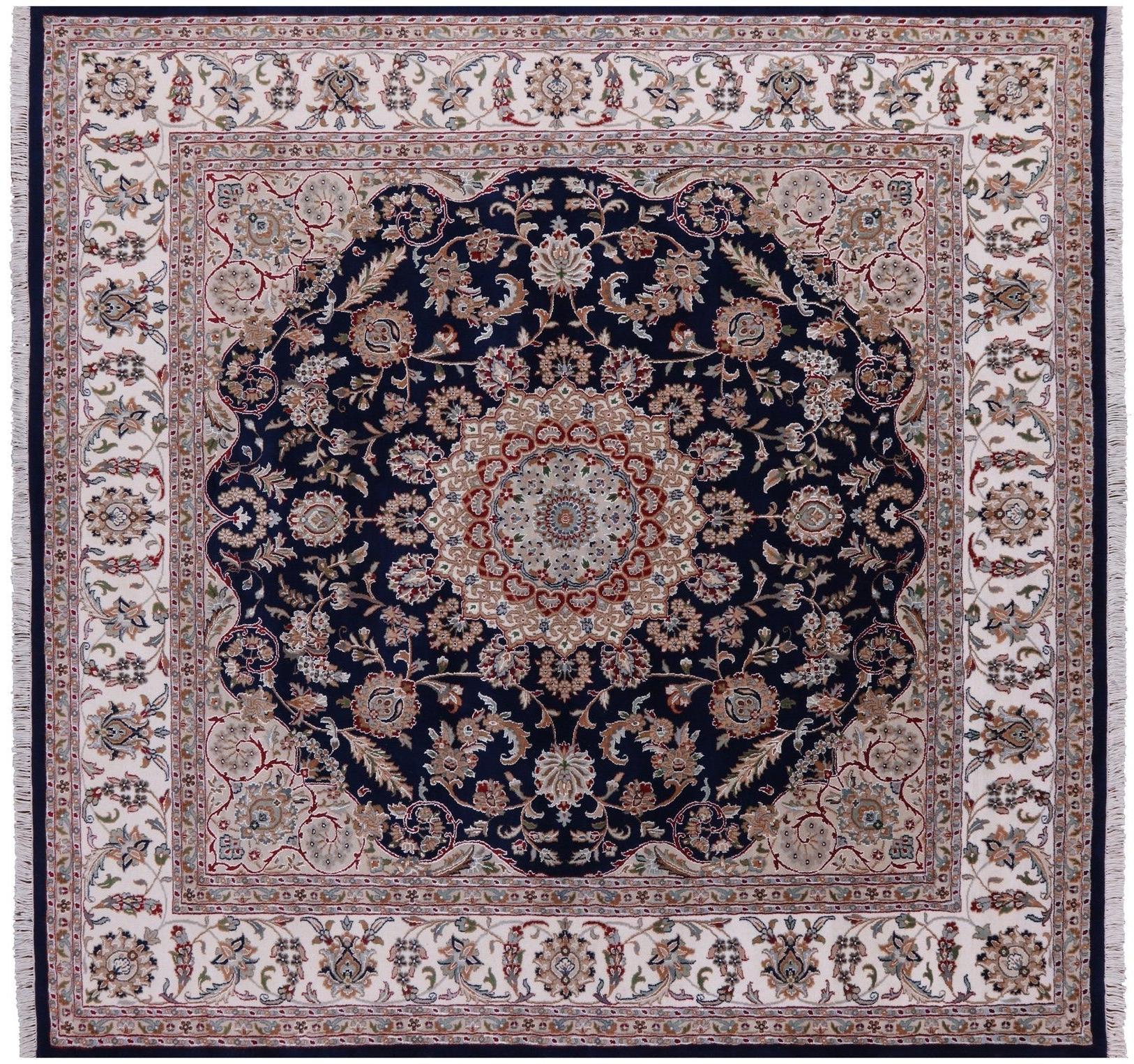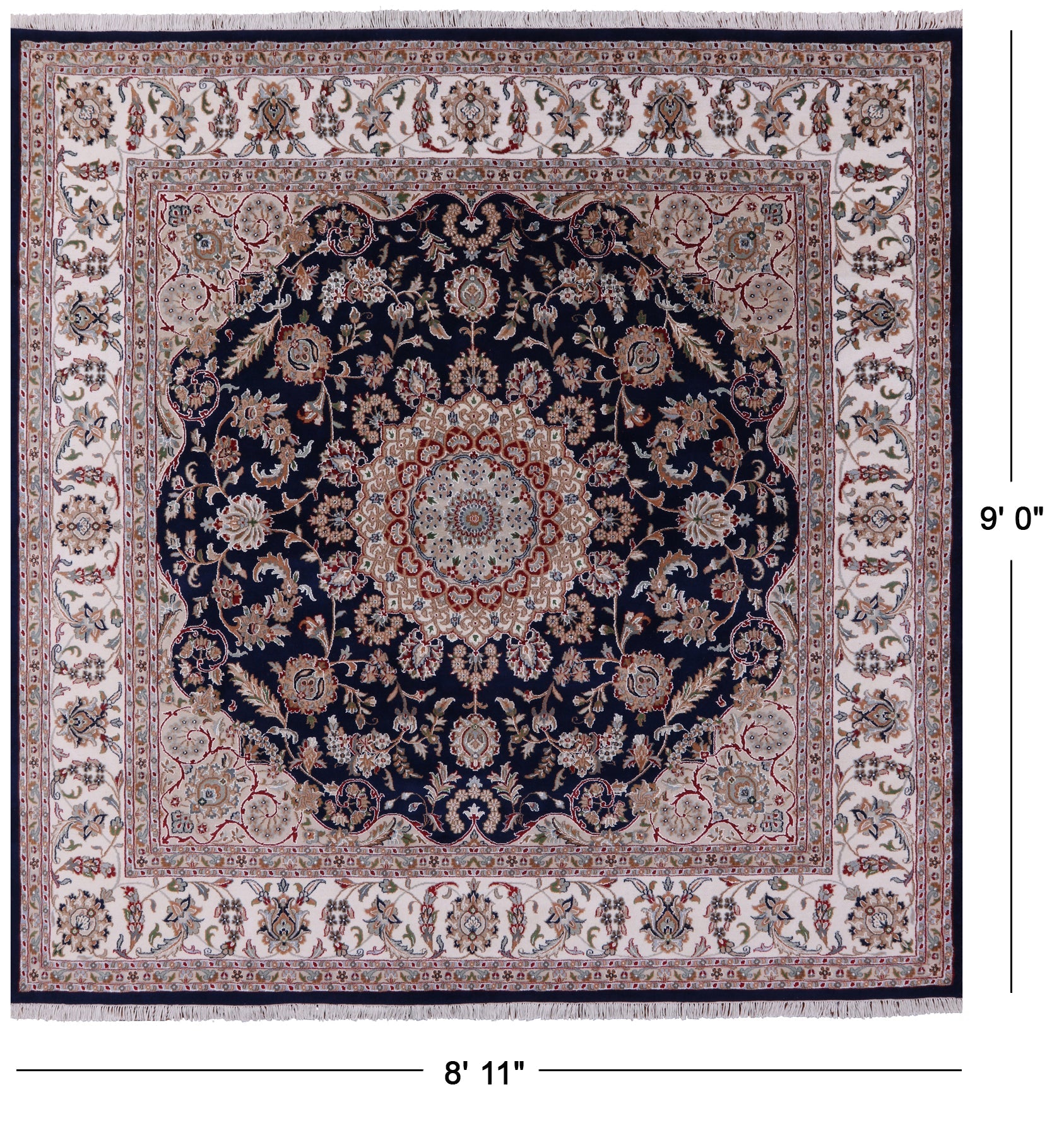 Navy Blue 9' Square Persian Nain Hand Knotted Wool & Silk Rug - Q9323