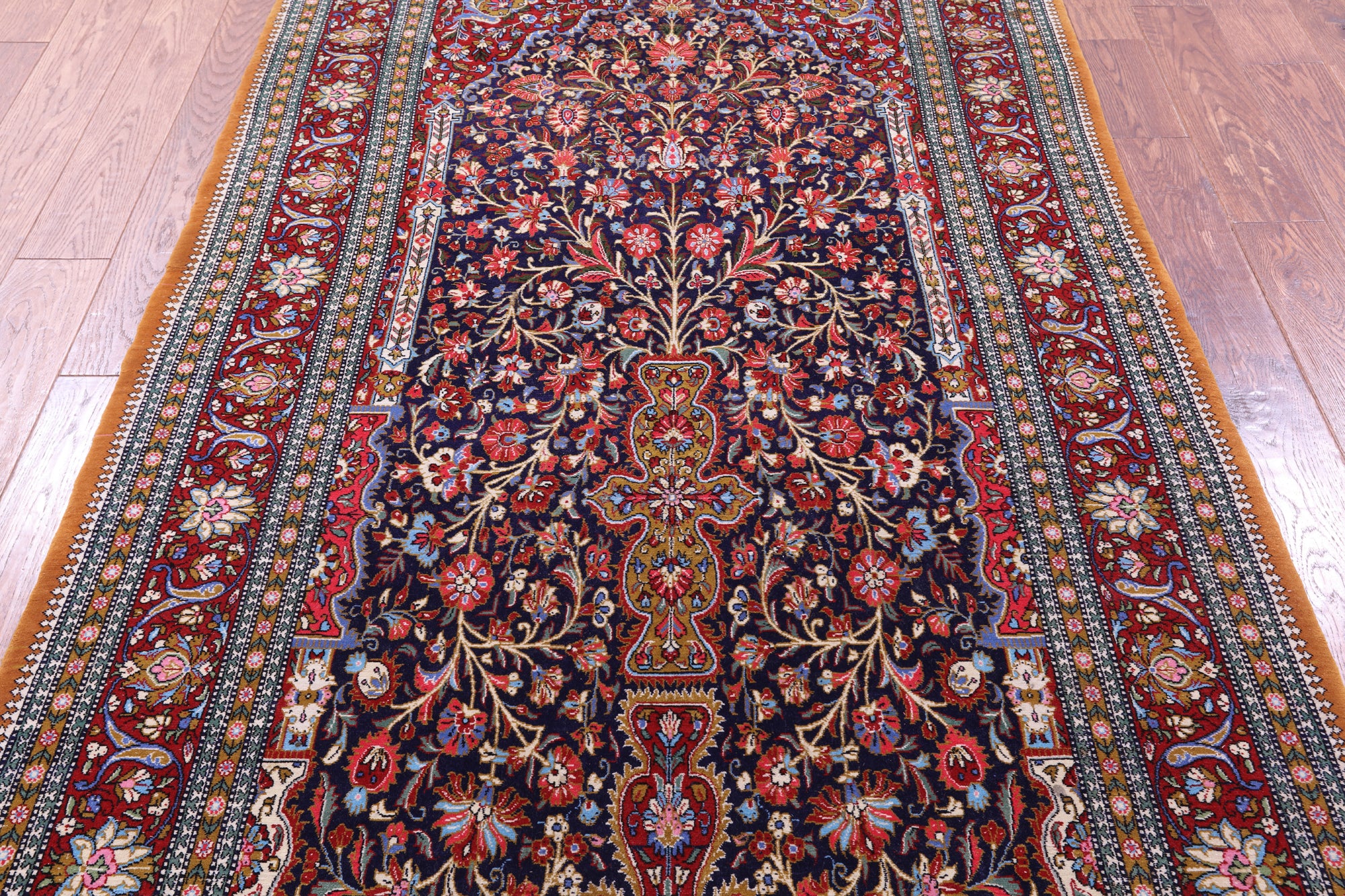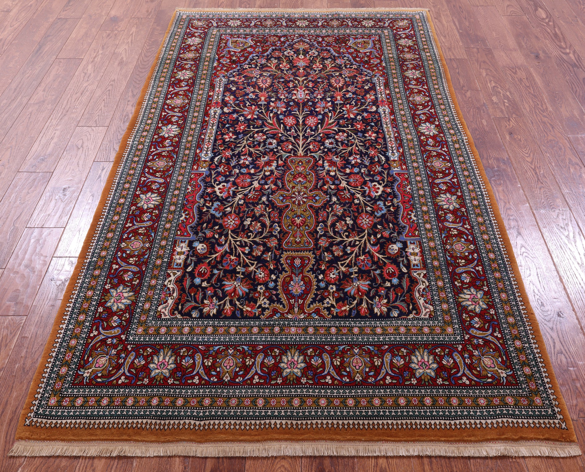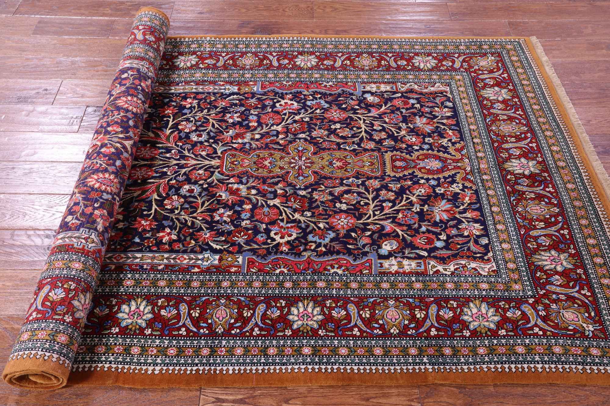 Qum rugs are known for their fine craftsmanship, intricate patterns, and exceptional detail. Typically woven with high-quality wool, these rugs often feature graceful floral or medallion designs in shades of red, blue, ivory, and other soft tones. Their refined look and precise weaving make them a popular choice for adding elegance and character to any space.