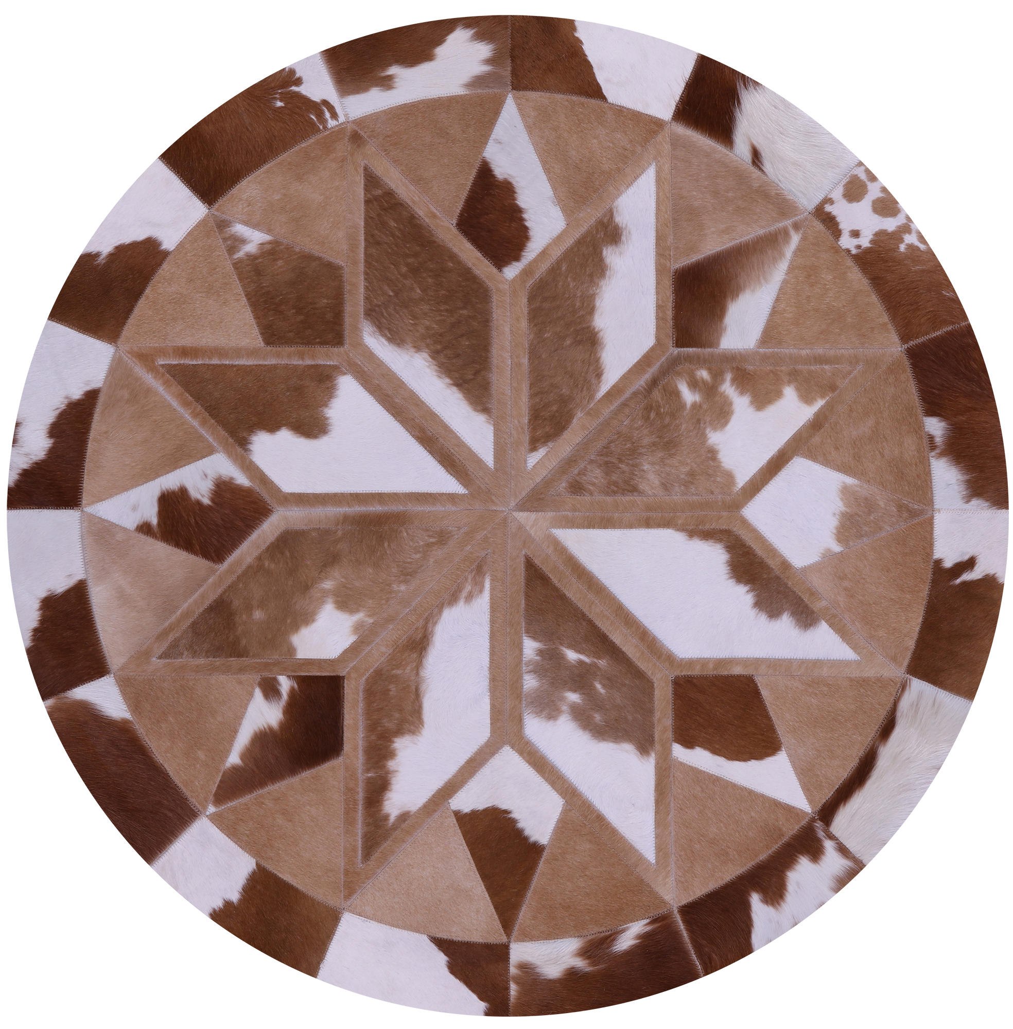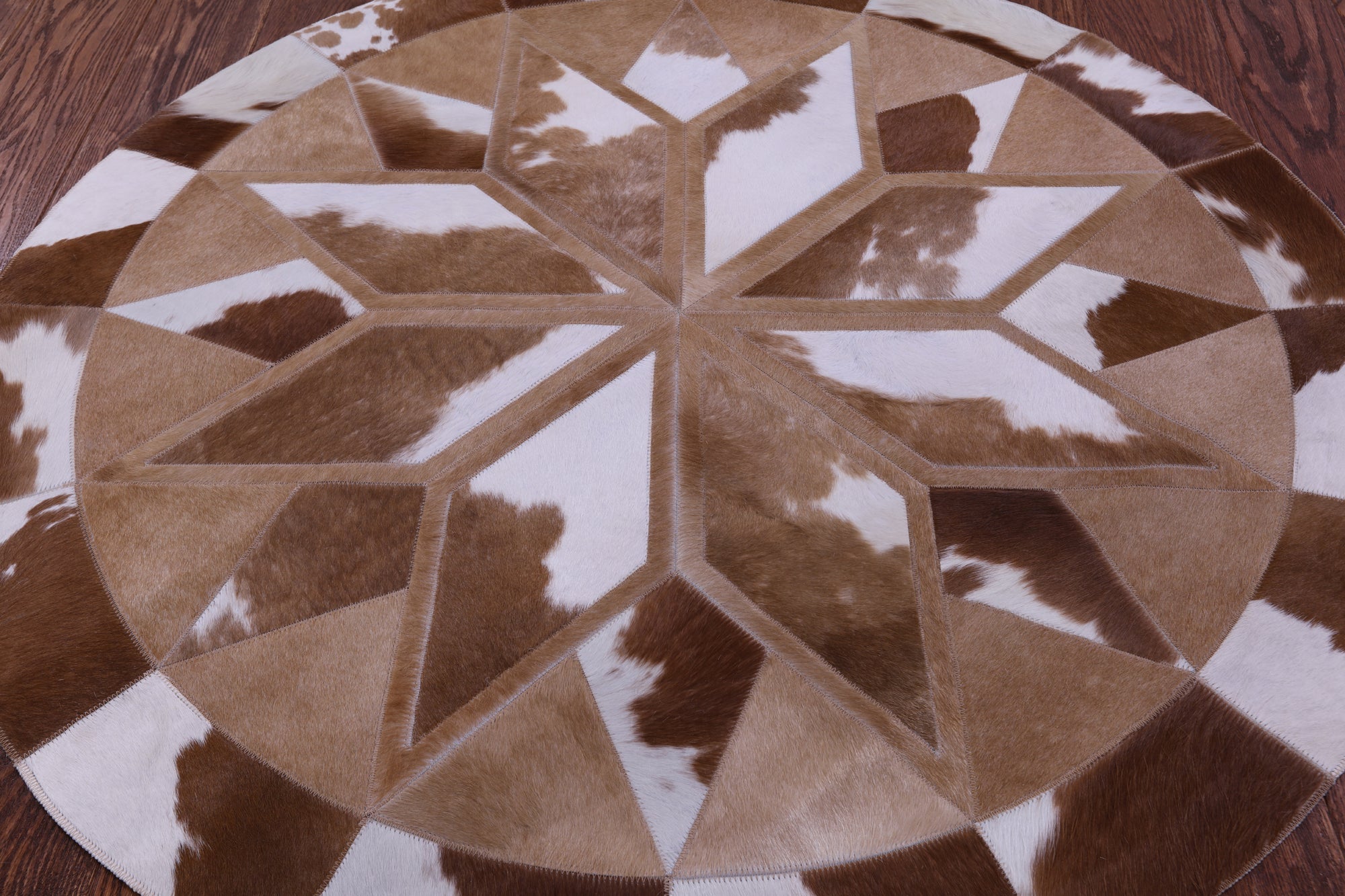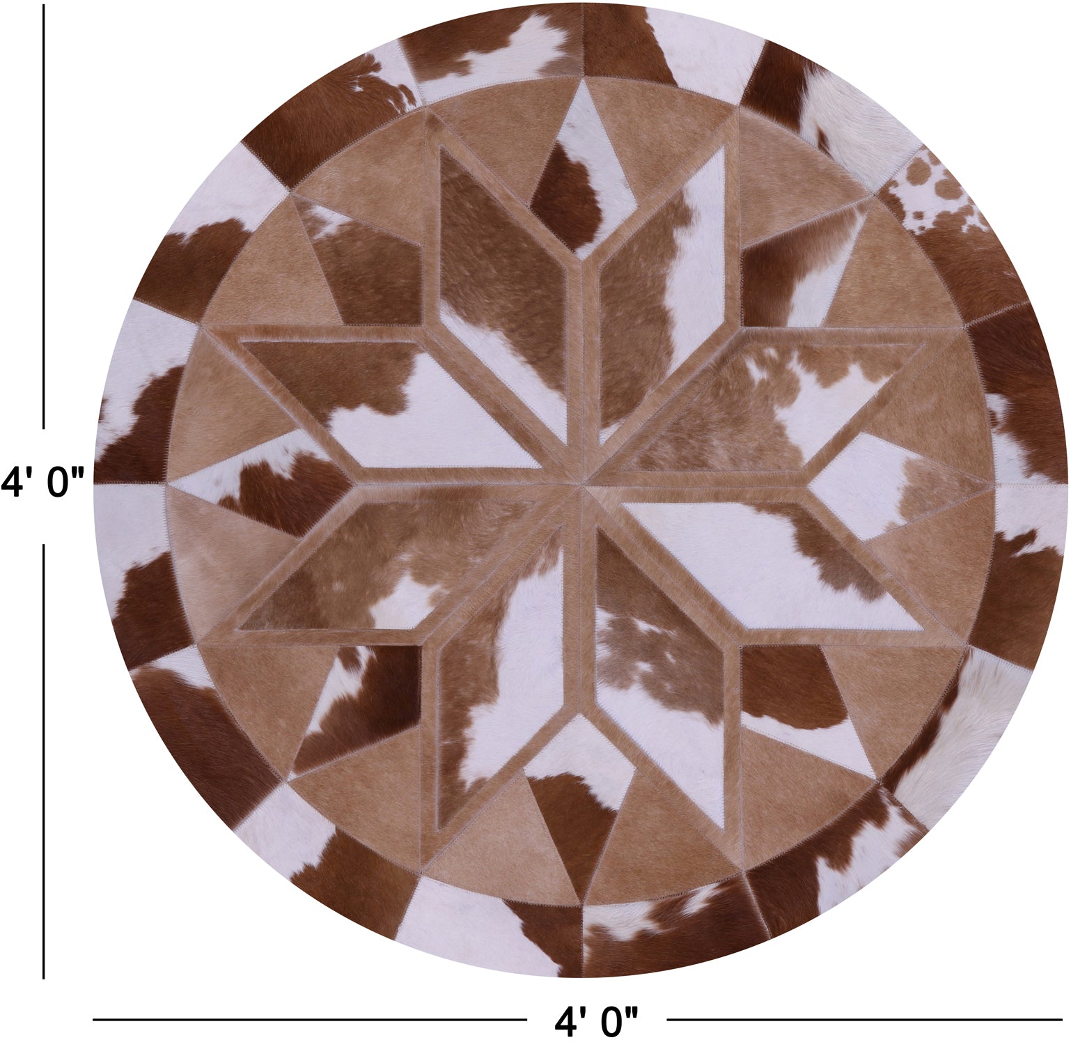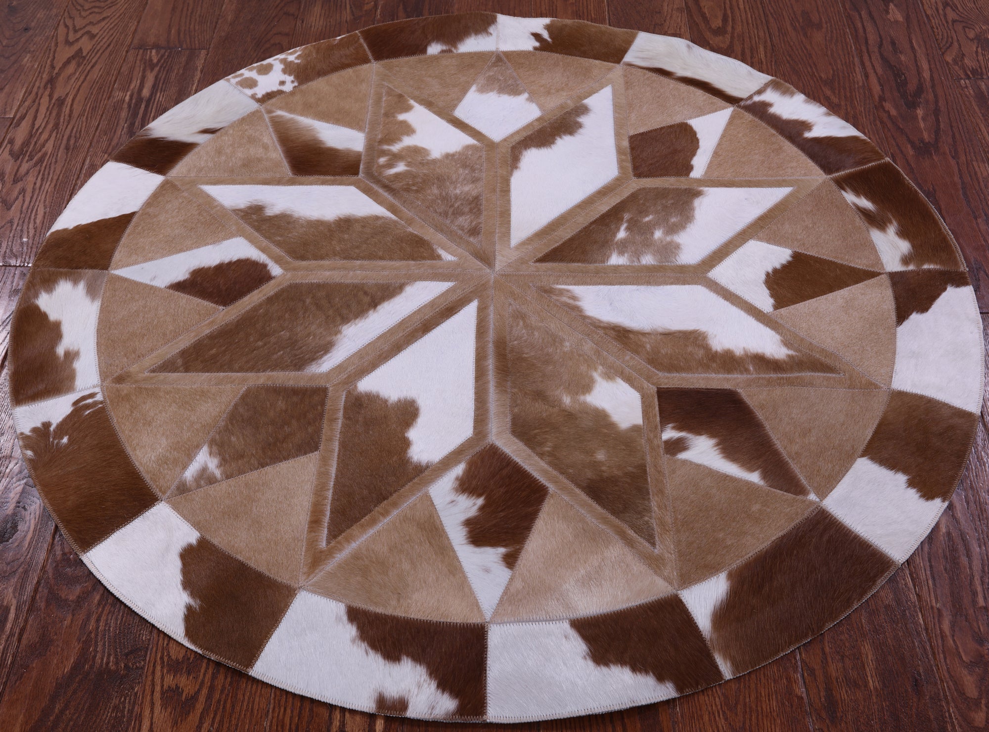 4' 0" X 4' 0" Brown & White Round Star Natural Cowhide Hand Stitched Rug - C3506 is backordered and will ship as soon as it is back in stock.