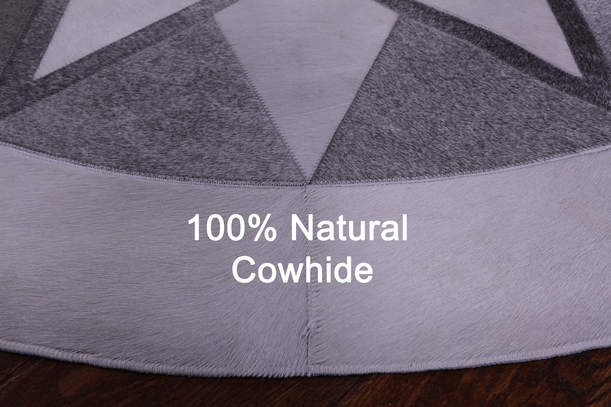 5' 0" X 5' 0" Grey & White Round Natural Cowhide Hand Stitched Rug - C3547 is backordered and will ship as soon as it is back in stock.