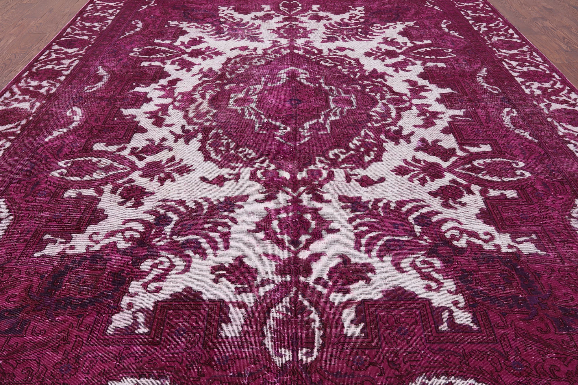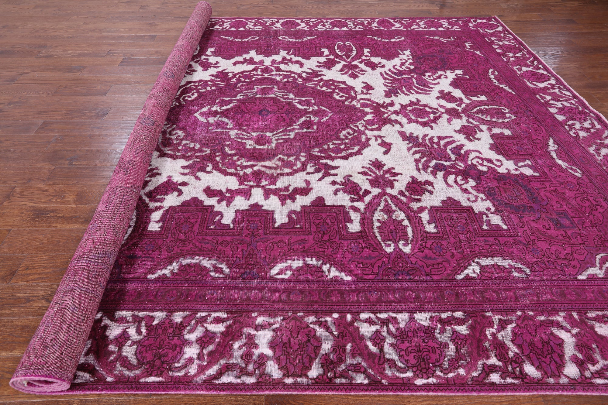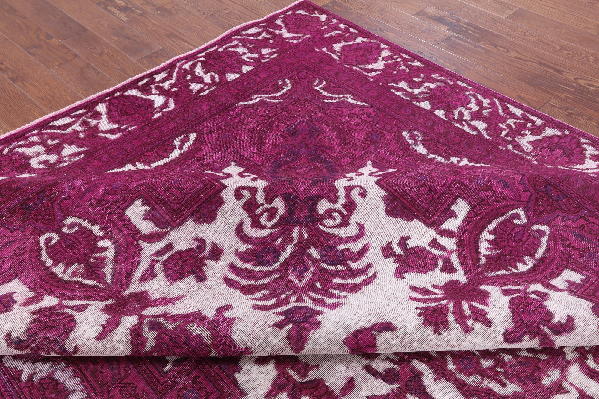 Overdyed rugs have become popular, because of their vibrant colors and vintage look. Each one is unique; there are no two alike. They are hand knotted and are made through a natural dye process. After this process is completed the end result is an oversaturated color.