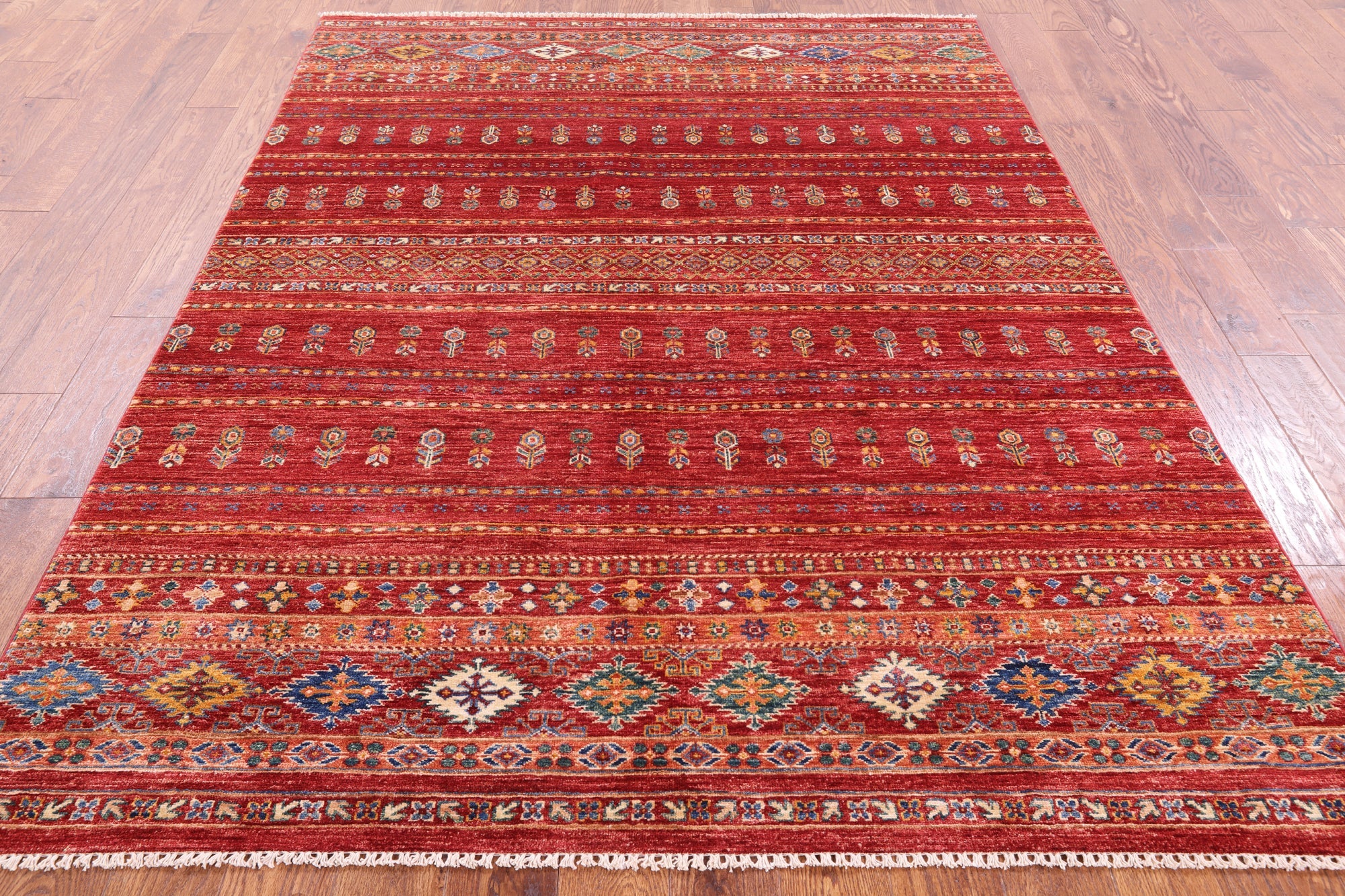 Red Super Kazak Khorjin Hand-Knotted Wool Rug 5' 10" X 7' 10" - Q5349 is backordered and will ship as soon as it is back in stock.