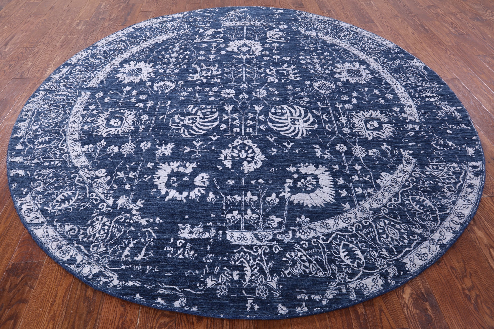 Blue 8' Round Wool & Silk Persian Tabriz Hand-Knotted Rug - Q6942