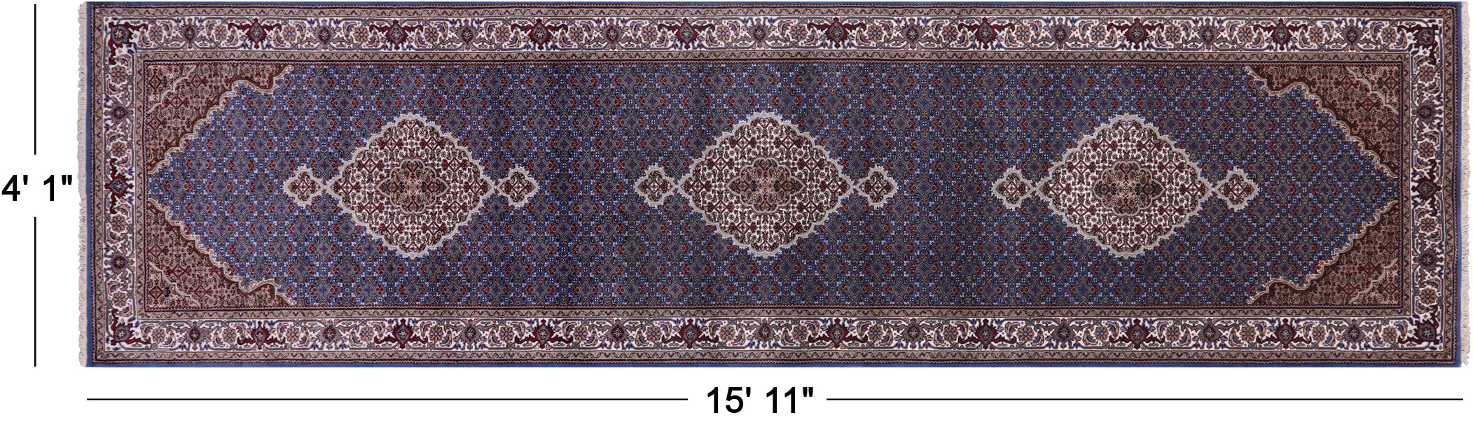 Blue 4' 1" X 15' 11" Wool & Silk Persian Tabriz Handmade Runner Rug - Q13020