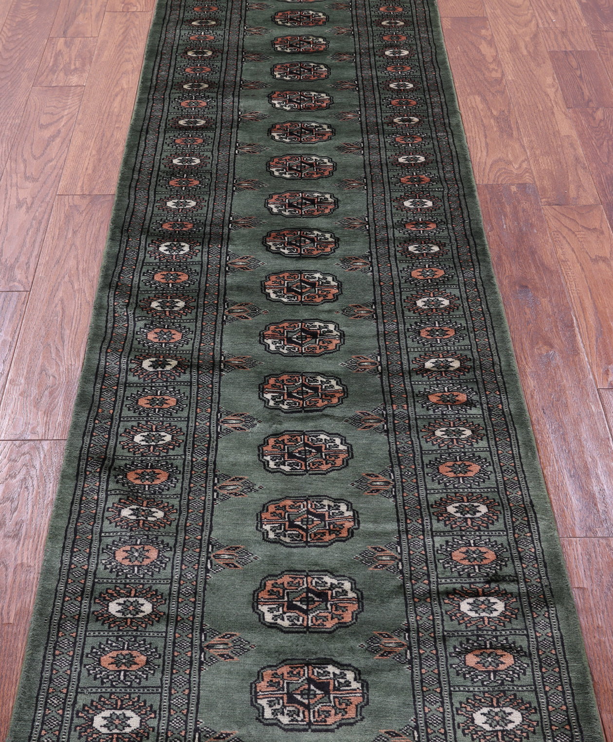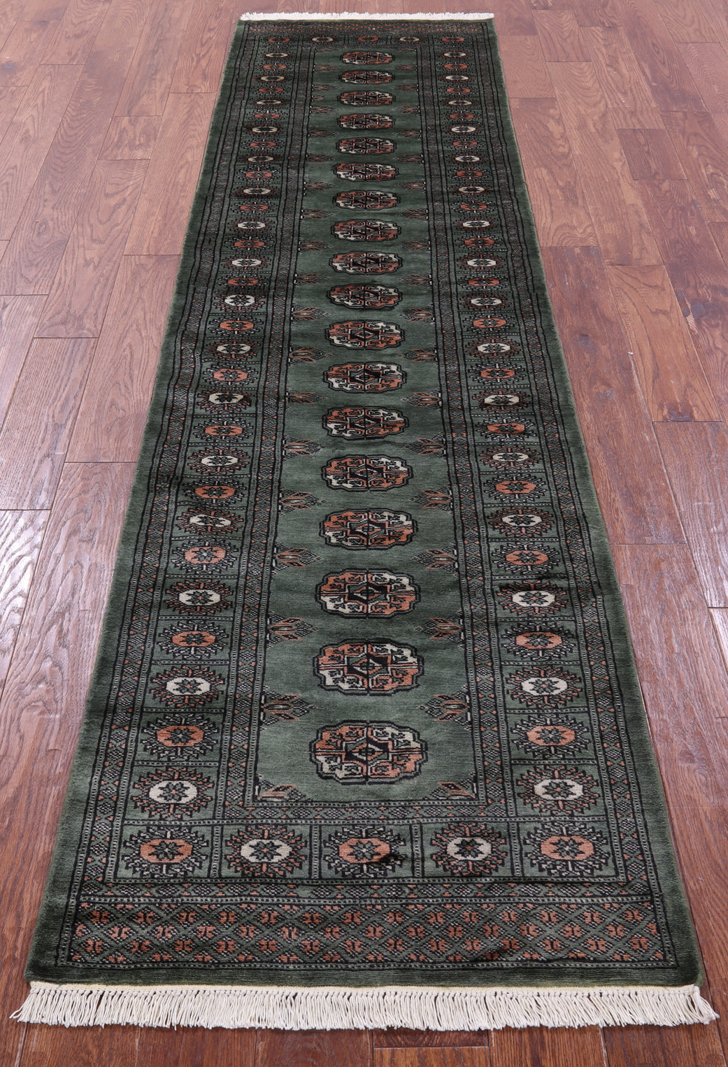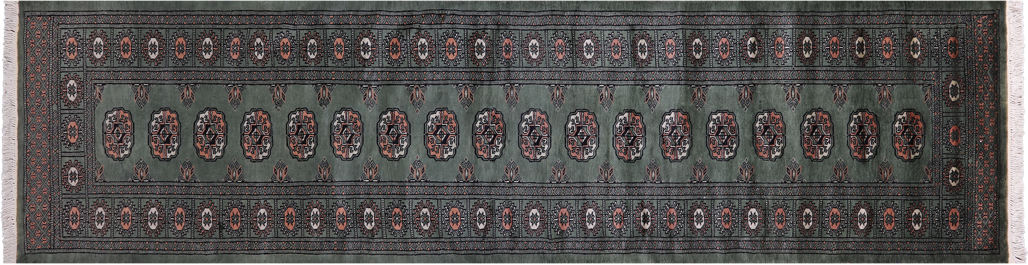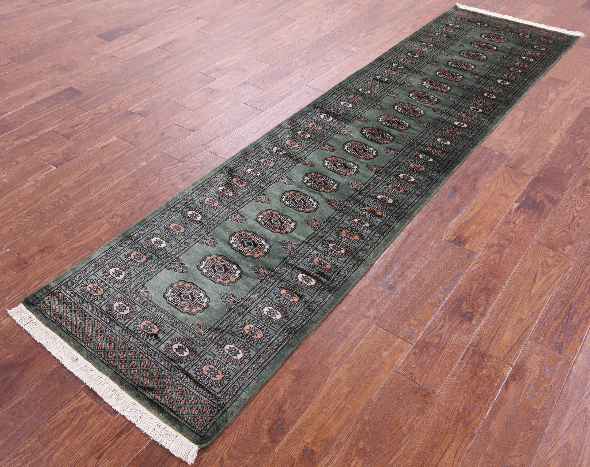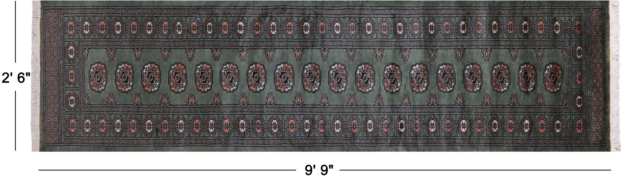 Green Silky Bokhara Hand-Knotted Wool Runner Rug 2' 6" X 9' 9" - Q23792 is backordered and will ship as soon as it is back in stock.