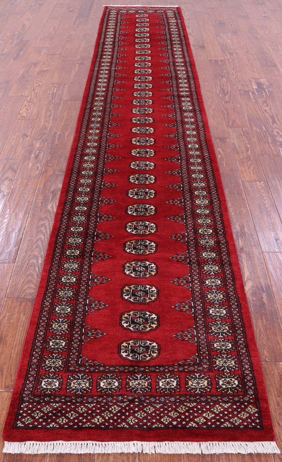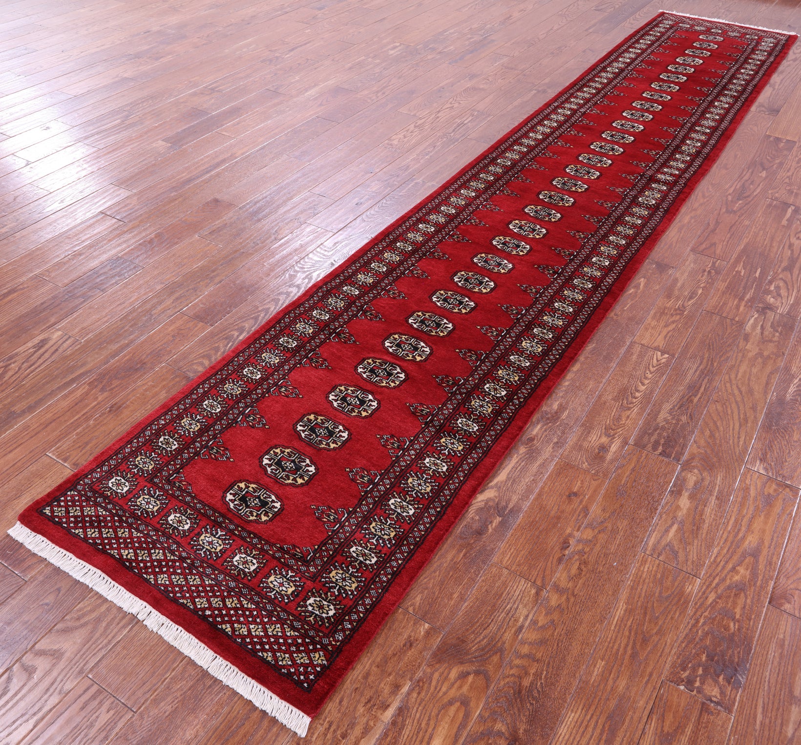 Red 2' 6" X 13' 9" Runner Silky Bokhara Hand-Knotted Wool Rug - Q23891 is backordered and will ship as soon as it is back in stock.