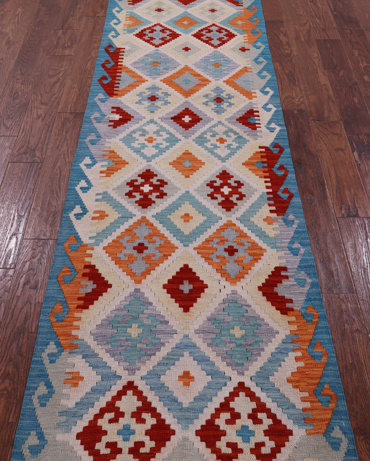 A kilim rug is a flat-woven rug. Kilim rugs are known for their intricate geometric patterns, vibrant colors, and durable construction. Unlike traditional pile rugs, kilims have a smooth surface with no pile, making them lightweight and versatile. They are often used as decorative pieces, floor coverings, or wall hangings, reflecting the cultural heritage and artistic expression of the regions they originate from.