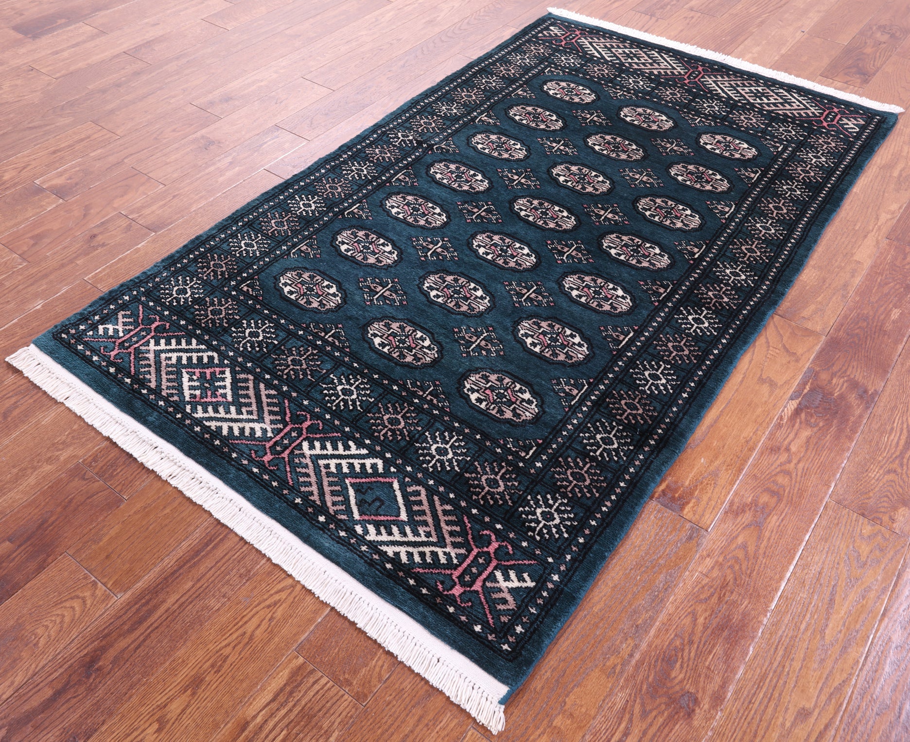 Green Silky Bokhara Hand-Knotted Wool Rug 3' 7" X 5' 8" - Q23716 is backordered and will ship as soon as it is back in stock.