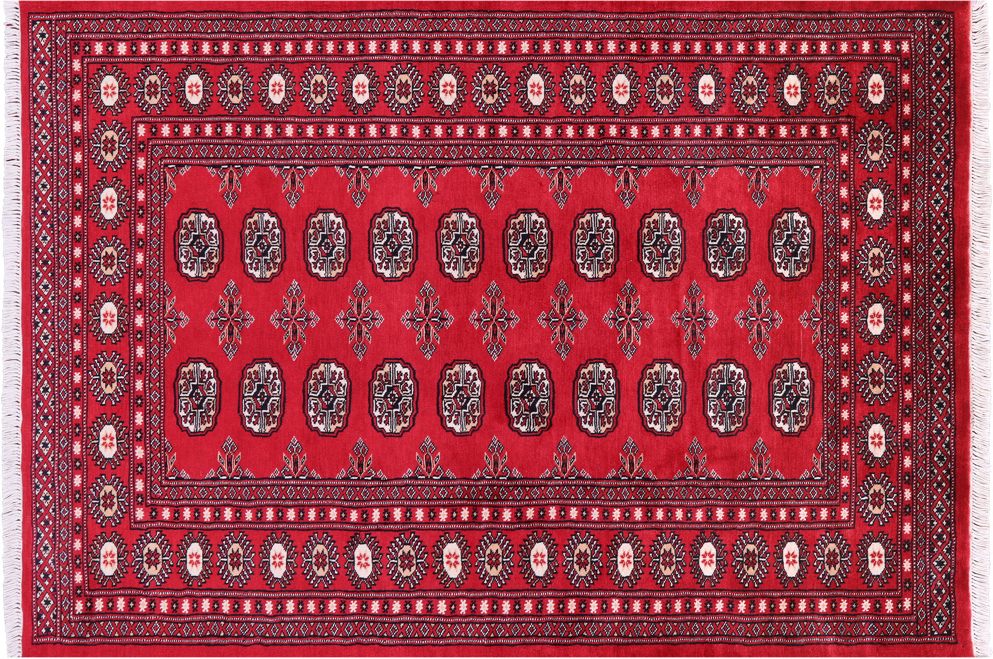 Bokharas are a type of handmade Pakistani rug; also known as Bukharas or Bokaras. Most are based on Turkmen prototypes called Tekkes. Pakistani Bokhara rugs are among the most popular handmade rugs in the world. They are popular for their soft, luxurious feel, heavy pile, attractive colors and appearance that consist of repeating octagonal figures called guls, usually on fields of burgundy red, gray blue, or sometimes green.