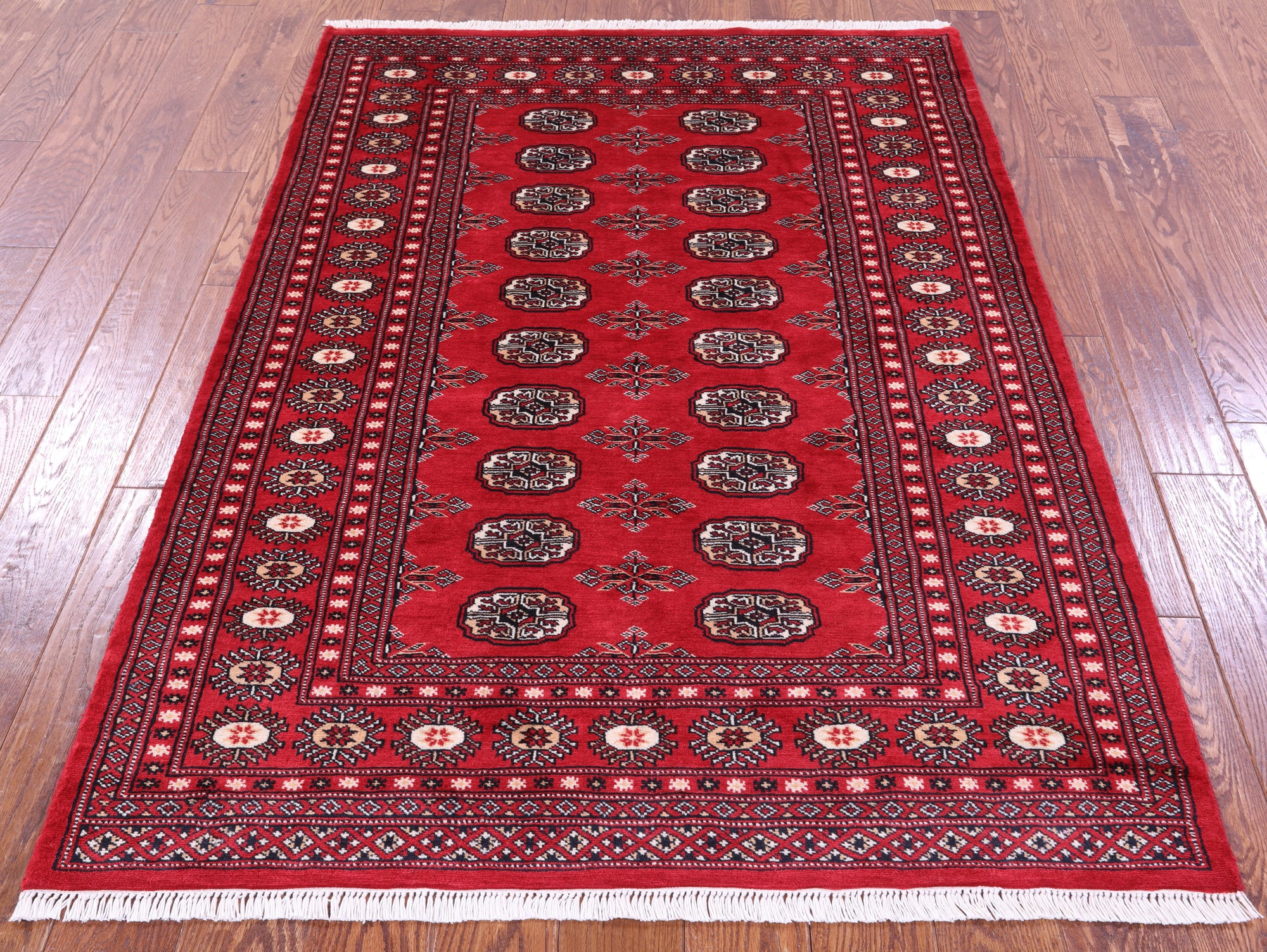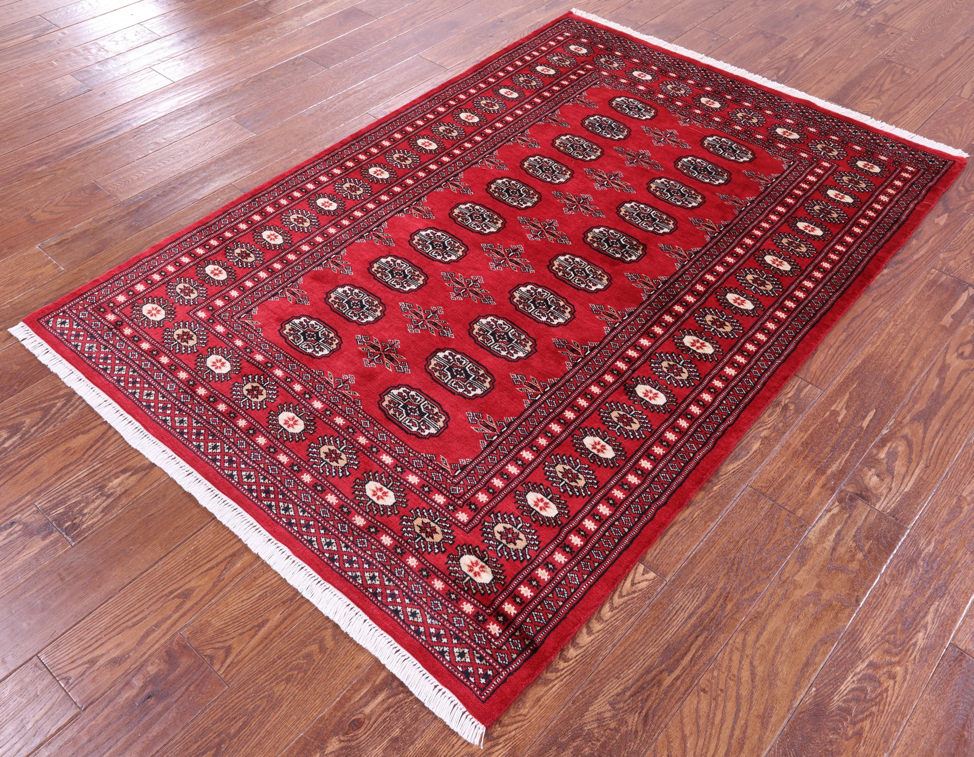 Red Silky Bokhara Hand-Knotted Wool Rug 4' 2" X 6' 0" - Q23863 is backordered and will ship as soon as it is back in stock.