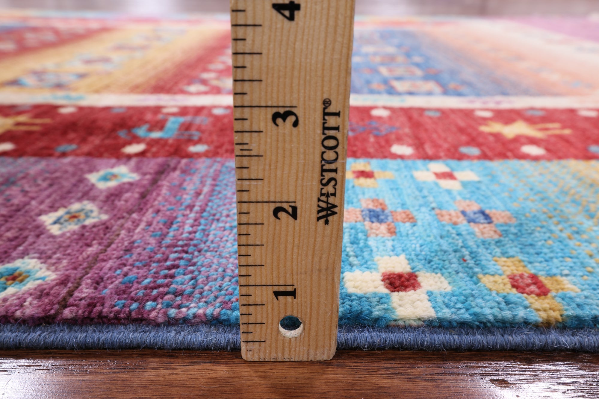 Gabbeh rugs are hand-spun wool in both the pile and the foundation, as well as all natural dyes. Simple, colorful geometric patterns, abstract scenery, child-like representations of people and animals, different colors, reds, blue, greens ,yellow, purple. Modern technology has improved the dye process to allow a wider range of colors as well as more stable and easier to care for colors.