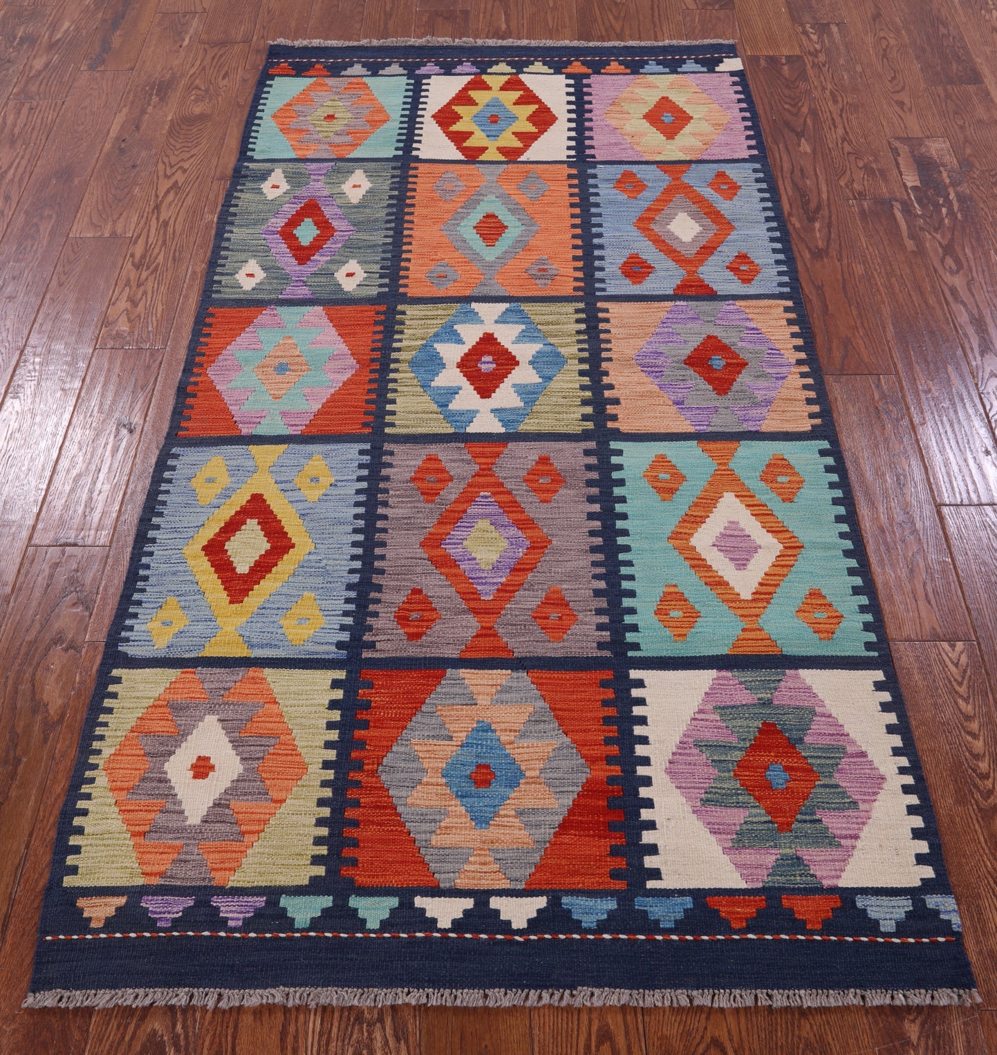 Wool On Wool Kilim Flat Weave Reversible Rug 3' 7" X 6' 9" - Q17858 is backordered and will ship as soon as it is back in stock.