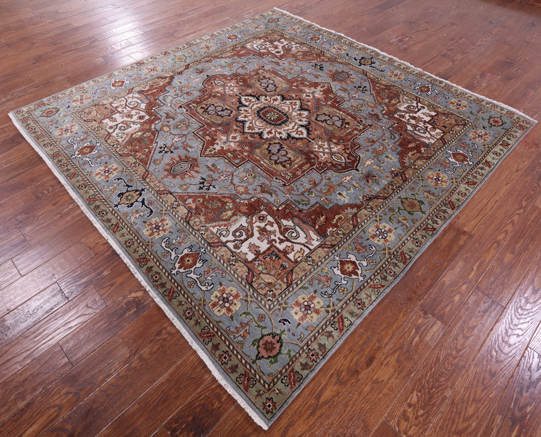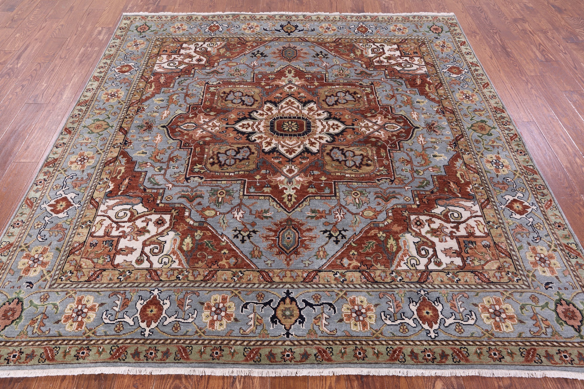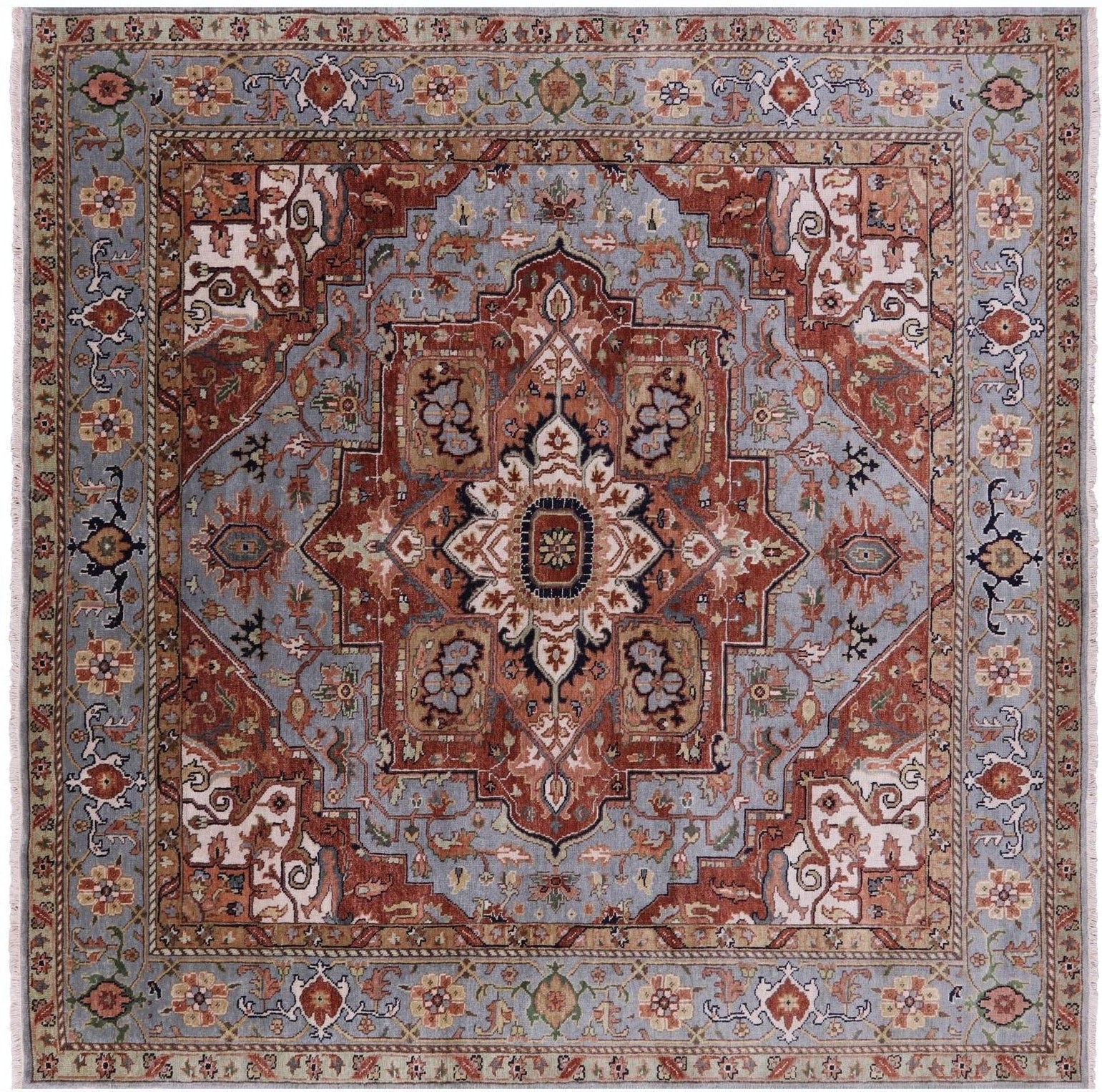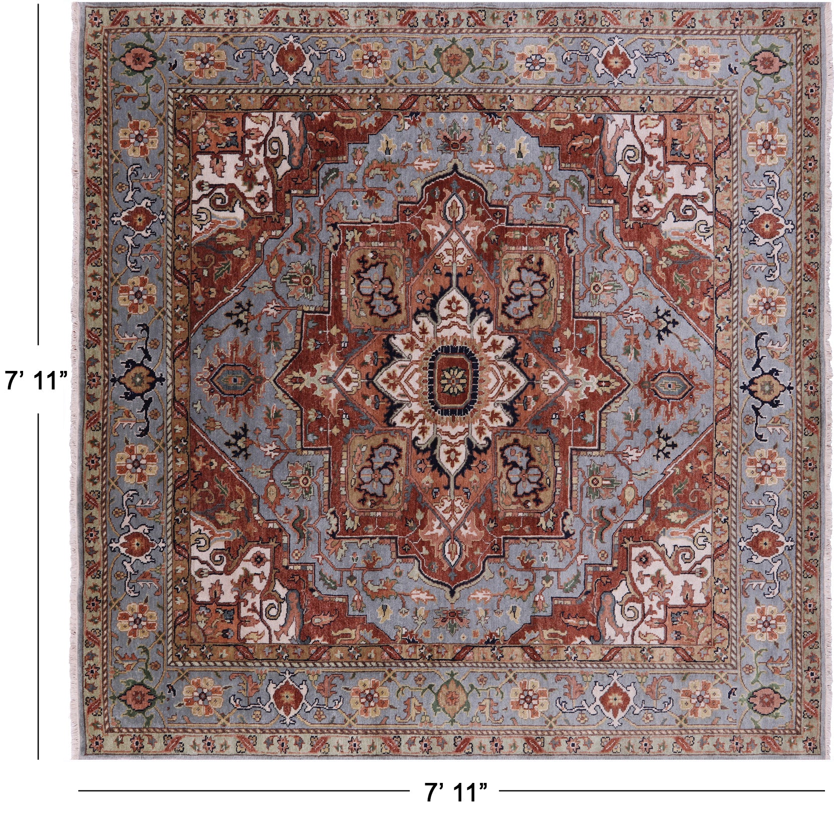 Blue 8' Square Handmade Heriz Serapi Wool Rug - Q19682
