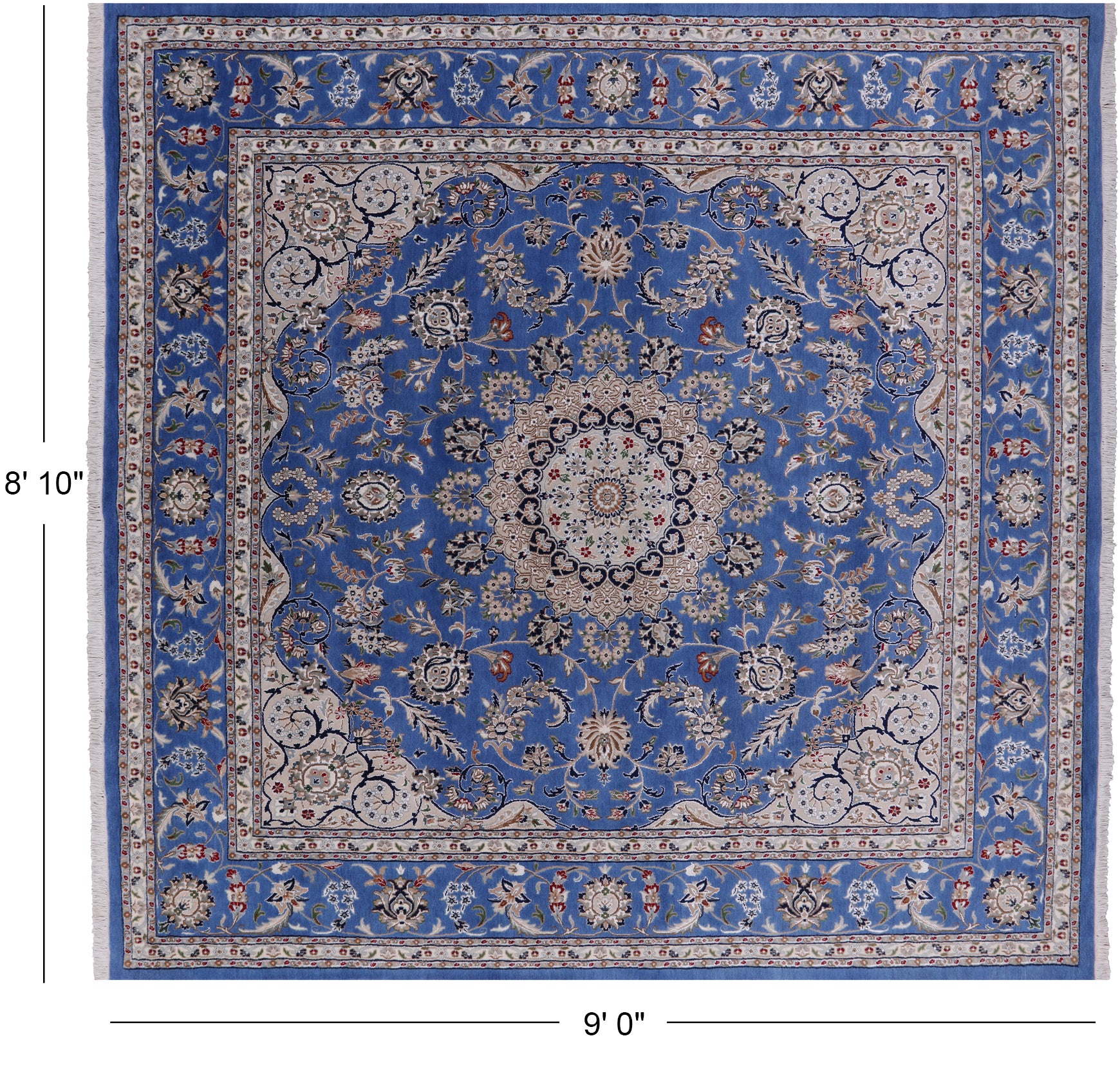 Blue 9' Square Wool & Silk Persian Nain Hand-Knotted Rug - Q6140