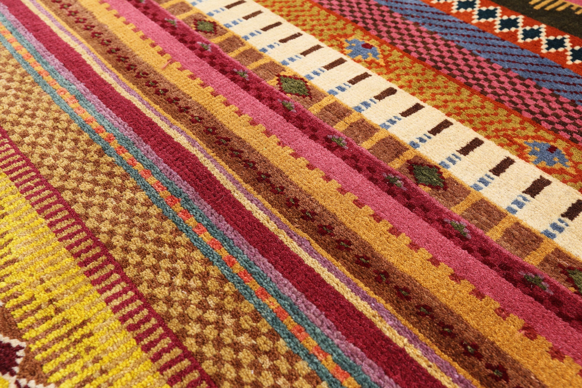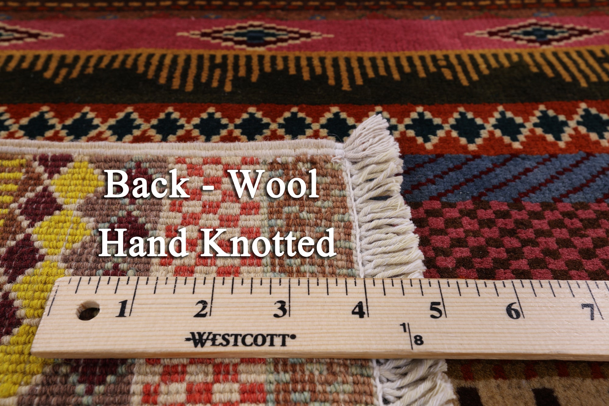 Gabbeh rugs are hand knotted to reflect tribal and other patterns such as solids, and nomadic designs. The simplistic "child-like" bold designs of Gabbeh rugs is what makes them perfectly suitable for any decor. Gabbeh rugs are made from high-quality wool and have a high density of knots. Gabbeh rugs are hand-knotted and eco-friendly, because only natural dyes are used in their production.