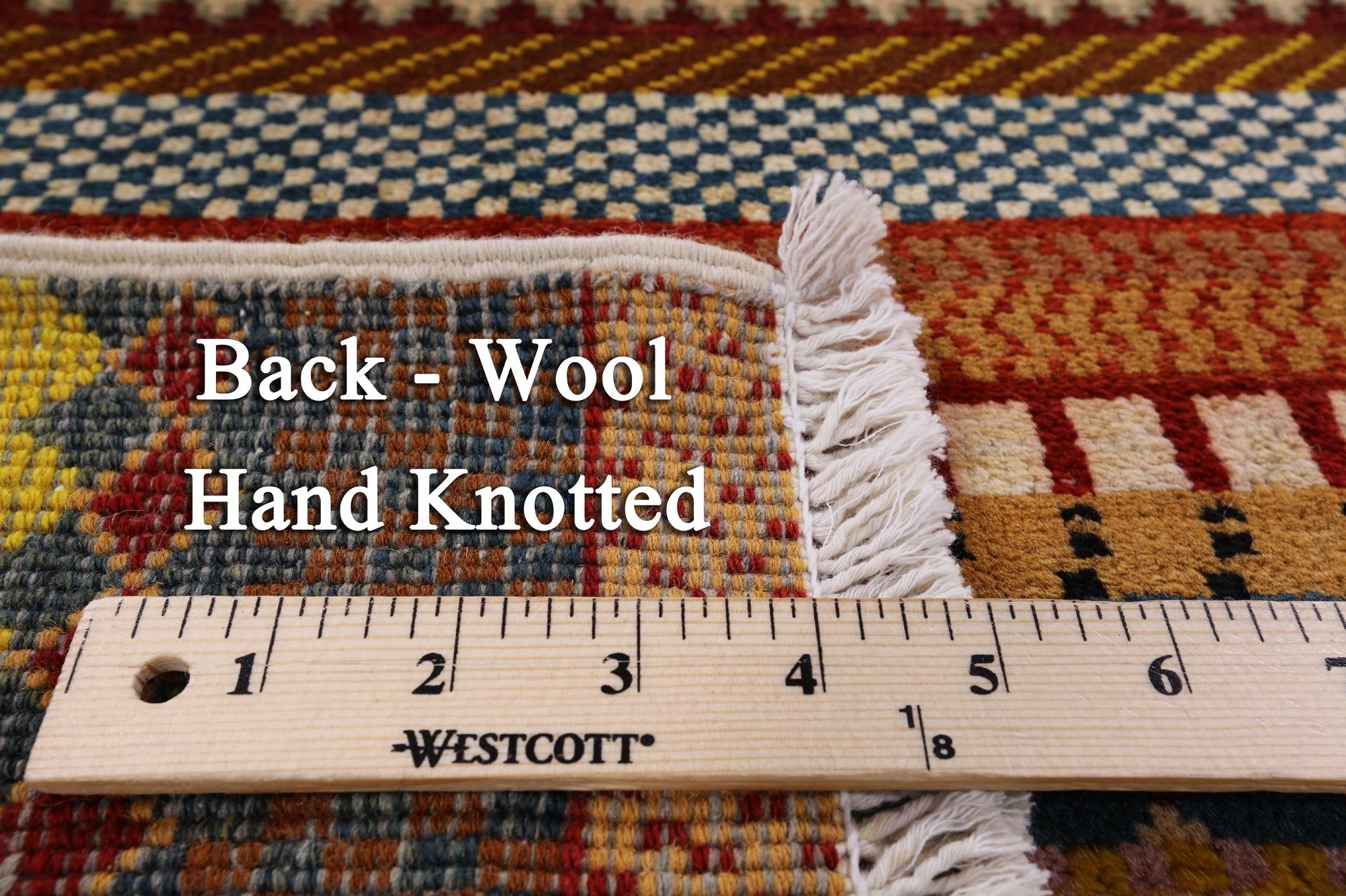 Gabbeh rugs are hand knotted to reflect tribal and other patterns such as solids, and nomadic designs. The simplistic "child-like" bold designs of Gabbeh rugs is what makes them perfectly suitable for any decor. Gabbeh rugs are made from high-quality wool and have a high density of knots. Gabbeh rugs are hand-knotted and eco-friendly, because only natural dyes are used in their production.