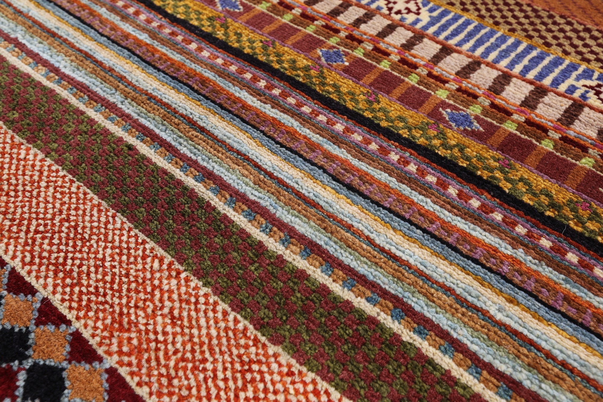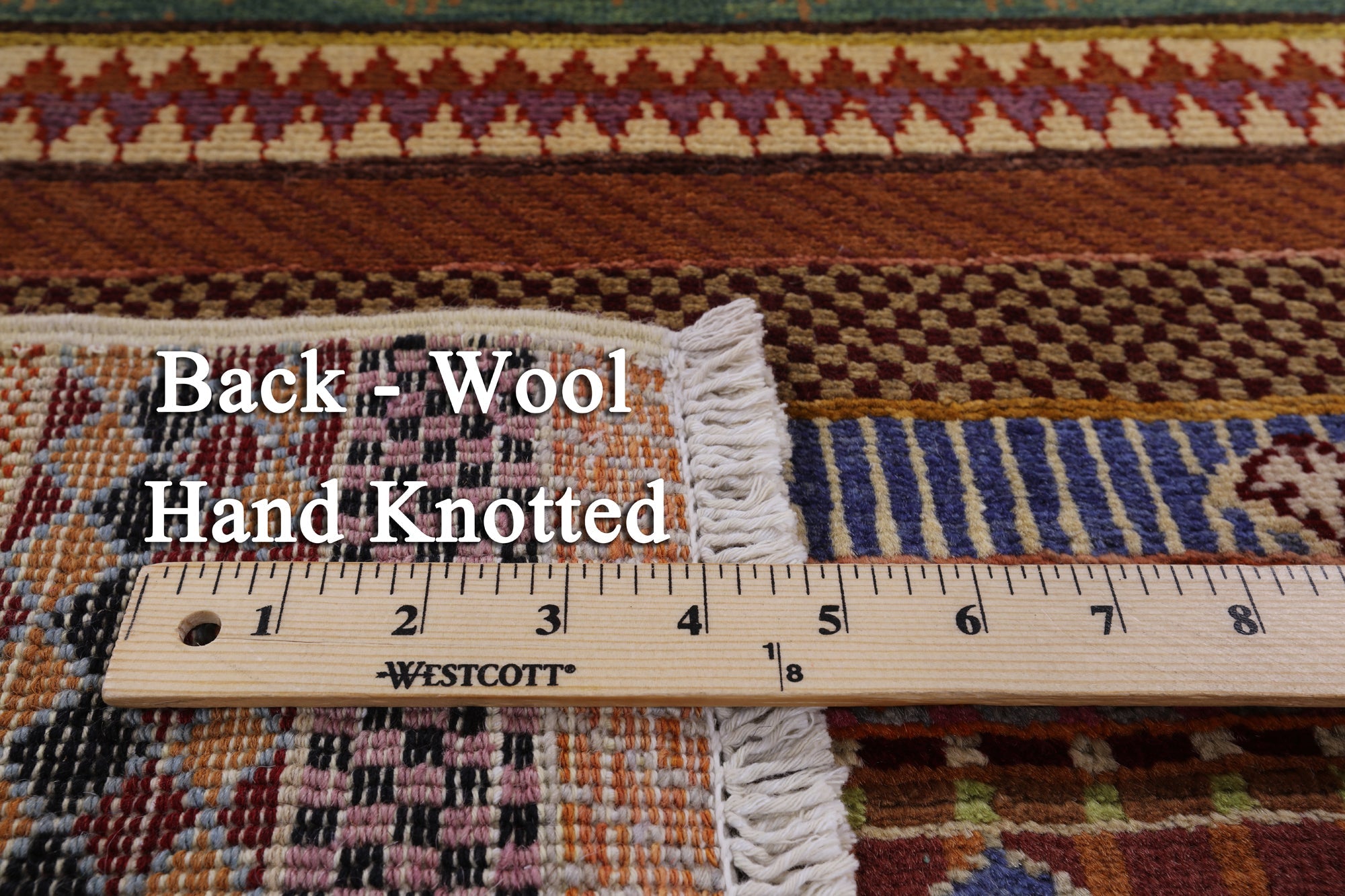 Gabbeh rugs are hand knotted to reflect tribal and other patterns such as solids, and nomadic designs. The simplistic "child-like" bold designs of Gabbeh rugs is what makes them perfectly suitable for any decor. Gabbeh rugs are made from high-quality wool and have a high density of knots. Gabbeh rugs are hand-knotted and eco-friendly, because only natural dyes are used in their production.