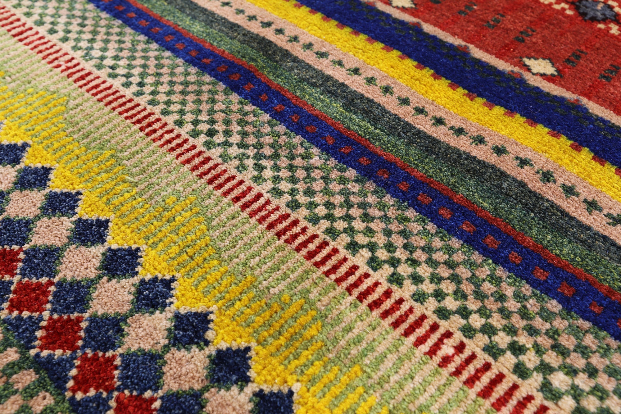 Gabbeh rugs are hand knotted to reflect tribal and other patterns such as solids, and nomadic designs. The simplistic "child-like" bold designs of Gabbeh rugs is what makes them perfectly suitable for any decor. Gabbeh rugs are made from high-quality wool and have a high density of knots. Gabbeh rugs are hand-knotted and eco-friendly, because only natural dyes are used in their production.